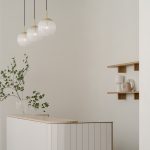 水吧区大理石的高雅黑和古朴的原木色相碰撞,时尚酷炫之余又多了一份沉稳。后现代简约的几何小灯具个性又极具创意,三件灯具自天花板垂落以达到垂直几何的视觉效果。