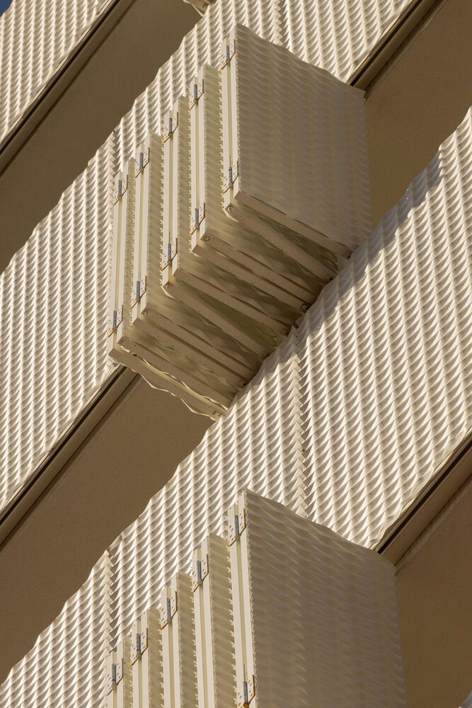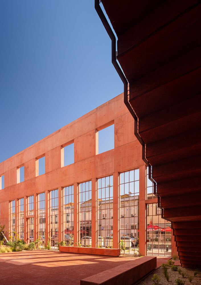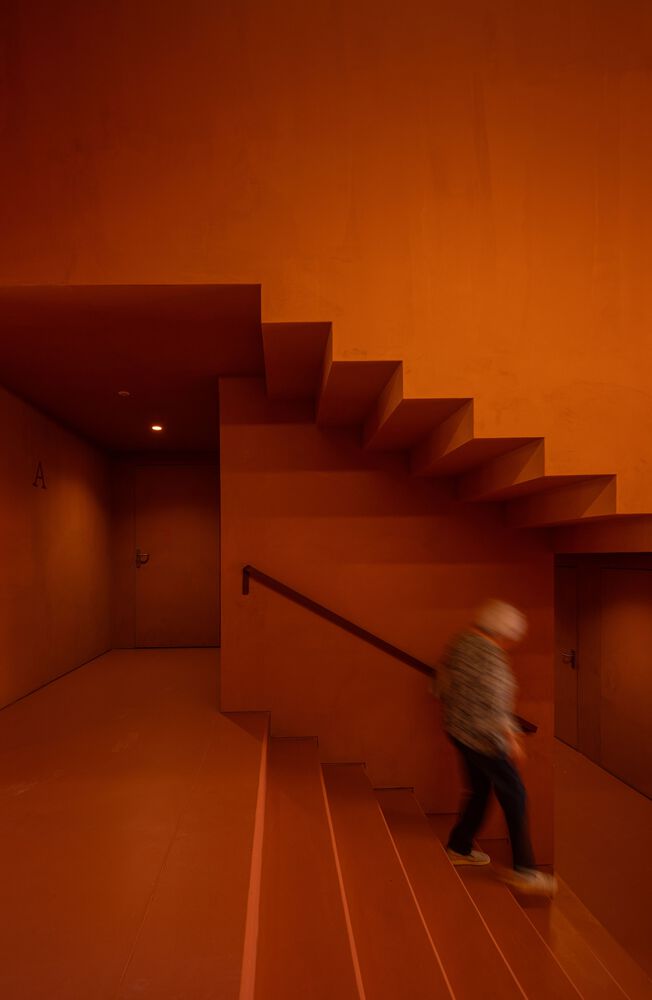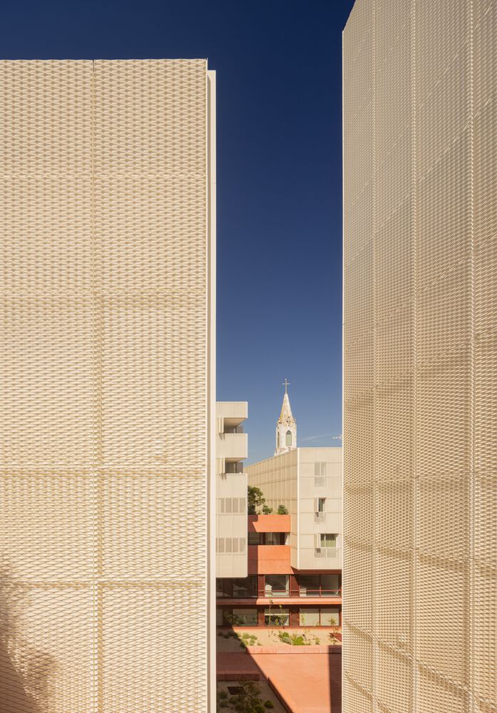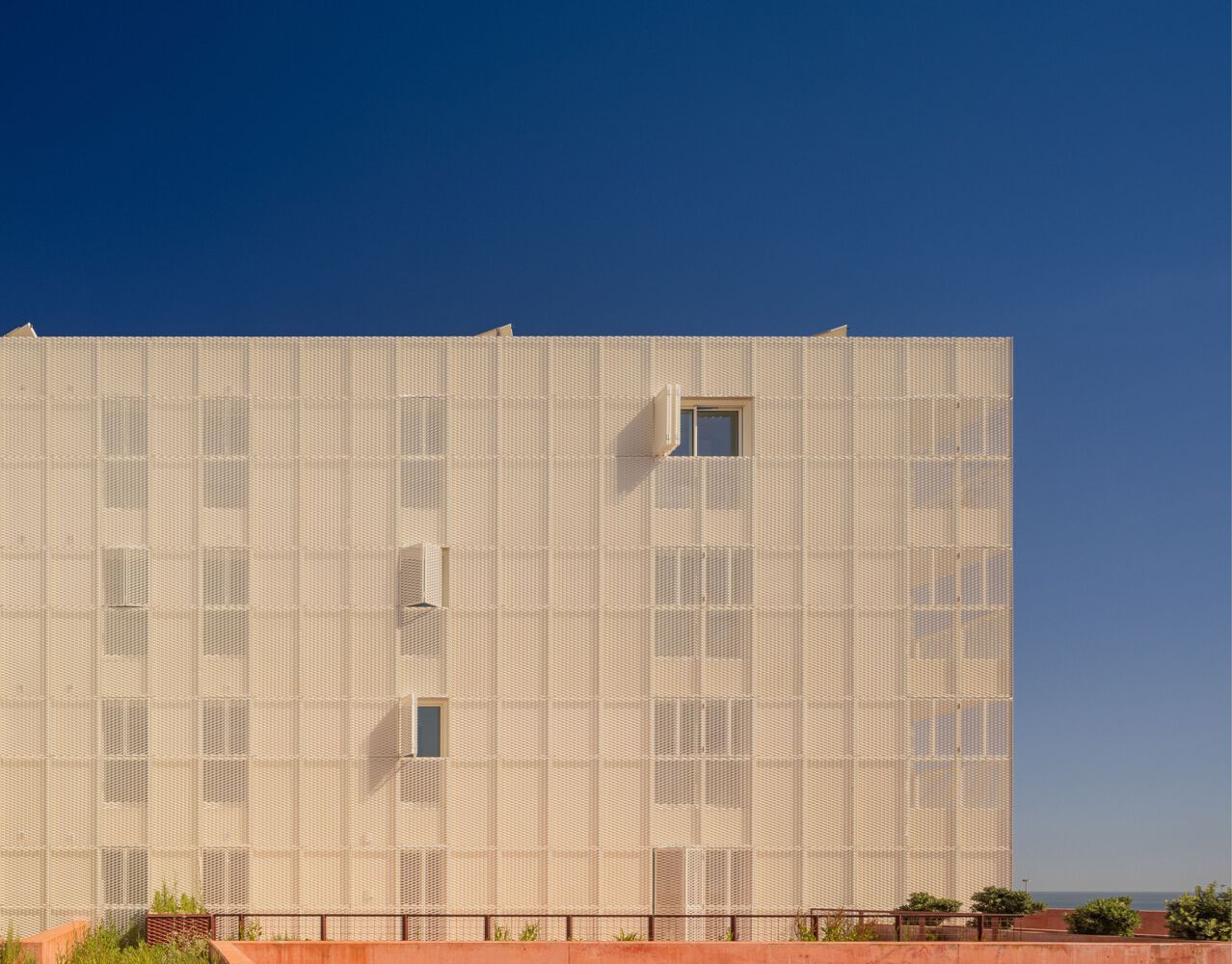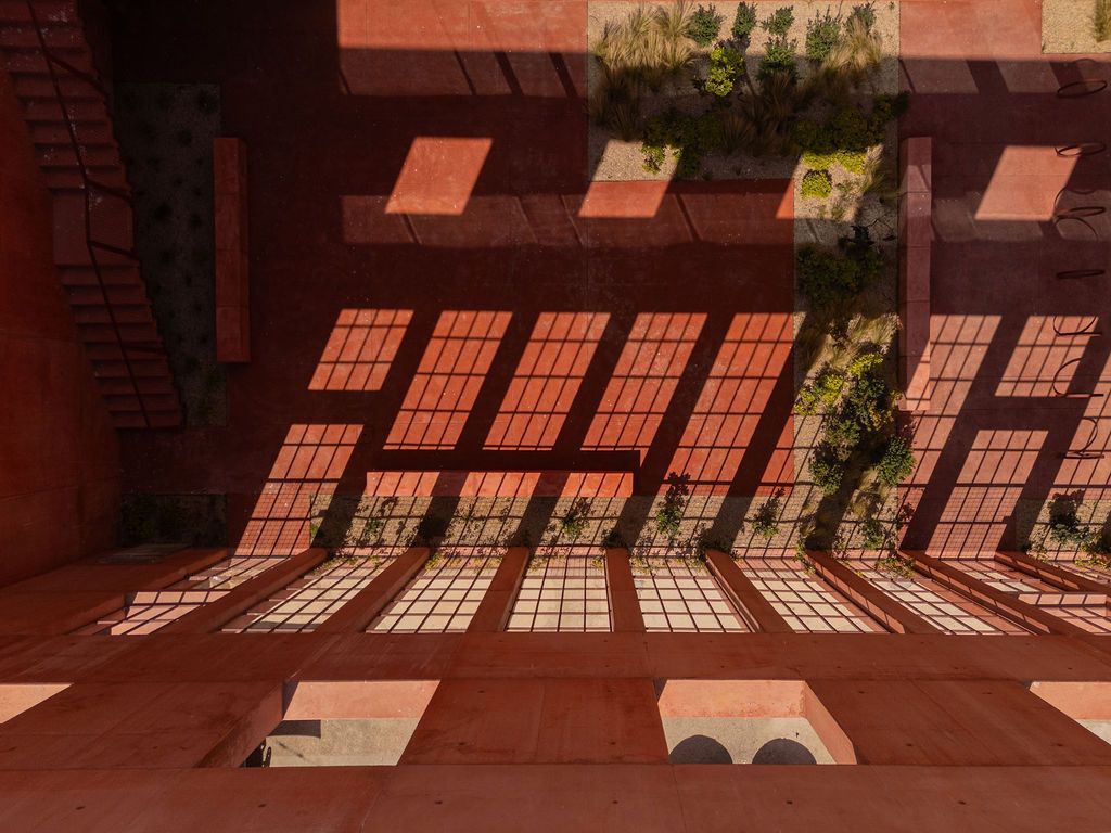 商业和服务设施位于底层,一层为办公区域,顶层则是住宅区。通过使用不同密度的材料 —— 着色混凝土和拉伸铝板,使不同时代的元素在形式上融为一体,形成新旧对话。原有厚重的建筑体量与庭院上方轻盈悬浮的建筑形成对比,这些高耸且独具特色的建筑体量所采用的材质灵感源自其靠近海洋的地理位置。