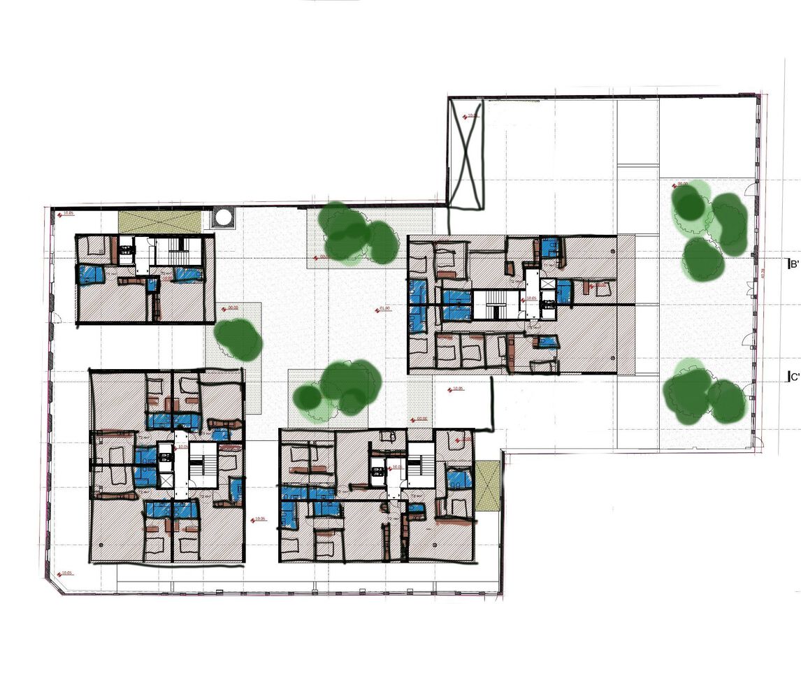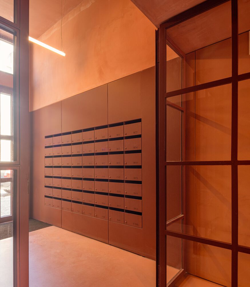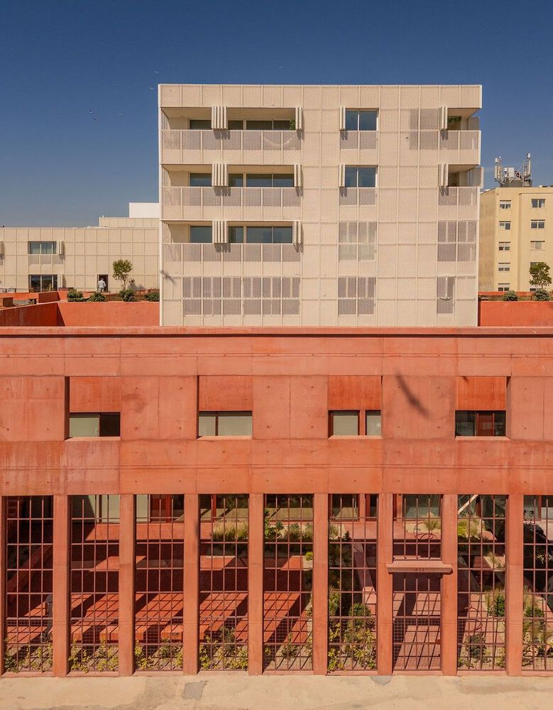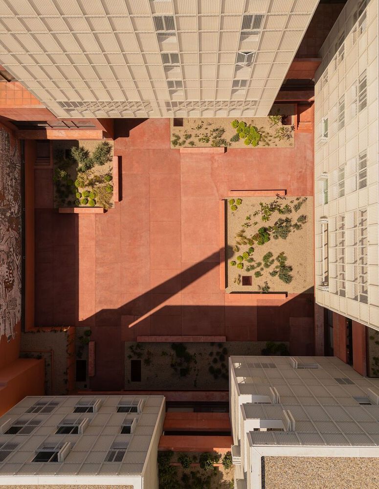 由于现有建筑几乎占据了整个地块,设计对场地内部进行了开放处理,打造出绿色通透的区域,将光线引入室内空间,并促进街区内部的流通。这些空间使不同功能区域之间形成视觉联系,同时提供了通往上层的通道。在这座多功能城市中,一个个紧凑的空间节点应运而生。在住宅区入口处,有一个接待区通向内部庭院,该庭院连接着其他建筑体量和公共区域。