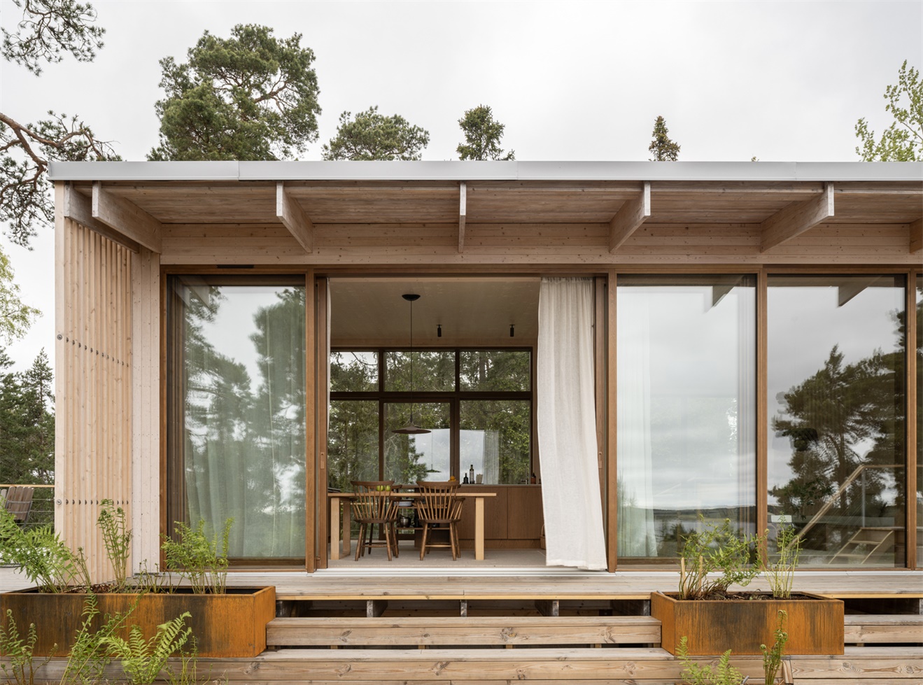 Vy 北欧风海边住宅设计坐落于微风拂过的松树与裸露的花岗岩地貌之间,是为斯德哥尔摩群岛壮丽景致量身打造的精心之作。该住宅由建筑师艾达・廷宁(Ida Tinning)设计,力求在开阔感与庇护感之间找到平衡,为北欧小屋建筑风格赋予了当代诠释。“Vy” 一词在瑞典语中意为 “景致”,这一命名精准呼应了项目的核心理念:以建筑为框,凸显周边景观的体验感与无与伦比的视野价值。