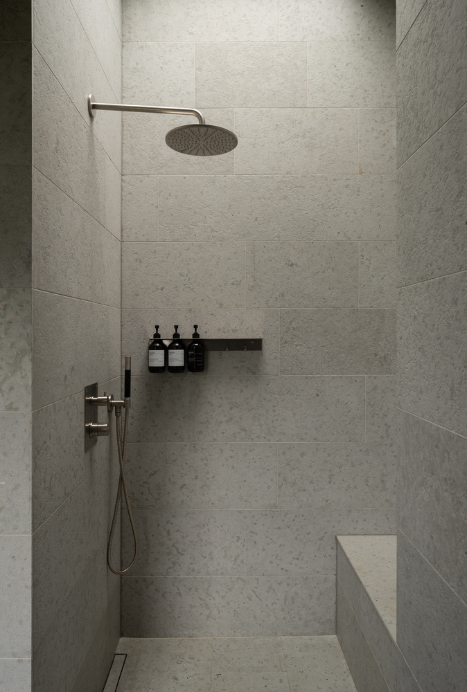 室内空间营造出静谧且富有触感的氛围。浅色木材表面、柔和的灰色石灰岩以及精致的细节设计,让光线能在空间中自由流动,与自然保持紧密对话。浴室采用通体石材饰面,配备嵌入式长椅与顶置雨淋式花洒,成为一处私密的休憩庇护所。