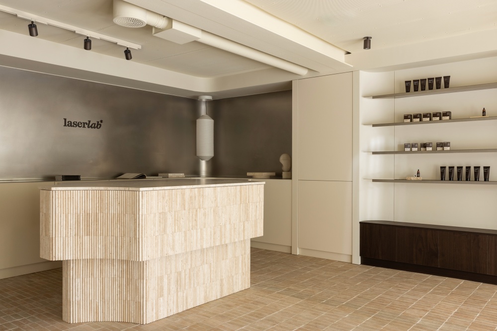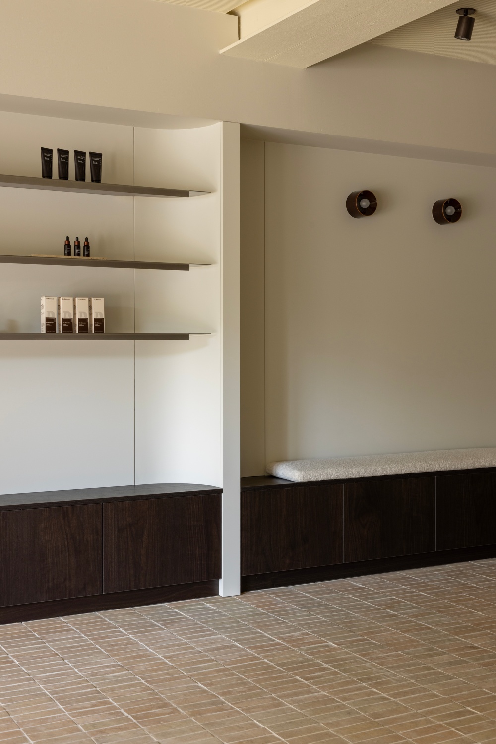 HHVN最具突破性的设计,在于对“开放理念”的贯穿践行。诊所临街而立,窗外的生机街景成为空间的天然延伸,而接待区被创造性地打造为“开放式体验展厅”,彻底打破了传统诊所“入口即屏障”的设计逻辑。这里既陈列着诊所的护肤产品,又以一体化休憩座椅与流畅布局,构建出“从街道到室内的柔和过渡”,吸引往来行人自然步入,让诊所从“社区中的孤岛”转变为“邻里间的友善节点”。这种开放并非对“私密性”的牺牲,而是对“体验节奏”的精准把控。设计团队通过“空间递进”实现了“开放与私密的平衡”:入口的开放展厅承担着“情绪缓冲”功能,让客人在融入社区氛围的过程中卸下防备;向内延伸,功能区域则根据“私密性需求”逐步过渡——产品陈列区相对开放,诊疗室则保持独立私密,这种“由外至内的隐私升级”,既满足了医美服务的专业需求,又避免了一进门就陷入封闭空间的压抑感。