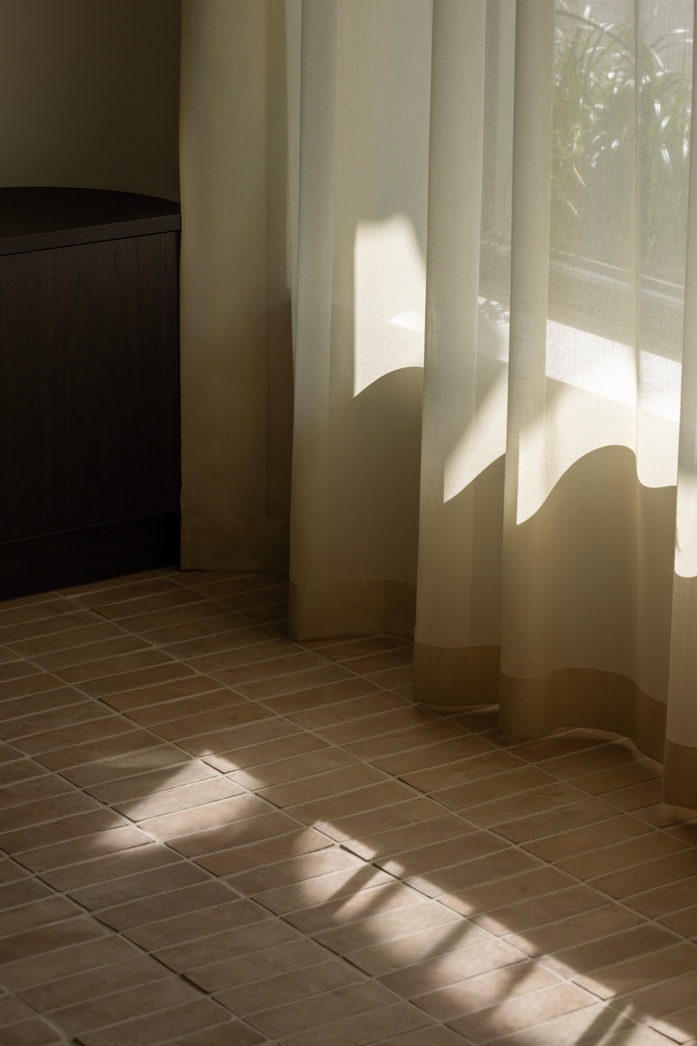 HHVN的室内气质,源自对“崇尚和谐与平衡的韩式护肤理念”的深度转译。设计团队没有复刻韩式风格的符号化元素,而是提取其“温和、自然、循序渐进”的核心精神,转化为空间的材质与色调语言,助力客人舒缓心绪、沉静放松。材质的组合构建了空间的温润基底:赤陶质感饰面带着自然的粗粝温度,呼应韩式护肤中“亲近自然”的理念;天然石材的细腻肌理与实木板材的温润触感形成互补,中和了医美科技可能带来的冰冷感;柔和反光的金属构件则以精致线条点缀其间,为空间注入现代设计的利落感。这些材质共同构筑的基底,奠定了空间“沉稳自然”的基调,让科技与自然在此达成和谐。色彩与光线的运用进一步强化了疗愈氛围。低饱和度的色调贯穿全场,避免了高饱和色带来的视觉刺激;自然光透过临街窗户漫入室内,与室内柔和的人工照明形成层次,在墙面与地面投射出温润光影。这种“自然光与低饱和色的交融”,既烘托出宁静祥和的氛围,又在“现代设计的精致利落”与“康养体验的内敛静谧”之间,找到了恰到好处的平衡点。