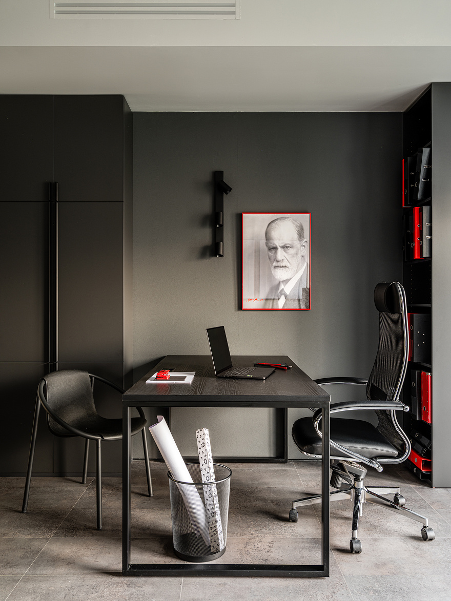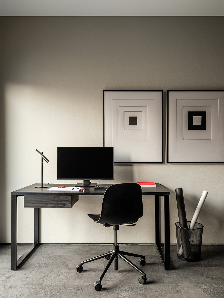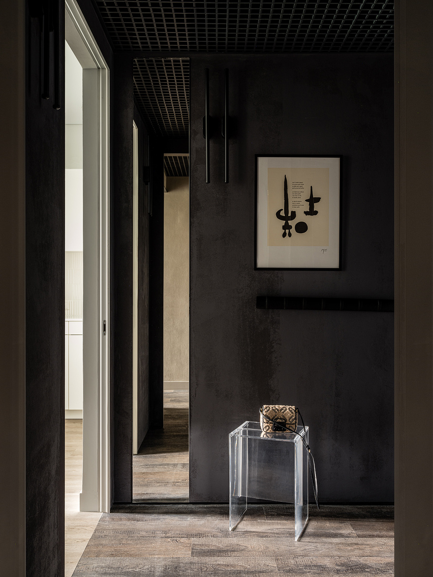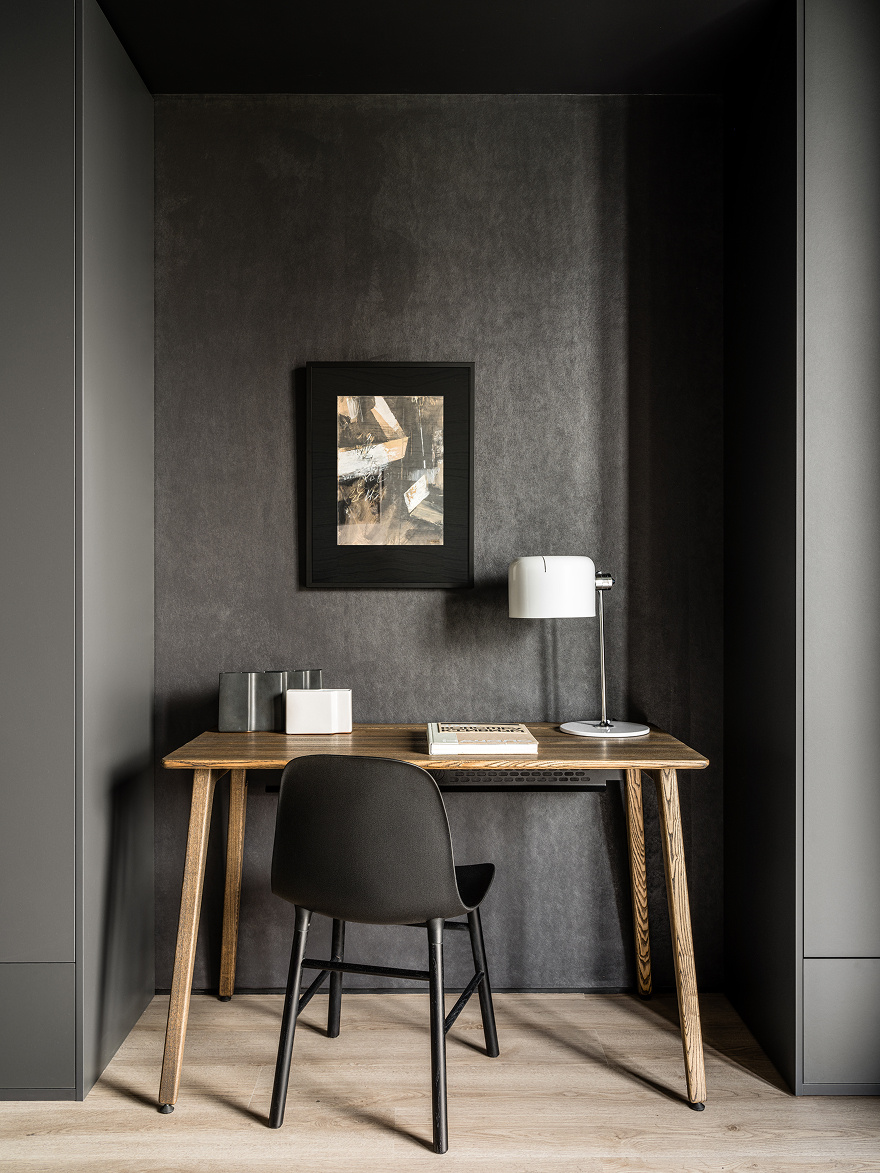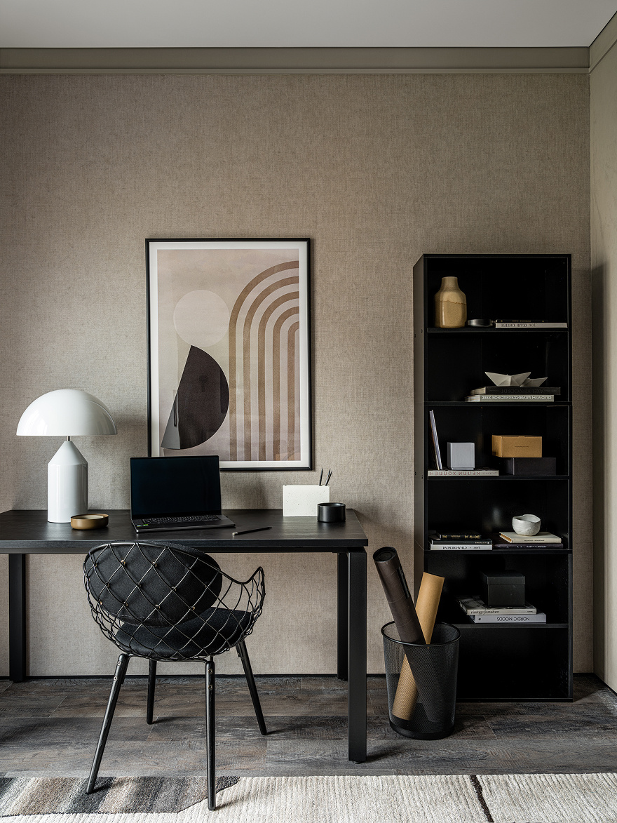 整个空间以黑白灰为基础色调,构建出极具辨识度的视觉系统,这种色彩选择既呼应了工程技术行业的“理性严谨”,又为艺术装置的介入预留了充足空间。​色彩的运用遵循“功能适配”原则:办公区的深灰墙面营造专注氛围,居住区的米灰布艺传递温暖情绪,卫浴间的深蓝瓷砖则增添了空间的层次感与私密性。黑白灰的谱系在不同空间中延伸出丰富的情绪层次,避免了单色运用可能带来的沉闷,实现了“色彩服务于功能场景”的设计目标。​