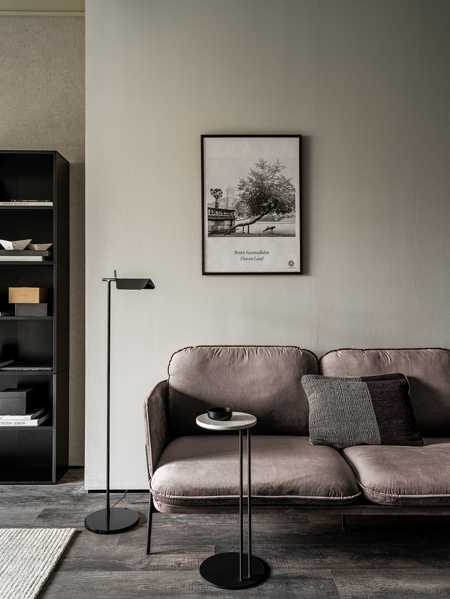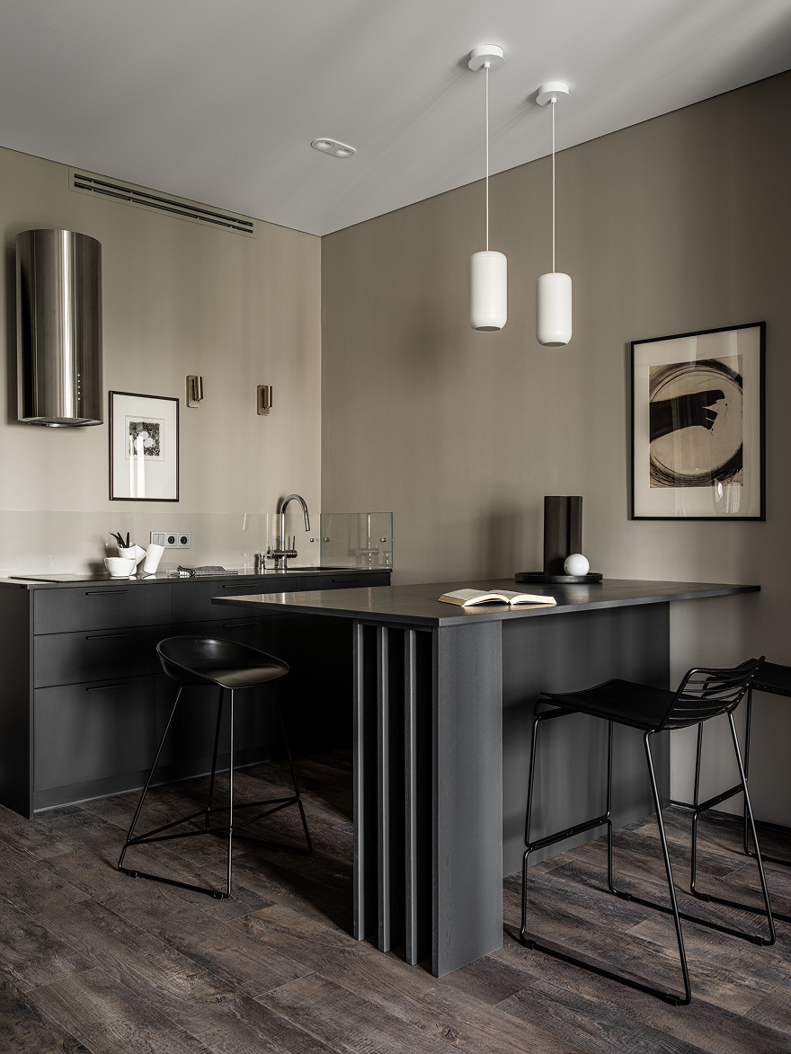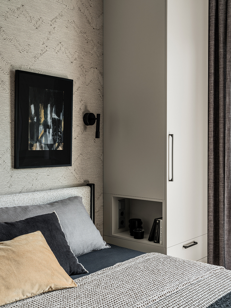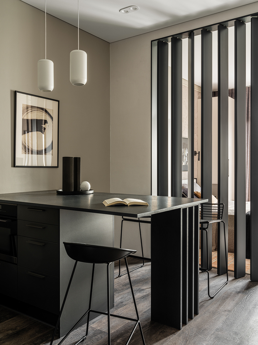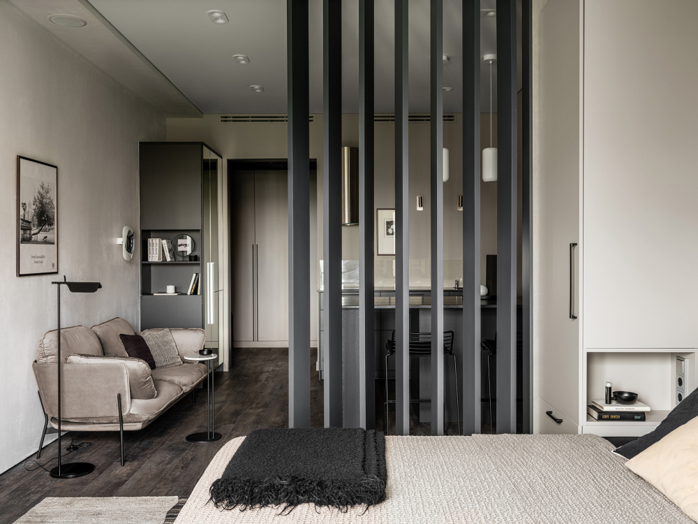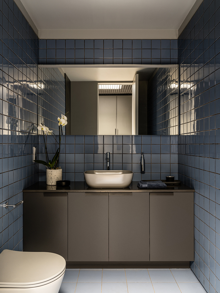 整个空间以黑白灰为基础色调,构建出极具辨识度的视觉系统,这种色彩选择既呼应了工程技术行业的“理性严谨”,又为艺术装置的介入预留了充足空间。​色彩的运用遵循“功能适配”原则:办公区的深灰墙面营造专注氛围,居住区的米灰布艺传递温暖情绪,卫浴间的深蓝瓷砖则增添了空间的层次感与私密性。黑白灰的谱系在不同空间中延伸出丰富的情绪层次,避免了单色运用可能带来的沉闷,实现了“色彩服务于功能场景”的设计目标。​