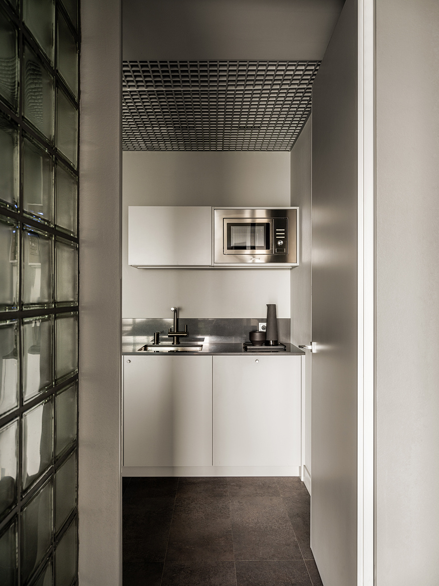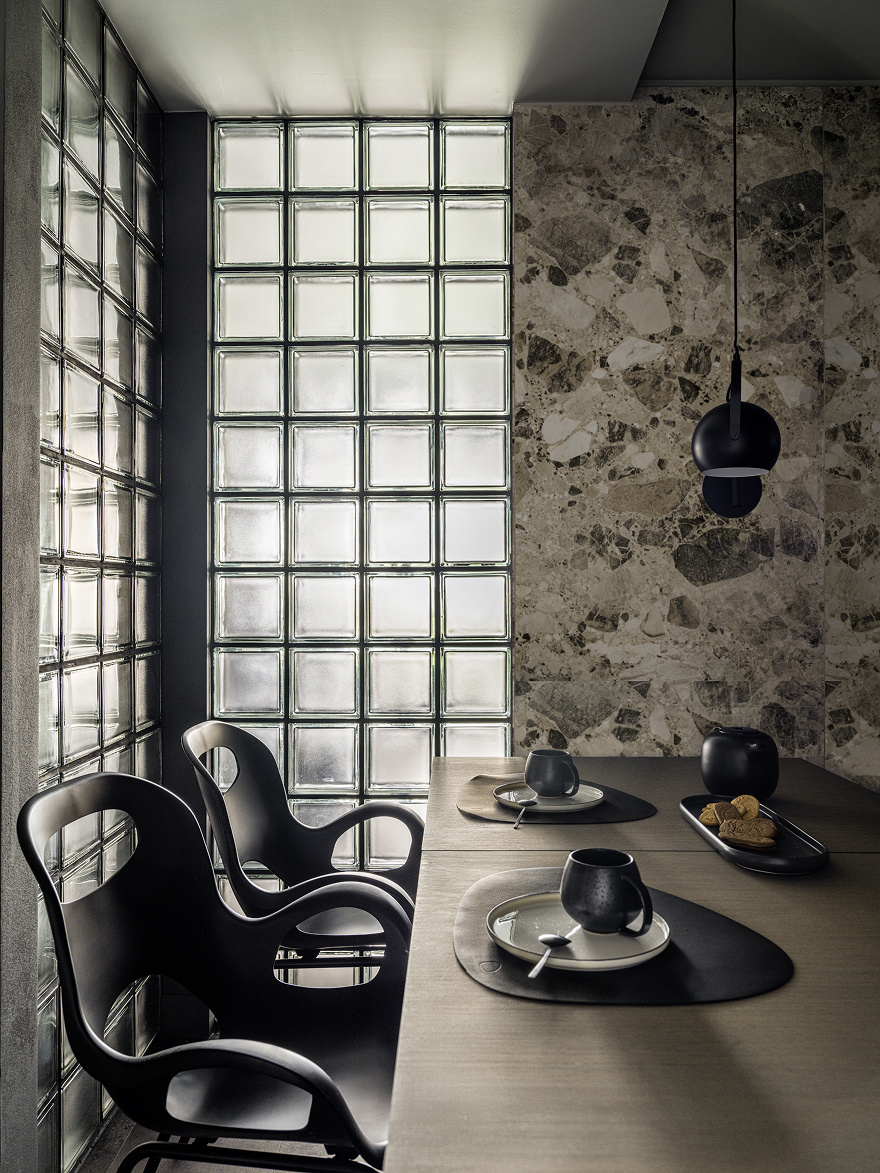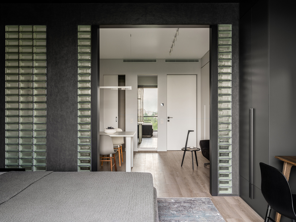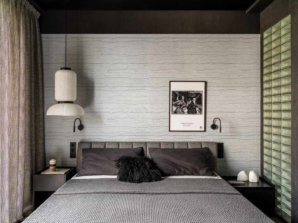 居住区的材质则转向“情绪赋能”:大理石墙面的细腻纹理、布艺沙发的柔软触感,为空间注入“家的温度”;卫浴间的艺术瓷砖以独特的肌理与色彩,打破了传统卫浴空间的单调,让日常洗漱场景也成为一种美学体验。​玻璃砖墙作为贯穿两个空间的“材质线索”,起到了至关重要的衔接作用。它在办公区保障隐私与采光,在居住区增强空间通透感,其通透的几何形态成为整个建筑的视觉焦点,让工业风的粗犷与精致材质的细腻形成对话,最终达成“刚柔并济”的空间气质。