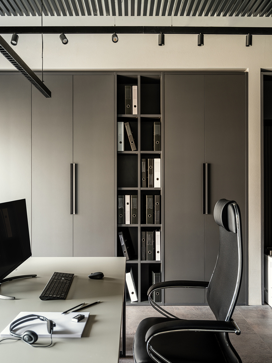 材质的选择与搭配,是奥尔加・季先科传递空间叙事的核心语言。她以企业“道路工程”的工业基因为起点,引入混凝土、金属等工业材质,同时以大理石、布艺等精致材质进行平衡,让“工业硬核”与“生活温情”在碰撞中达成和谐。​办公区的材质运用极具“在地性表达”:混凝土质感的地面,暗合道路工程的“基建属性”,传递出专业、可靠的视觉感受;金属网格吊顶则在功能上实现了管线的隐藏与空间的挑高感,在美学上强化了工业风的秩序感。这种材质选择并非单纯的风格复刻,而是对企业业务属性的空间转译。​