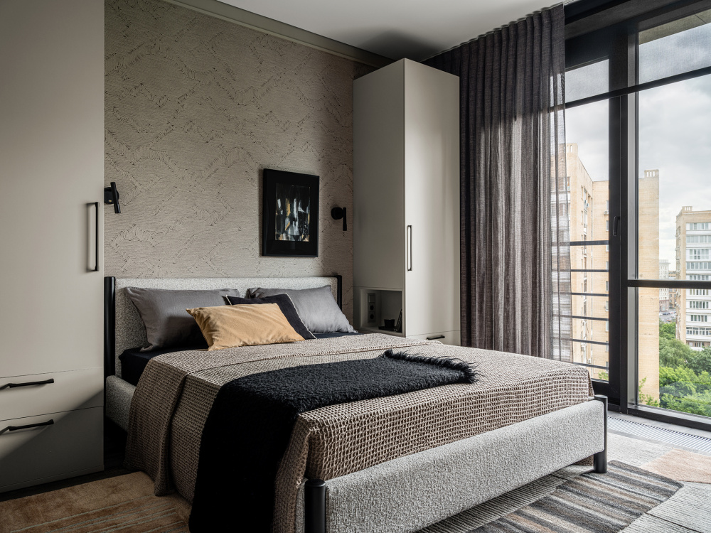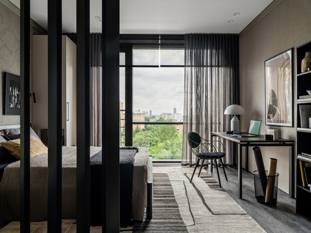 与办公区的理性形成鲜明对比,居住区以“温暖松弛”为核心气质,为员工营造“家”的归属感。卧室空间采用质感布艺墙面,搭配柔软的温馨床品,从触觉与视觉双重维度构建休憩场景;大面积的落地窗彻底打破室内外的物理边界,让自然光线成为空间的“天然装饰”,清晨的阳光与傍晚的余晖,为卧室赋予了随时间变化的动态美学。​值得称道的是独立书房的设计,它成为“办公与居住”的过渡地带——延续了办公区的极简风格,金属网格椅、几何艺术画与功能书架的组合,让工作场景能够在居住空间中自然延伸,员工无需在“办公状态”与“生活状态”之间进行生硬切换,实现了“碎片化工作需求”与“完整生活体验”的无缝衔接。