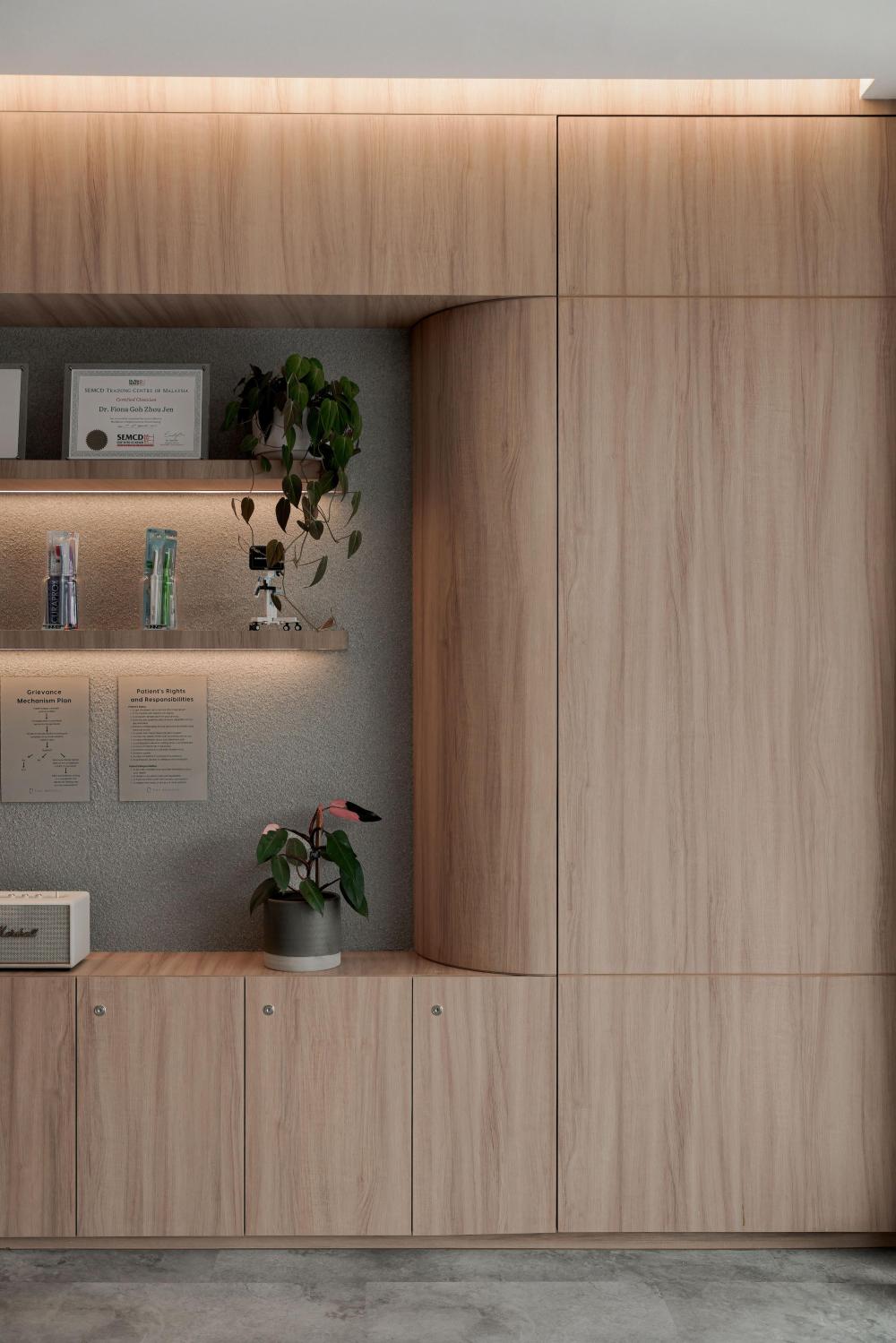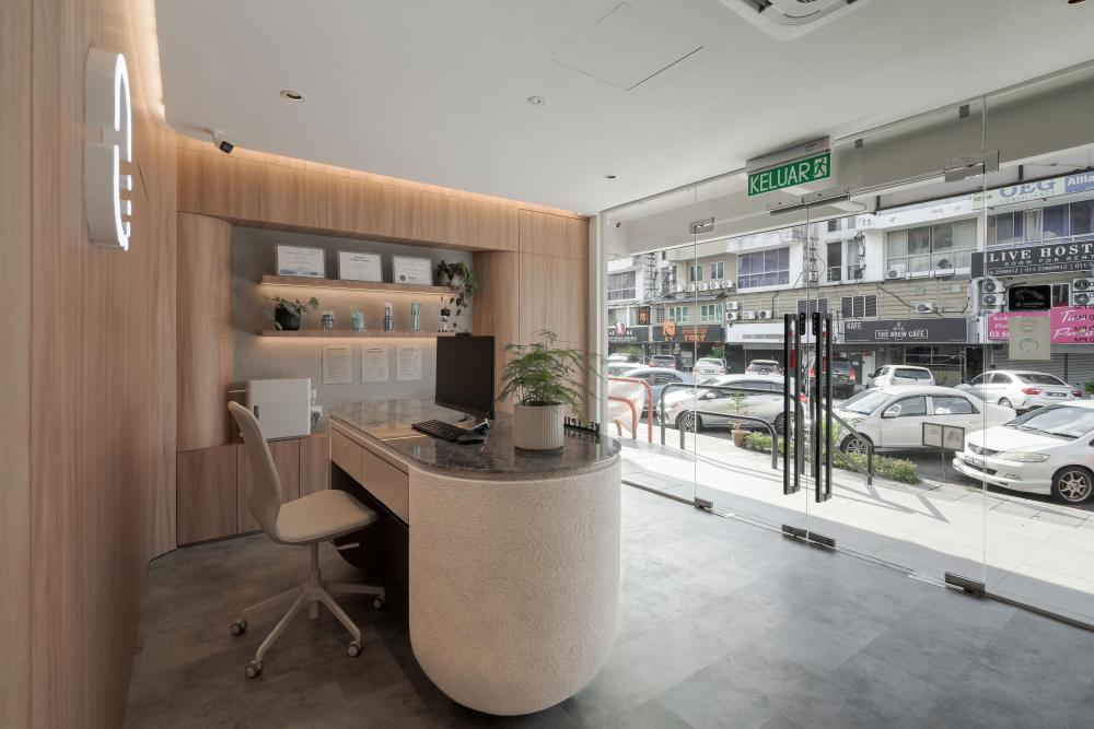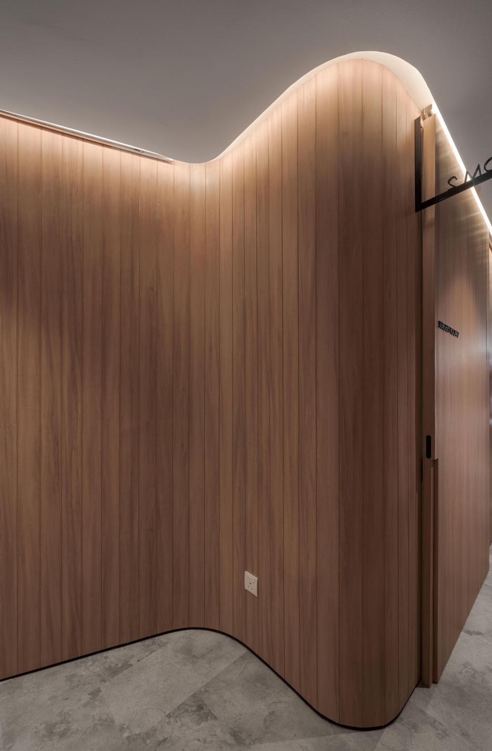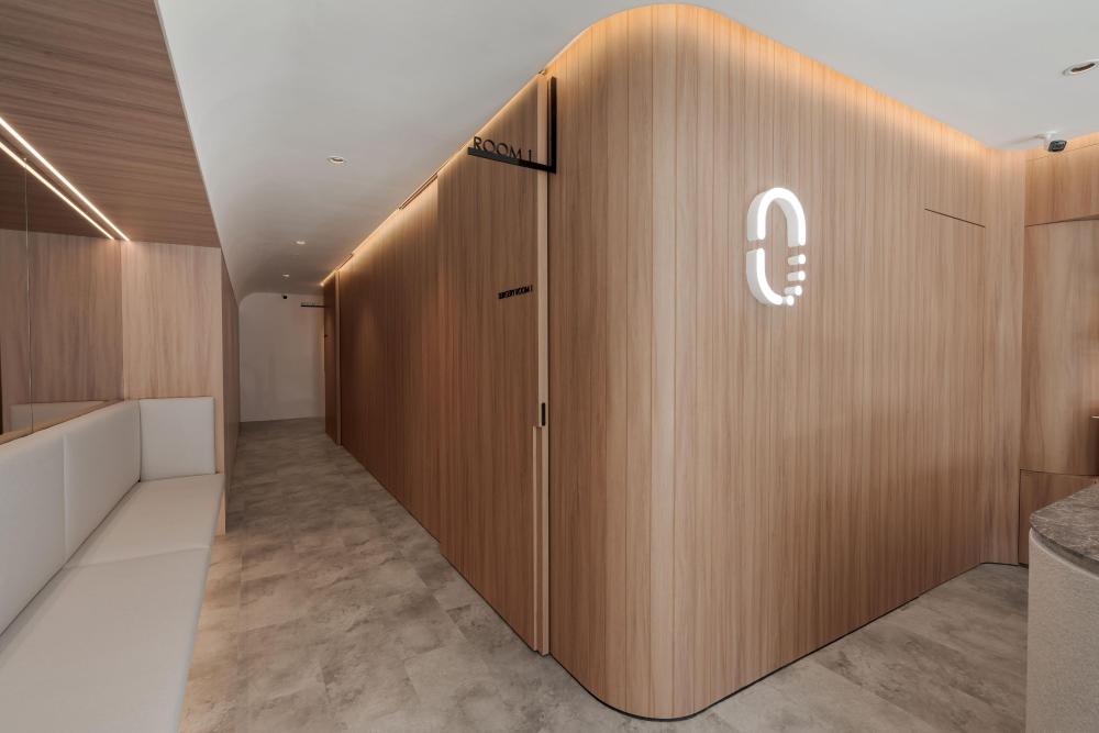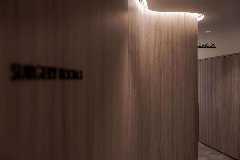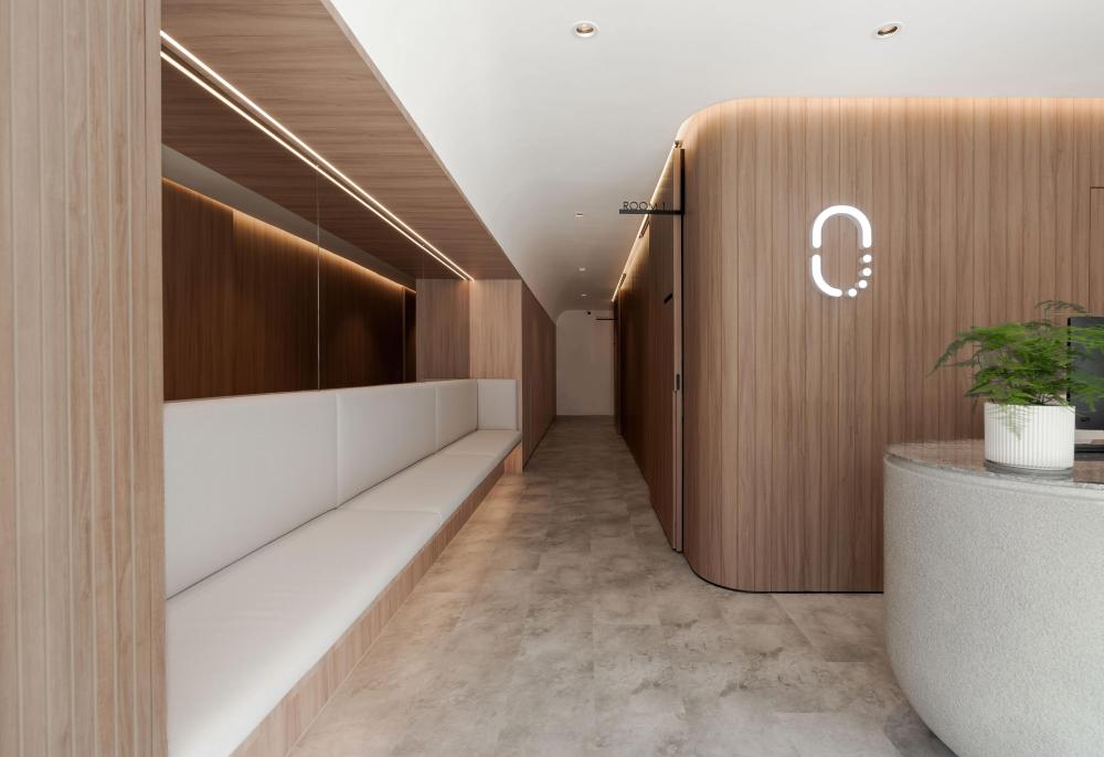 不仅如此,有机的形态还被精心融入接待台、隔板与天花板等关键节点。接待台不再是规整的矩形,而是带着流水般的圆润轮廓,仿佛河水冲刷出的自然形态;隔板以弧形线条分隔空间,避免了尖角带来的压迫感;天花板上的曲线设计,则如同河流上方的天际线,让视线有了延伸的方向。这些设计都在刻意消除传统医疗空间中刺耳的线条与棱角,用更柔和、更具亲和力的轮廓,复刻水的有机流动,让整个空间形成自然和谐的整体,仿佛人置身于河畔,而非诊所。