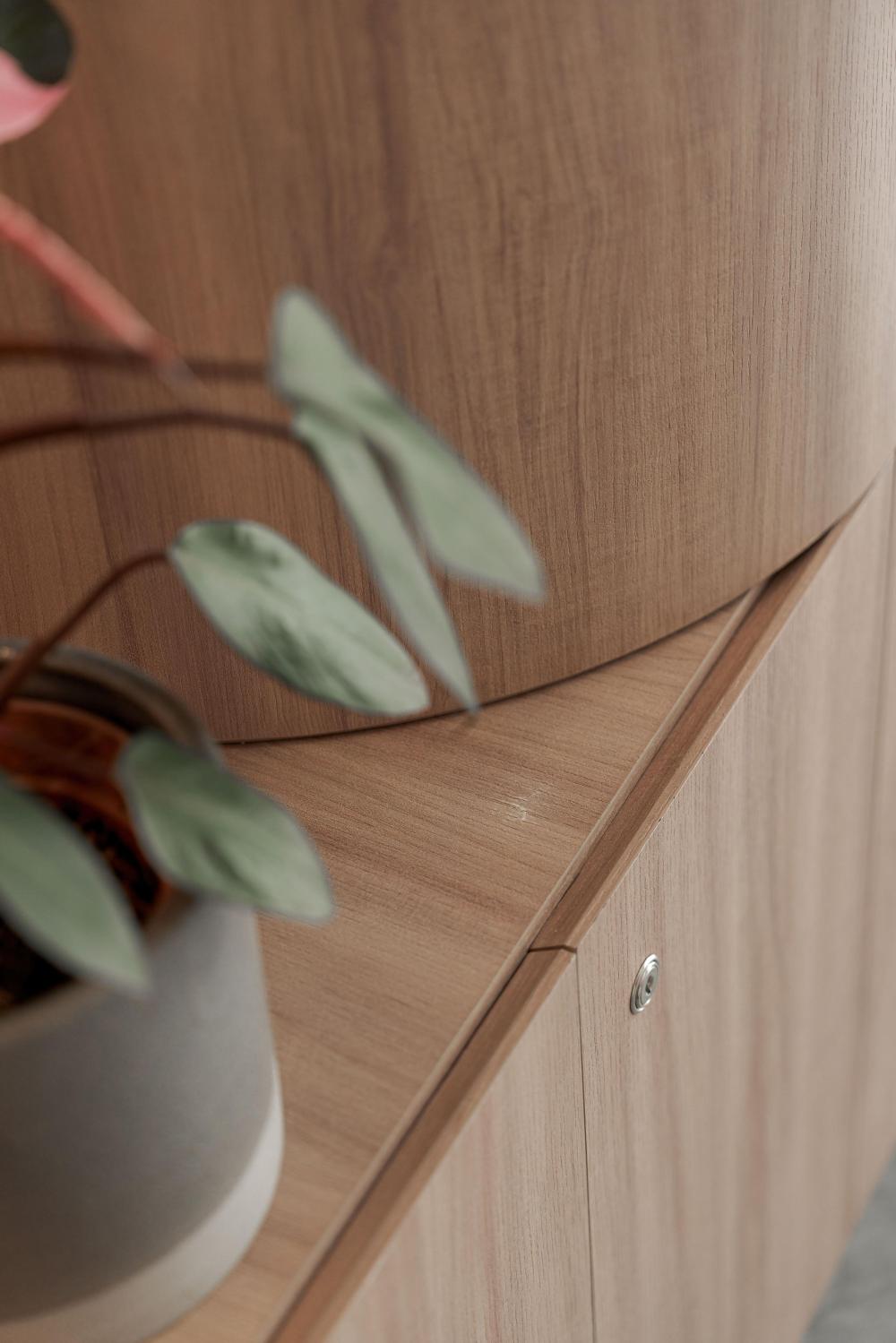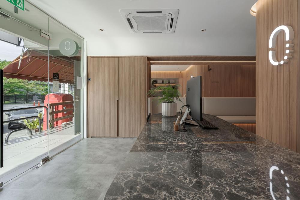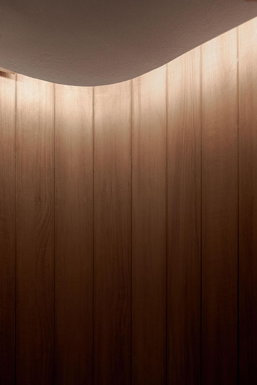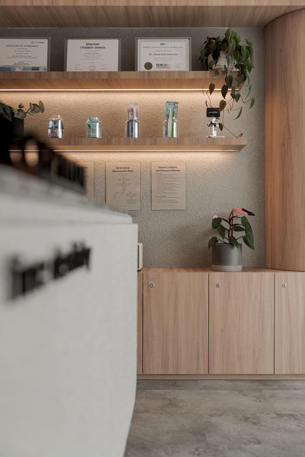 不仅如此,有机的形态还被精心融入接待台、隔板与天花板等关键节点。接待台不再是规整的矩形,而是带着流水般的圆润轮廓,仿佛河水冲刷出的自然形态;隔板以弧形线条分隔空间,避免了尖角带来的压迫感;天花板上的曲线设计,则如同河流上方的天际线,让视线有了延伸的方向。这些设计都在刻意消除传统医疗空间中刺耳的线条与棱角,用更柔和、更具亲和力的轮廓,复刻水的有机流动,让整个空间形成自然和谐的整体,仿佛人置身于河畔,而非诊所。