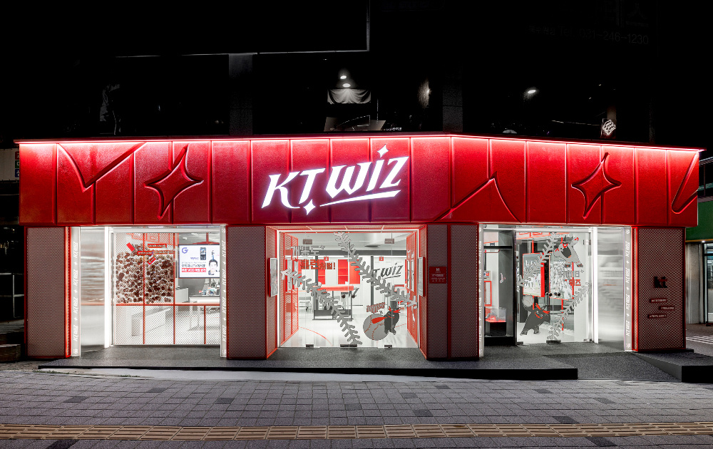 这是一家棒球主题的综合文创体验店设计,在商业空间设计领域,如何将特定文化符号深度融入空间,同时兼顾商业功能与体验感,是设计的一大挑战。KT Wiz 品牌空间以棒球运动为核心文化载体,通过色彩、材质、空间布局与细节设计的协同,打造出一个既充满棒球运动活力,又能高效承载商业运营的沉浸式空间,为主题类商业空间设计提供了优秀范例。
