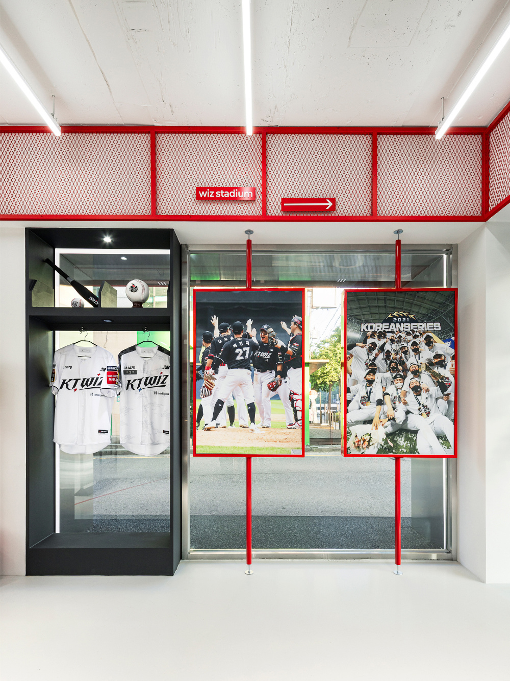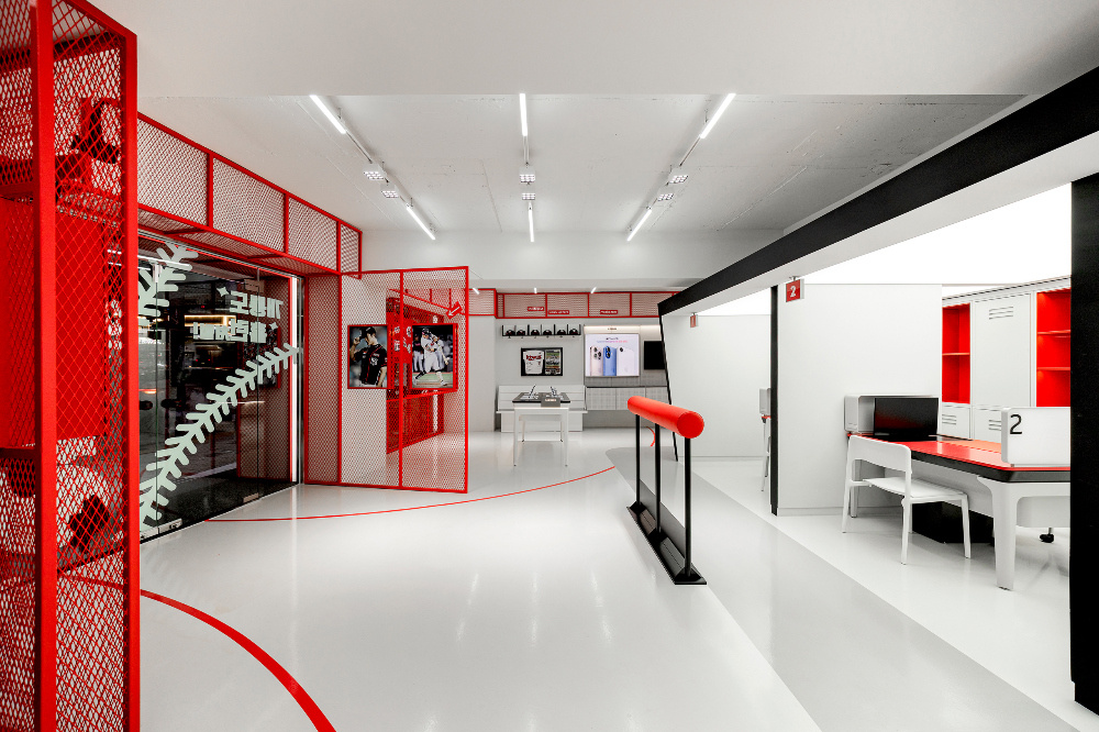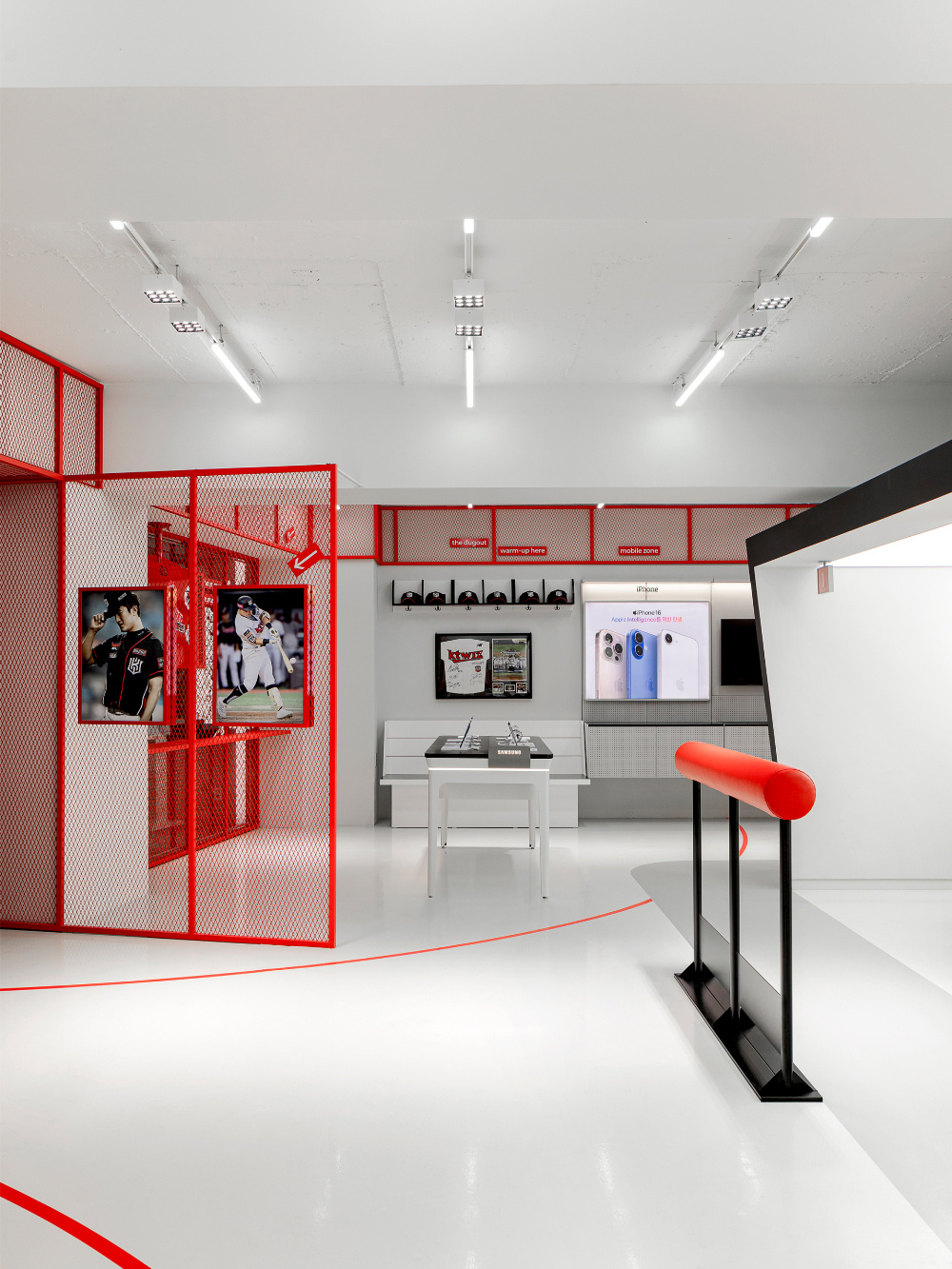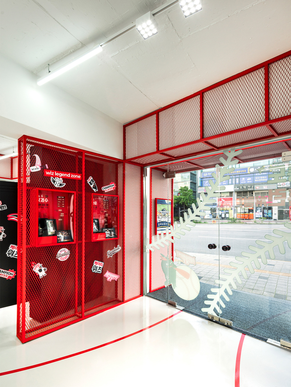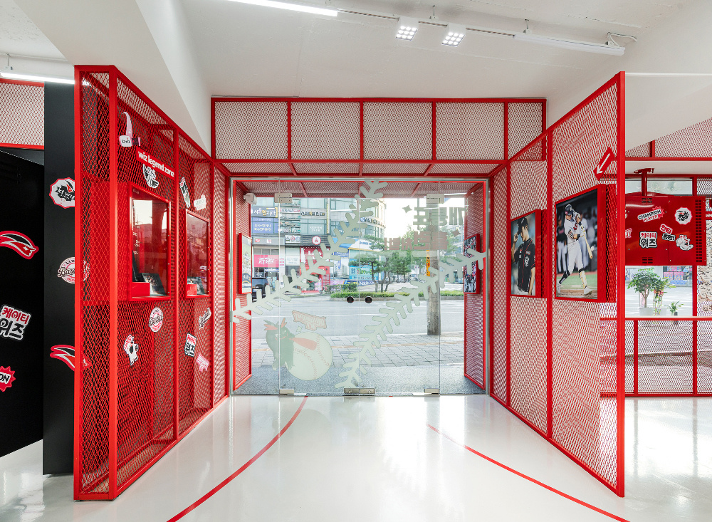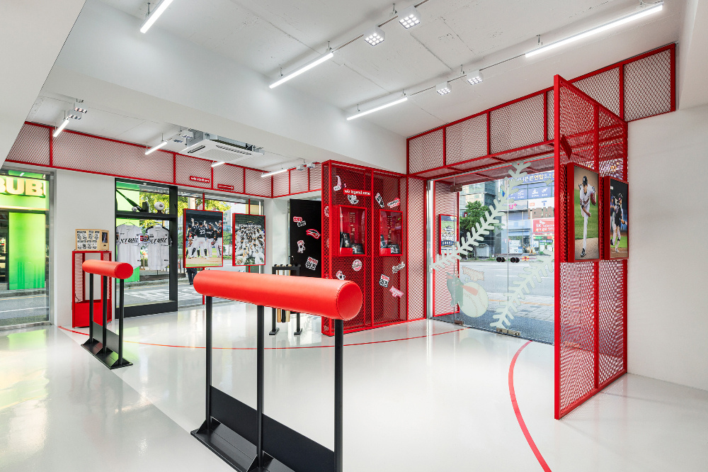 色彩是传递品牌与文化情感的直接语言,KT Wiz 空间以红色和白色为主色调,精准呼应棒球运动的活力与品牌特质:红色的 “视觉冲击与精神唤醒”:红色作为空间的主色调,大量应用于外立面、内部隔断、装饰细节等部分。从外立面醒目的红色金属板材,到室内红色的网状隔断、标识牌,红色以强烈的视觉冲击力,瞬间抓住路人目光,同时唤起人们对棒球运动激情、活力的联想,让空间从视觉层面就与 “KT Wiz” 所代表的棒球文化深度绑定;白色的 “平衡与延展”:白色作为辅助色,主要用于地面、墙面以及部分展具。白色的大面积使用,平衡了红色带来的强烈视觉刺激,让空间不至于因红色过多而显得压抑。同时,白色的纯净感延伸了空间的视觉范围,配合灯光设计,营造出明亮、通透的空间氛围,为展示商品与文化内容提供了 “干净的背景板”。