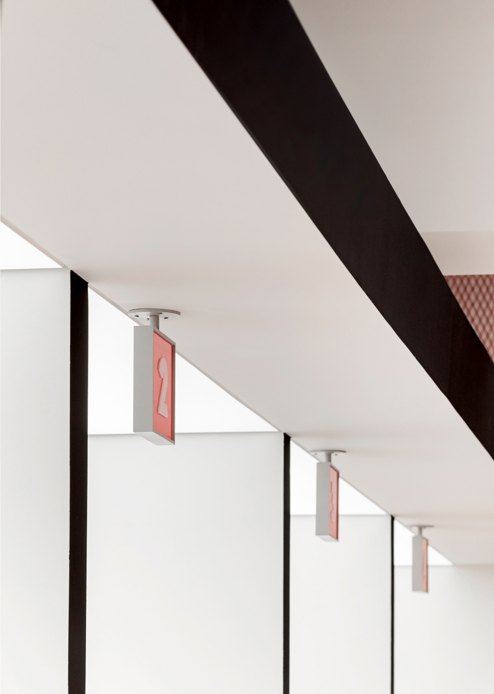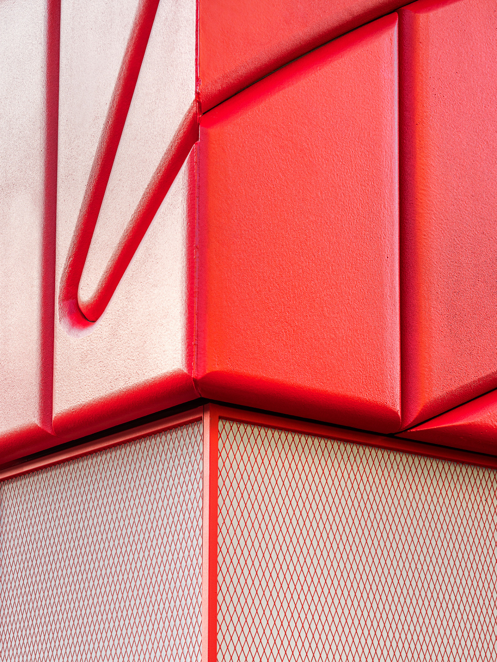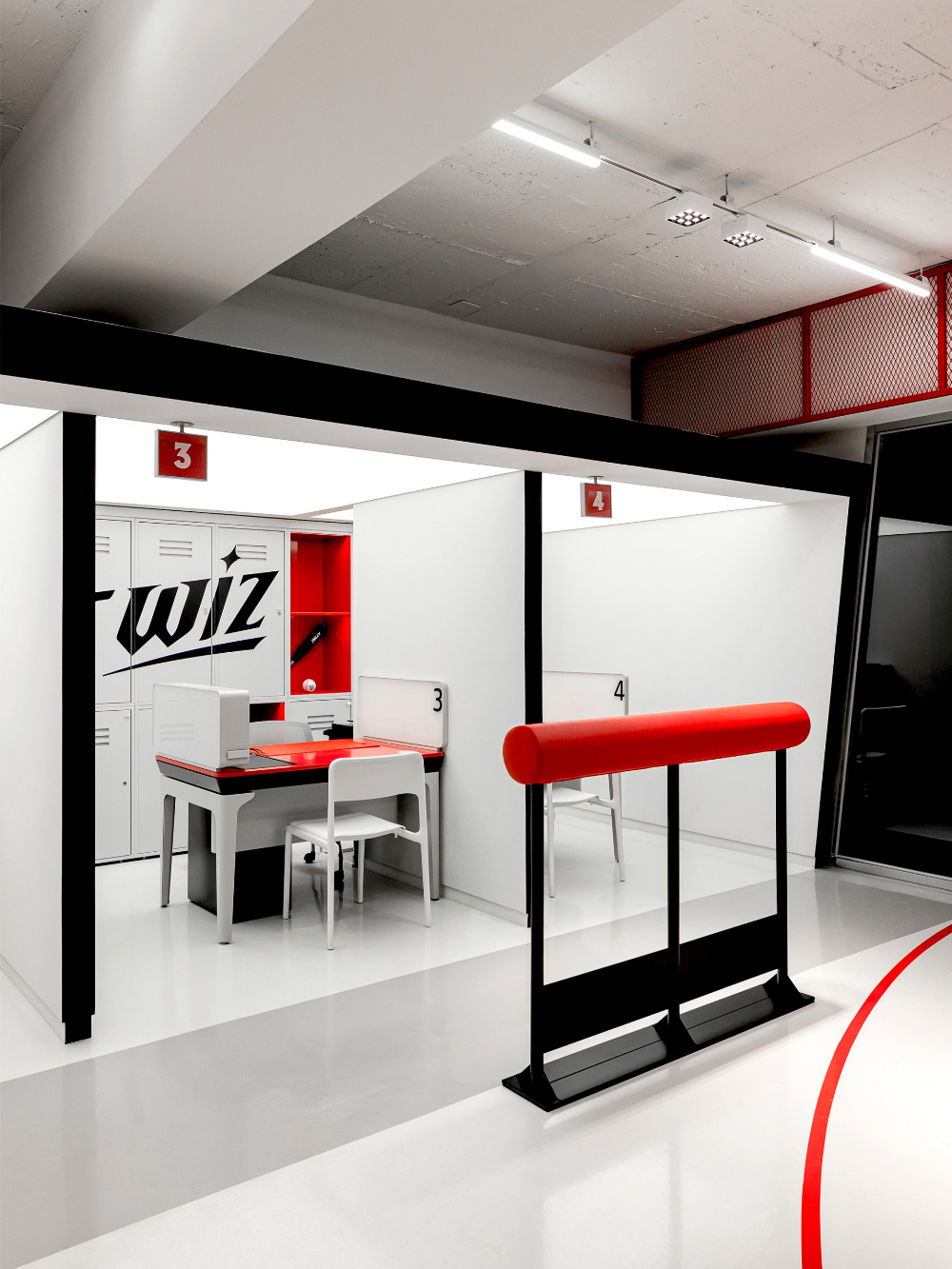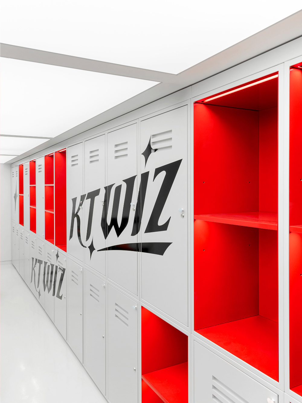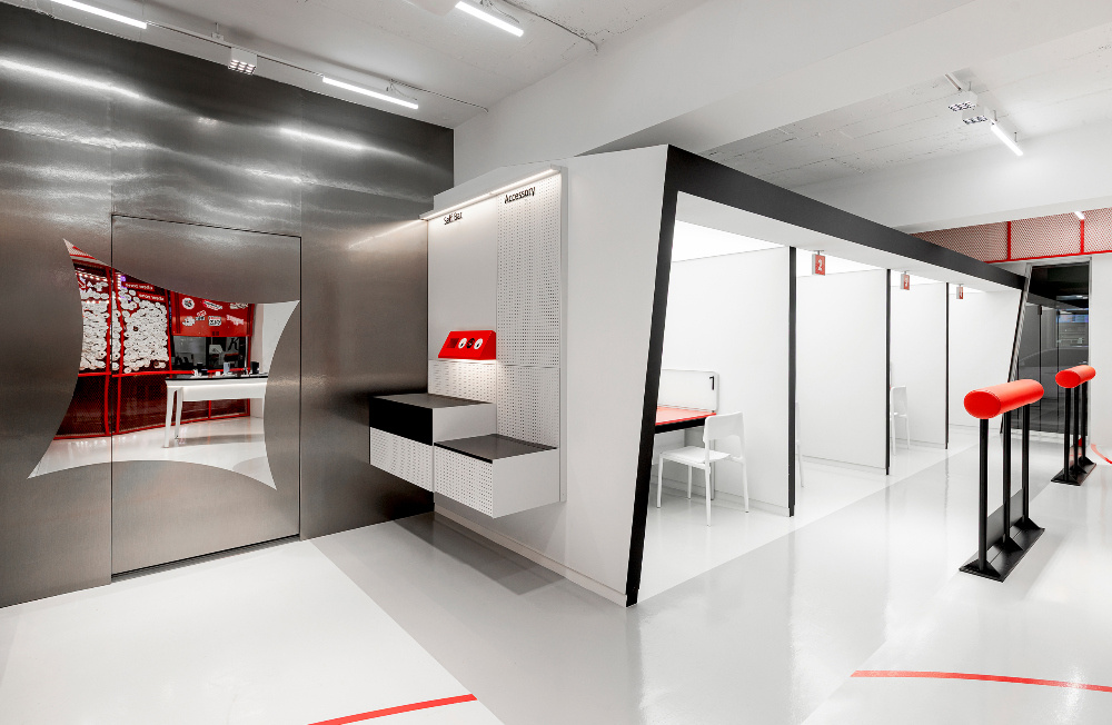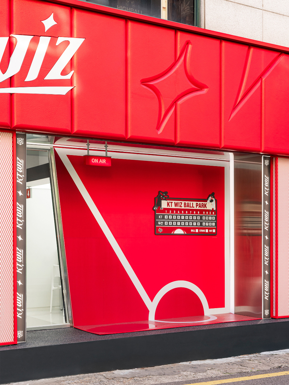 色彩是传递品牌与文化情感的直接语言,KT Wiz 空间以红色和白色为主色调,精准呼应棒球运动的活力与品牌特质:红色的 “视觉冲击与精神唤醒”:红色作为空间的主色调,大量应用于外立面、内部隔断、装饰细节等部分。从外立面醒目的红色金属板材,到室内红色的网状隔断、标识牌,红色以强烈的视觉冲击力,瞬间抓住路人目光,同时唤起人们对棒球运动激情、活力的联想,让空间从视觉层面就与 “KT Wiz” 所代表的棒球文化深度绑定;白色的 “平衡与延展”:白色作为辅助色,主要用于地面、墙面以及部分展具。白色的大面积使用,平衡了红色带来的强烈视觉刺激,让空间不至于因红色过多而显得压抑。同时,白色的纯净感延伸了空间的视觉范围,配合灯光设计,营造出明亮、通透的空间氛围,为展示商品与文化内容提供了 “干净的背景板”。