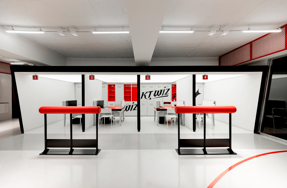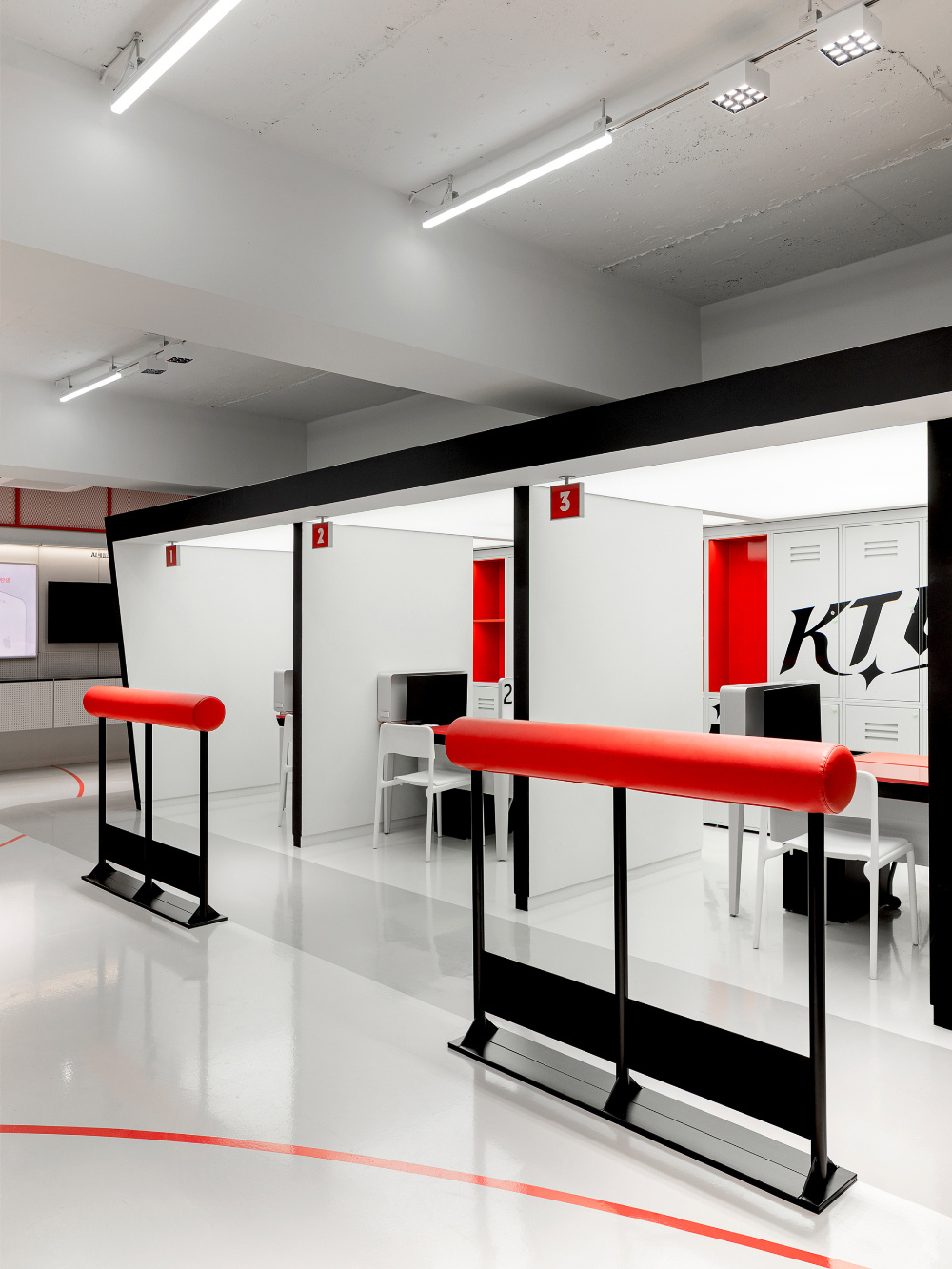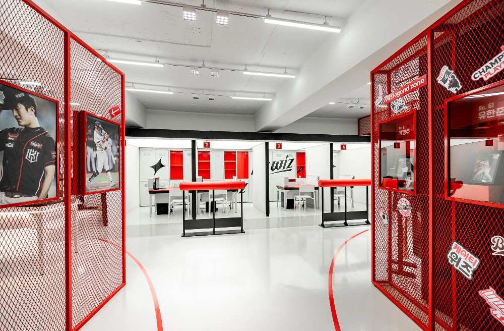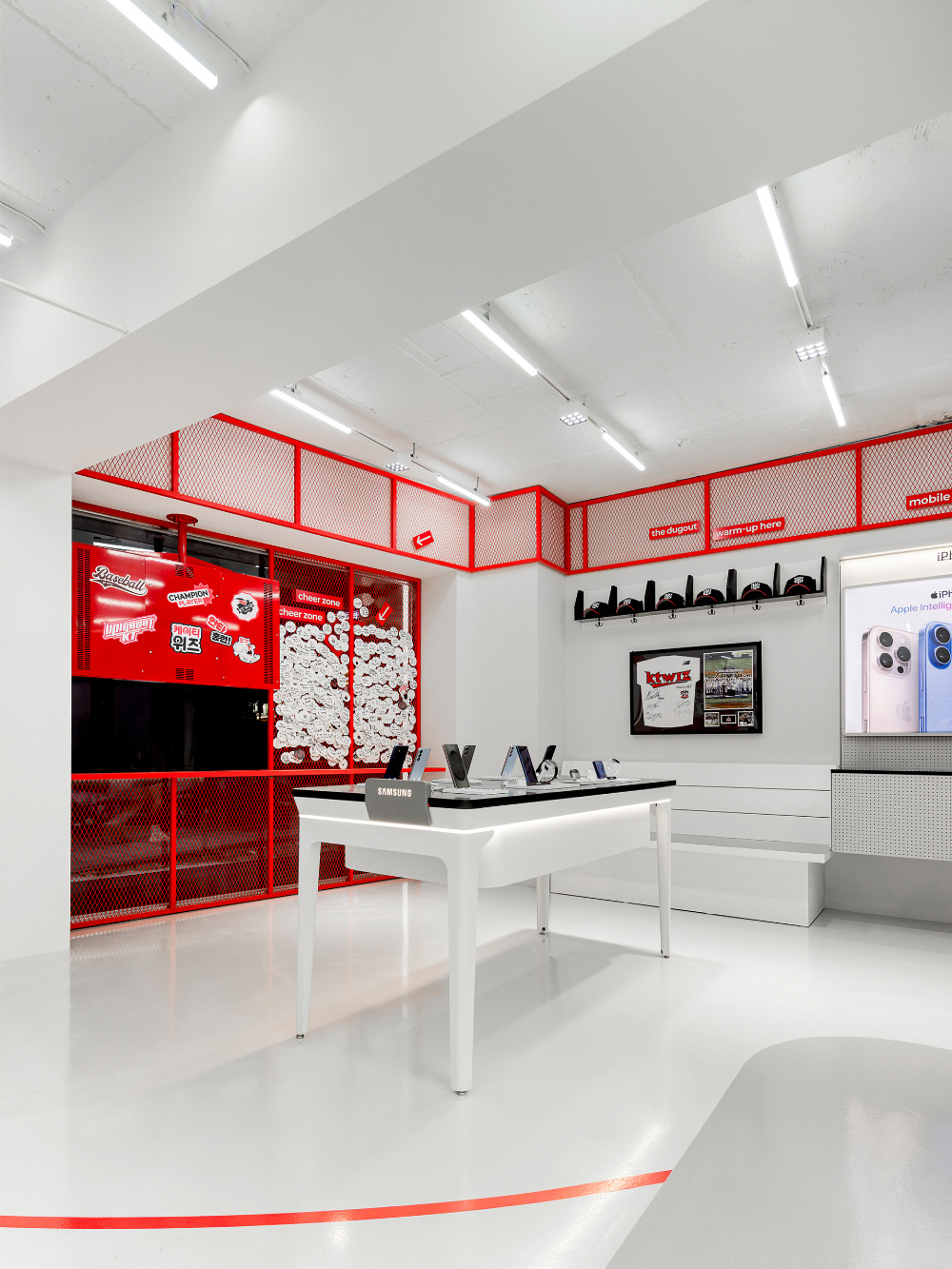 空间布局既需要满足商业功能(如展示、销售、体验等),又要能传递文化叙事。KT Wiz 空间通过 “分区设计” 与 “动线引导”,实现了两者的统一:分区的 “文化叙事”:空间被划分为不同功能区域,每个区域都承担着特定的文化展示或商业功能。例如,“Wiz Legend Zone” 区域通过展示棒球相关的历史照片、纪念物品,讲述 KT Wiz 的品牌故事与棒球文化的传承;产品展示区则聚焦于棒球周边商品、电子设备等的展示与销售。这种分区方式,让顾客在空间内的移动过程,成为一次 “棒球文化的探索之旅”;动线的 “引导与沉浸”:空间动线设计流畅且富有引导性,红色线条在白色地面上延伸,如同棒球场上的标线,引导顾客自然地穿梭于各个区域。动线的设计既保证了顾客能浏览到所有重要区域,又通过 “路径暗示”,强化了棒球运动的空间氛围,让顾客在移动中持续沉浸于棒球文化场景。