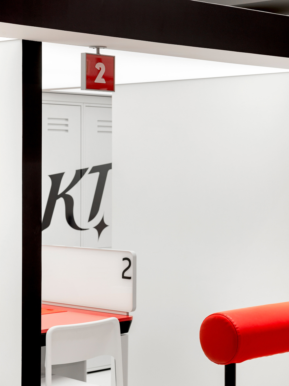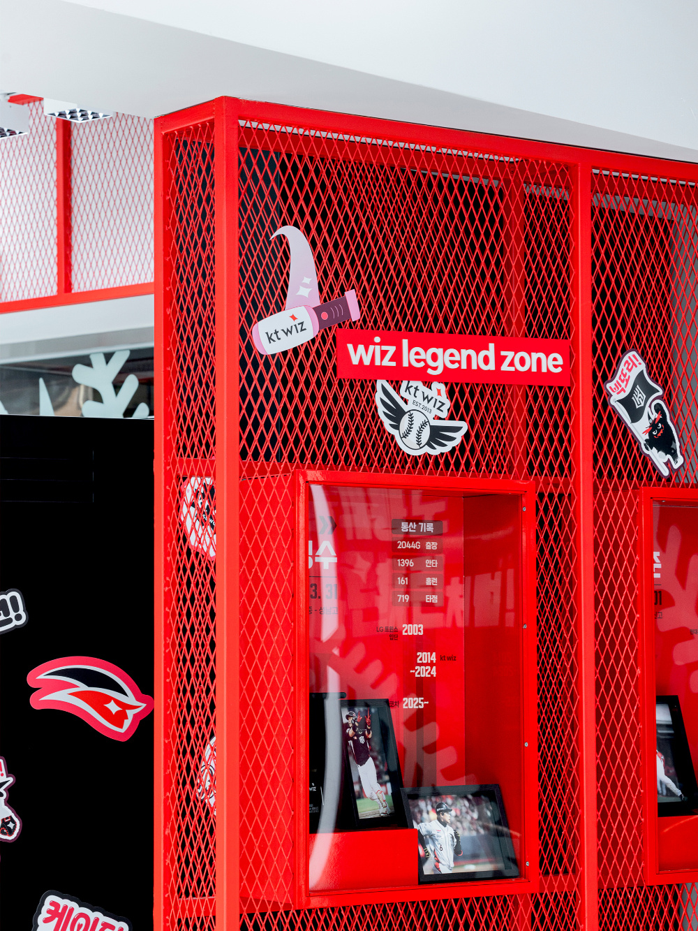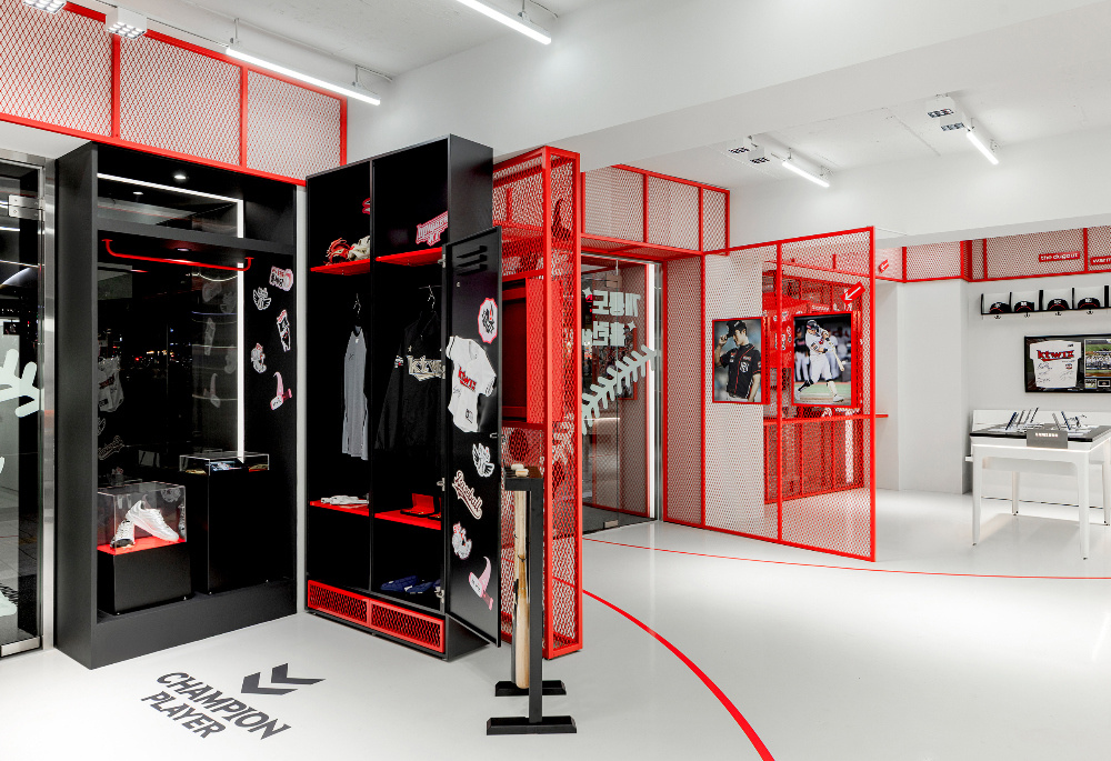 细节是提升空间文化质感与记忆点的关键,KT Wiz 空间在细节处大量植入棒球文化符号,让文化表达更具穿透力:棒球元素的 “无处不在”:从墙面的棒球图案装饰,到展具上的棒球造型点缀,再到与棒球相关的文字标识(如 “CHAMPION PLAYER”),棒球元素渗透到空间的每一个角落。这些细节不仅丰富了空间的视觉层次,更让棒球文化成为空间的 “基因”,而非表面的装饰;展具与设施的 “运动感塑造”:展柜、座椅等设施的设计也融入了运动元素。例如,红色的长条形座椅,造型简洁且富有力量感,如同棒球棒的抽象化呈现;展柜的棱角与线条设计,也呼应了棒球运动的速度与力量特质,让顾客在使用这些设施时,能从触觉与视觉上进一步感受运动氛围。