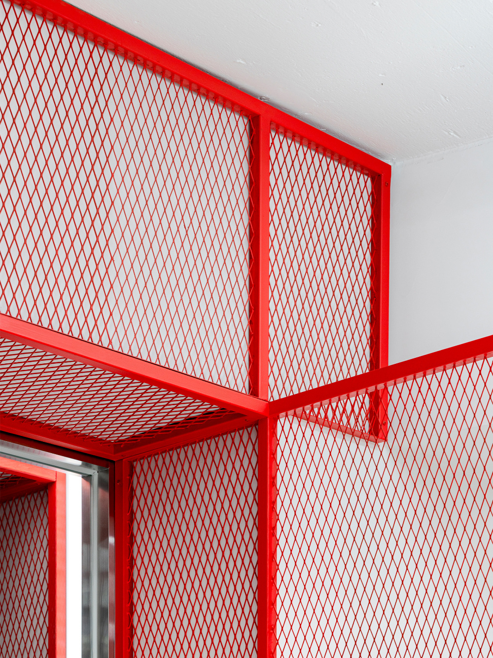 材质的选择与组合,是塑造空间质感与文化氛围的关键。KT Wiz 空间巧妙运用金属、玻璃等材质,既营造出工业风的现代感,又强化了棒球运动的特质:金属网状材质的 “场域还原”:红色金属网状隔断是空间的核心材质元素之一。这种材质让人联想到棒球场上的防护网,将棒球运动的 “场域感” 直接移植到商业空间中,使顾客一进入空间,就能感受到浓郁的棒球运动氛围。同时,网状结构具备良好的通透性,保证了空间的视觉连通性,避免了隔断对空间的割裂;玻璃材质的 “展示与互动”:玻璃广泛应用于橱窗、展柜等部分。透明的玻璃材质一方面能清晰展示内部的商品与文化内容,吸引路人驻足;另一方面,也增强了空间内部与外部的互动性,让路过的人群能透过玻璃感受到空间内的棒球文化氛围,激发进入空间的欲望。