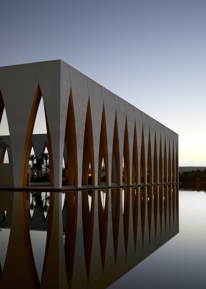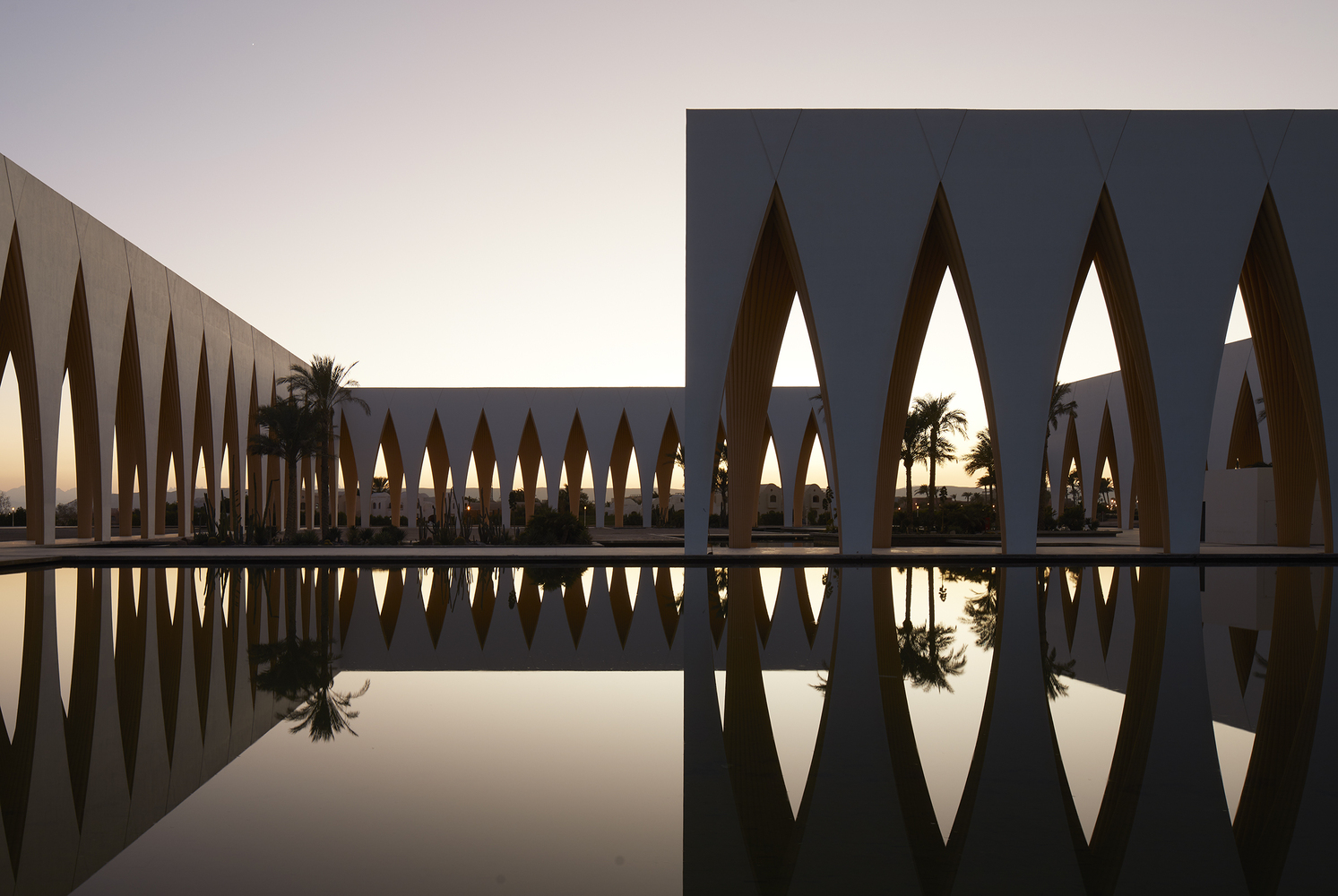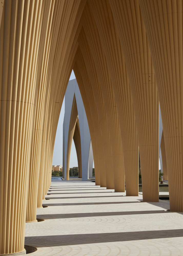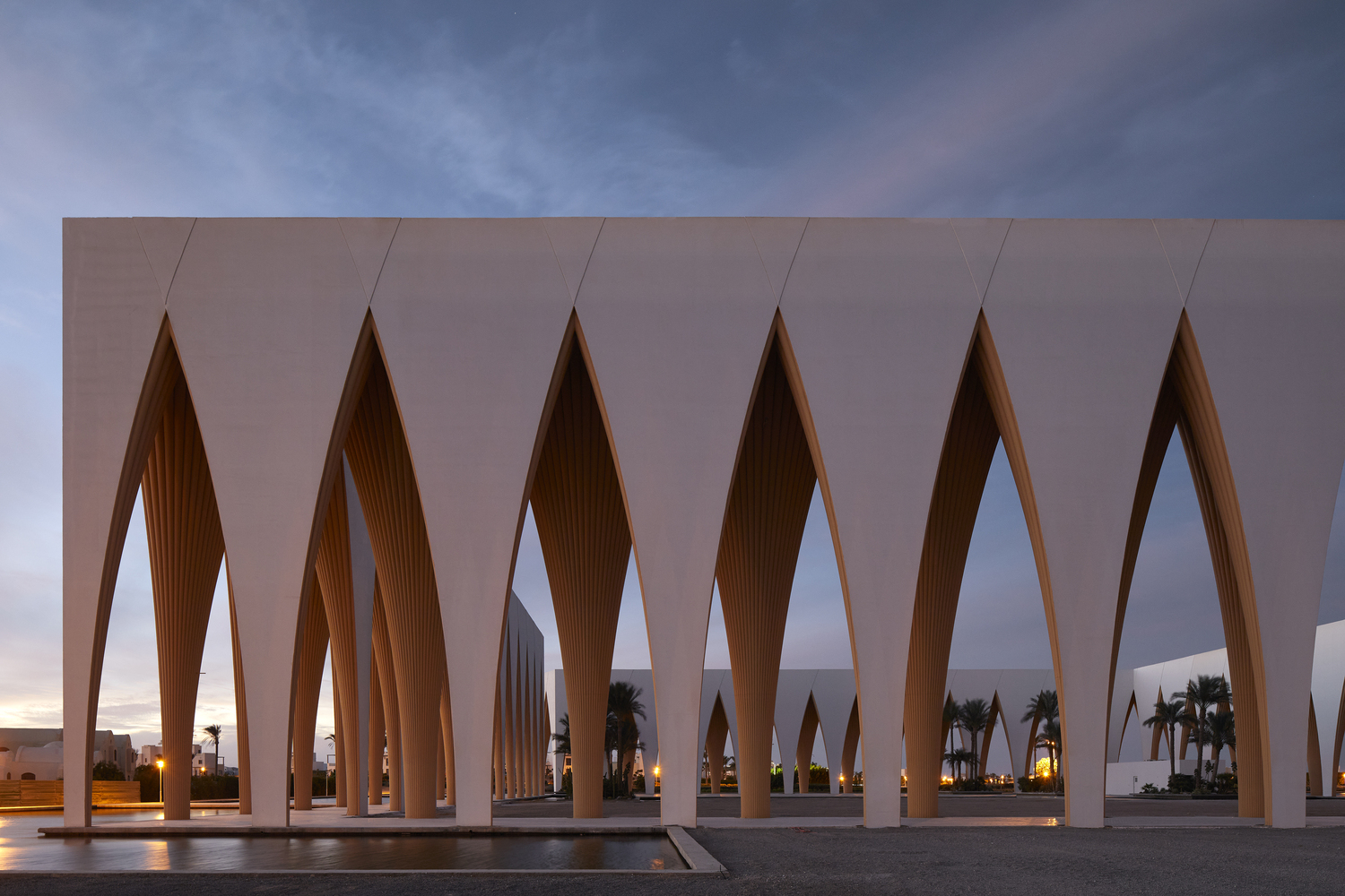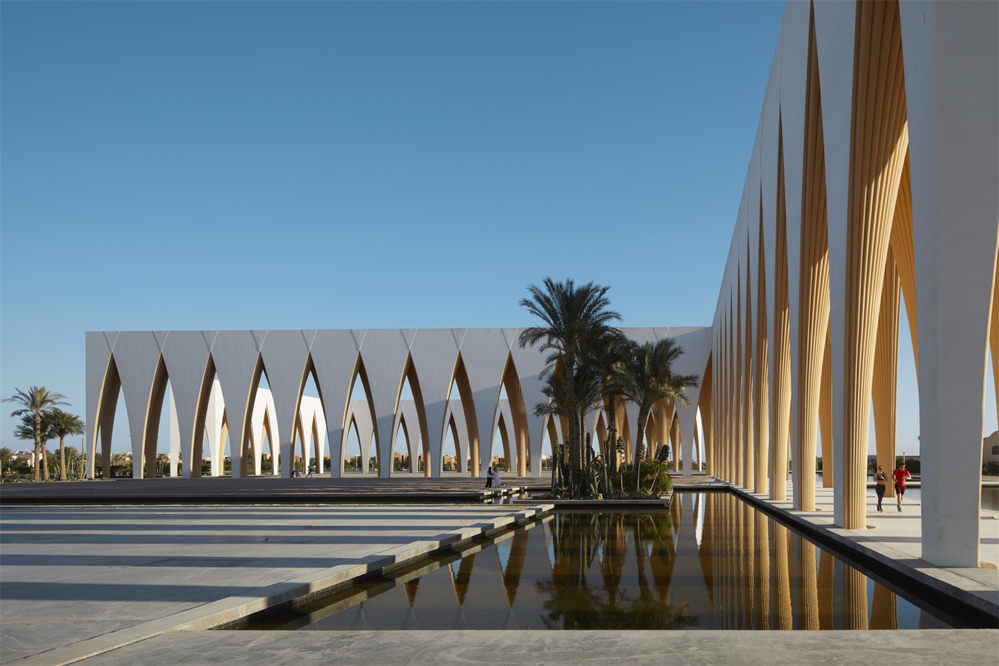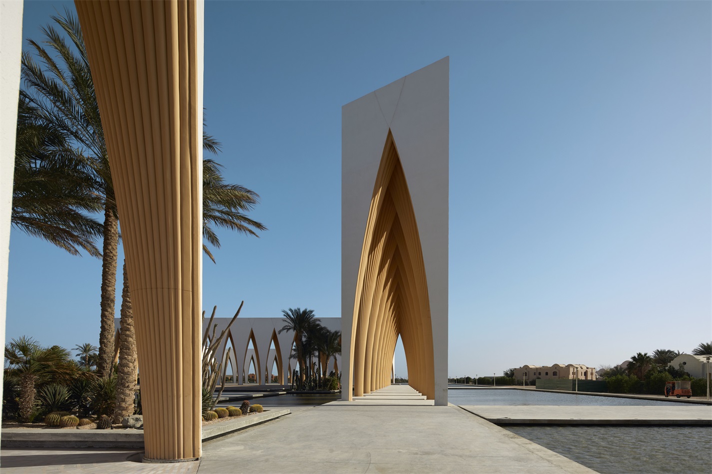 当地背景 – 该项目的设计灵感源自中东和埃及的传统建筑。古埃及建筑的规模是项目概念构思的一个指导因素。拱门和筒形拱顶在伊斯兰建筑和古埃及建筑中都极为常见。穆斯林继承了希腊和罗马早期的拱门形式,并发展出了多种新形状,包括马蹄形、多叶形、尖形和 S 形拱门。人们钟情于这一主题,不仅因为其常被赋予神秘、象征意义,还因其具有功能优势,因此它成为了主要的结构和装饰特色。