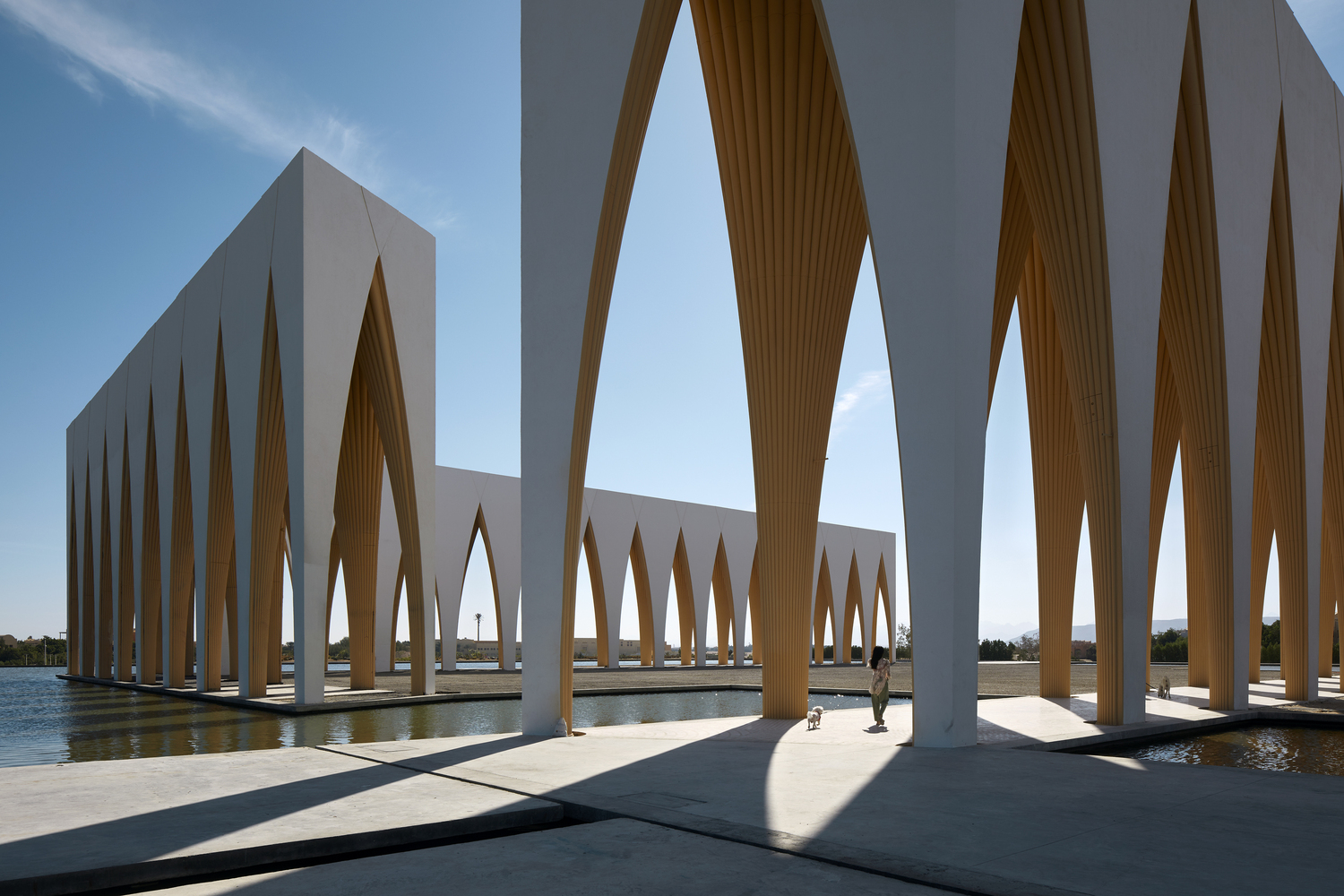 创纪录的建设过程 – 项目一期包括广场、柱廊和泻湖。2019 年 7 月奠基后,施工迅速展开,竖起 147 根预制混凝土柱以搭建柱廊。3000 名建筑工人连续 16 周昼夜施工,浇筑 7500 立方米混凝土,按时完成了一期工程。邻近开发项目的水体分布是将建筑群建在大型泻湖中央的重要因素。建筑的宏伟感通过倒影增强,同时建筑也与周边环境融为一体。新建的 3 万平方米泻湖采用重力供水系统,水源来自现有水井,并与现有泻湖系统相连。设计采用现有自然水系作为水源,而非依赖机械泵,这是一种环保的设计方式。由错落拱门柱廊庇护的露天公共广场是建筑群的主要空间元素,使其能够全年举办各类活动。