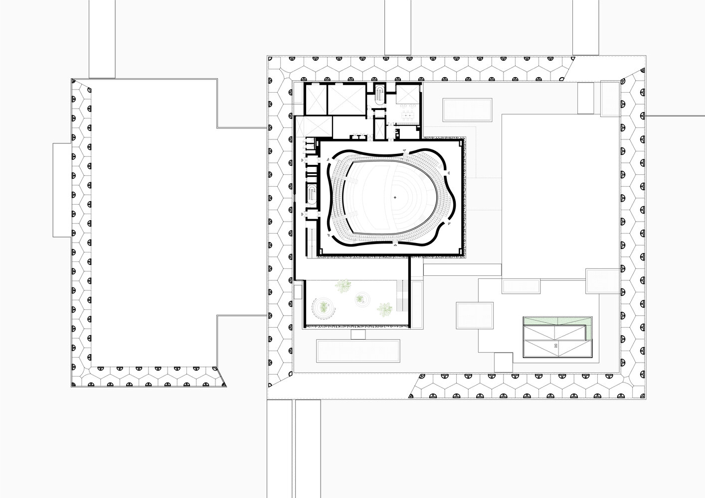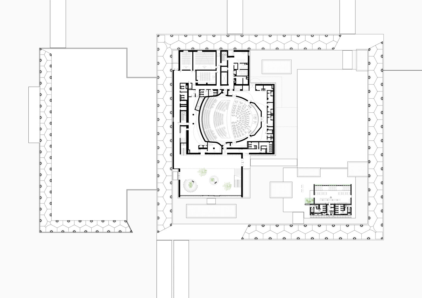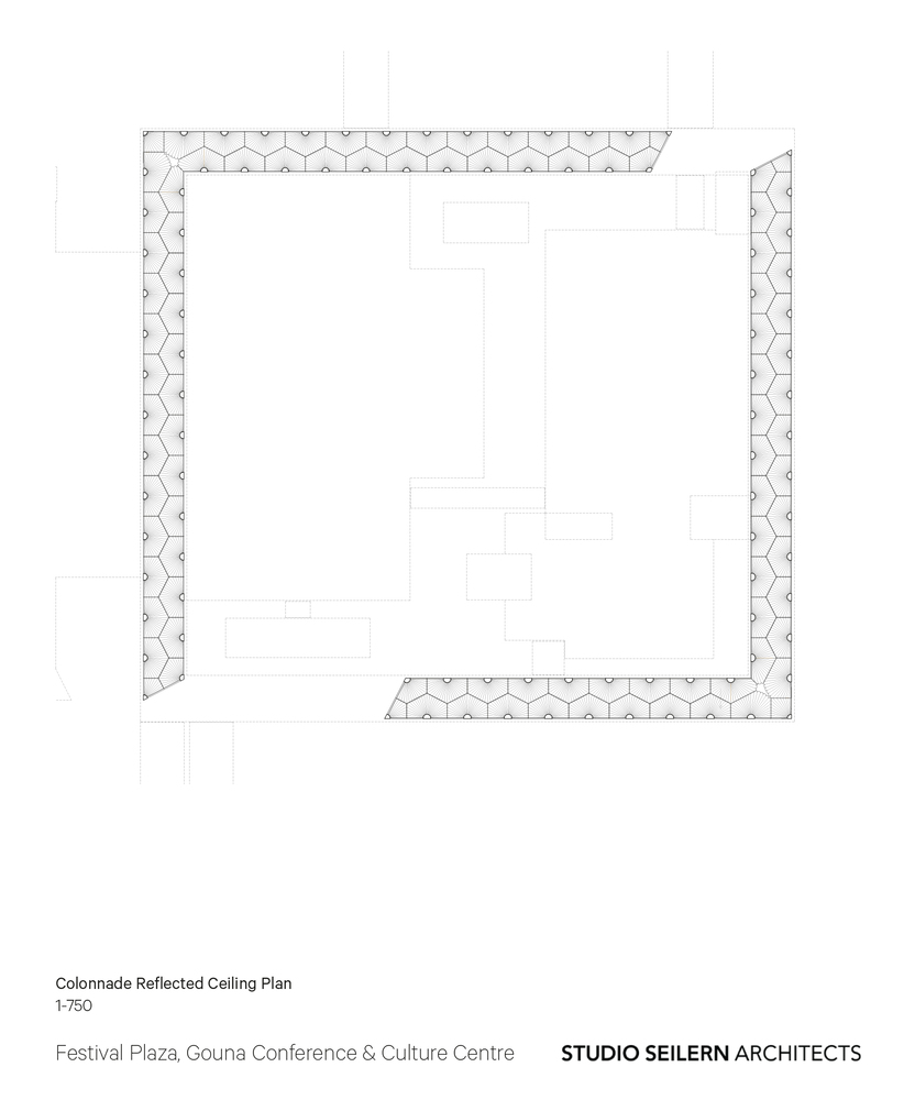 考虑到埃及炎热的气候,西勒恩工作室在建筑周围设计了带遮阳功能的周边柱廊,这不仅赋予建筑独特的风格,还框定了远处的景观。设计团队以伊斯兰拱门为范例(最早的实例可在叙利亚及周边地区找到),思考如何将这种建筑类型重新诠释为当代风格,赋予建筑独特魅力。广场将作为露天场地,举办各类活动,如电影放映和颁奖典礼。景观绿植和水池在周围巨大柱廊的庇护下,营造出宜人的环境。音乐厅的内部设计灵感来源于周围峡谷和洞穴中,阳光照耀下岩石形成的震撼氛围和壮观纹理。这座 620 座的音乐厅通过起伏的声学反射面环绕圆形舞台,营造出令人惊叹的氛围。