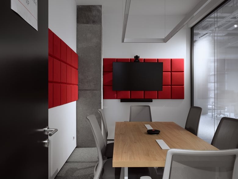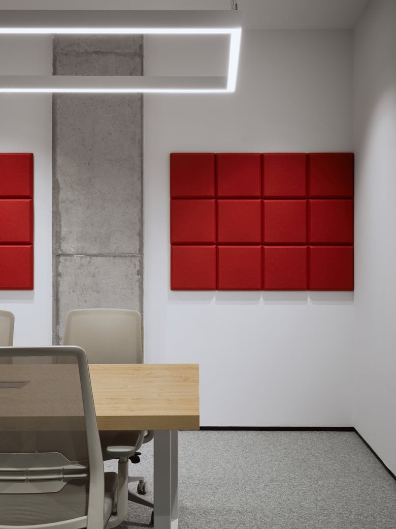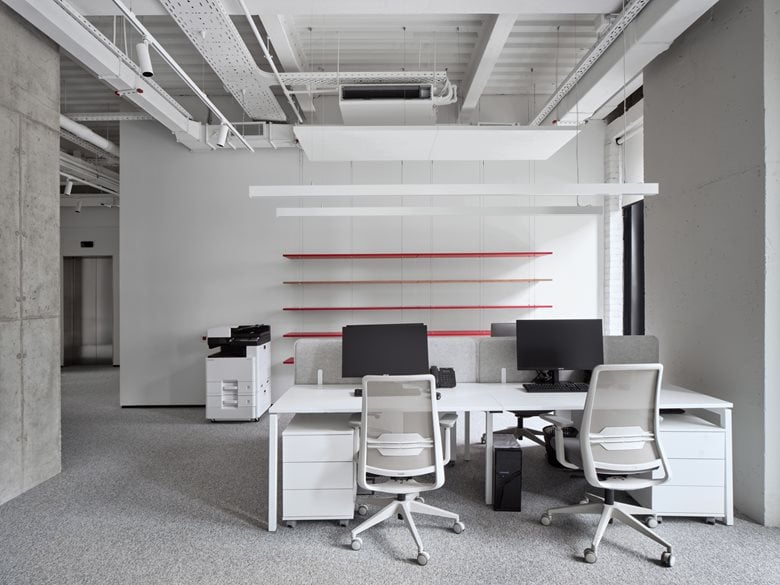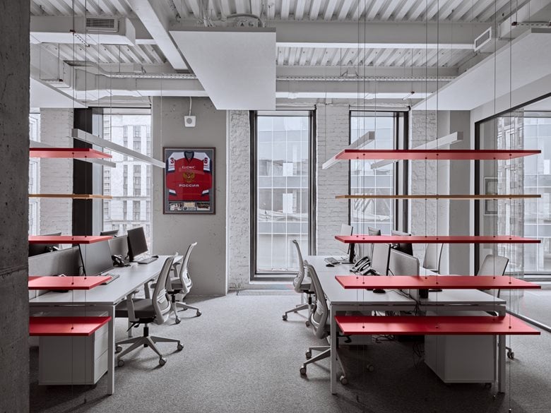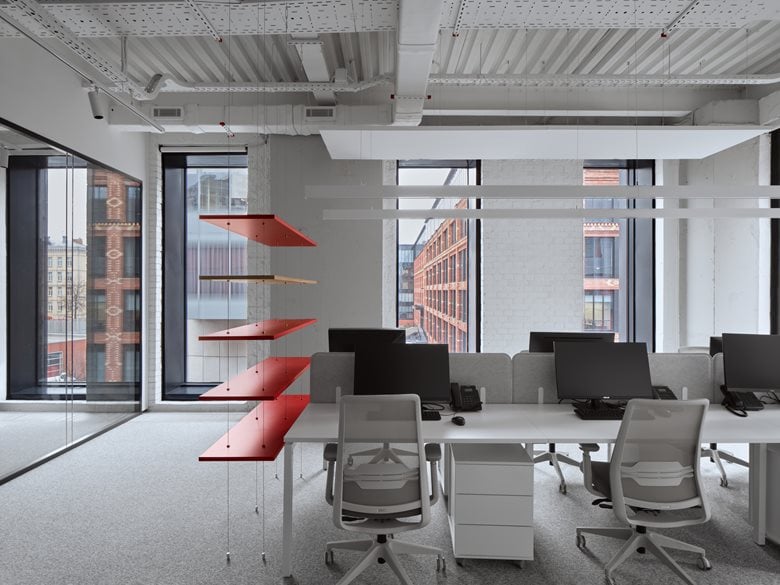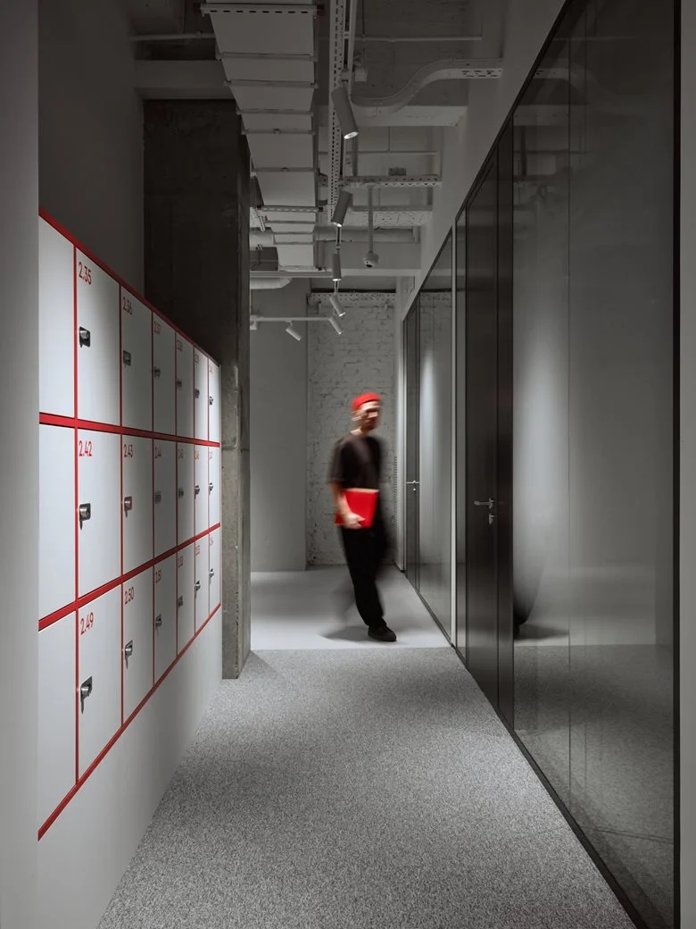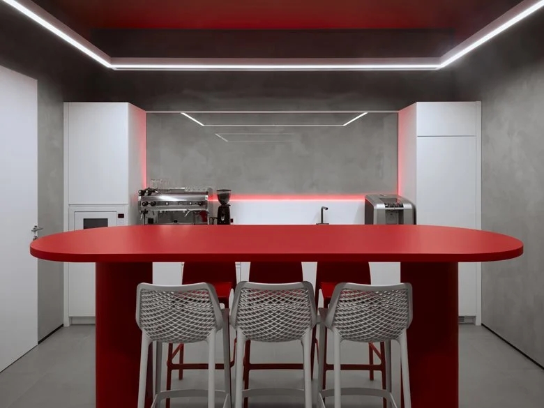 会议室、健身房和咖啡厅采用带宽光学的矩形悬挂式照明系统。会议室还安装了嵌入式灯具,确保包括角落在内的整个空间照明均匀。借助分组控光功能,可根据不同场景(如激烈讨论、安静交谈等)轻松调节照明模式。灯具的配色与室内主装饰色调(白色、灰色、红色)相呼应,使其能自然融入周围空间而不分散注意力,同时又作为设计元素发挥作用。项目中还运用了特殊的装饰性照明手法:例如,接待台的透明台面在冷光照射下宛如一块闪烁的浮冰,成为视觉焦点;卫生区的红色细长悬挂圆柱不仅为洗手台提供功能性照明,还在粗犷的混凝土墙面映衬下成为装饰亮点。