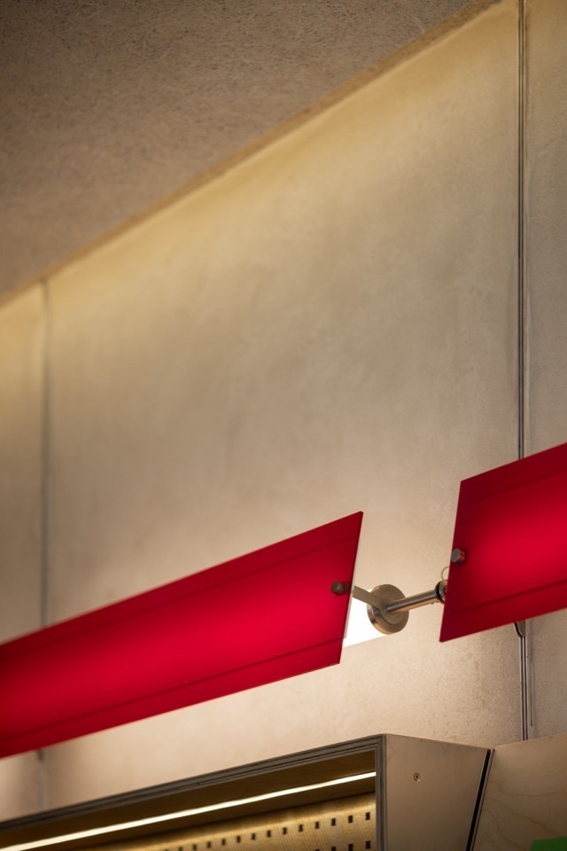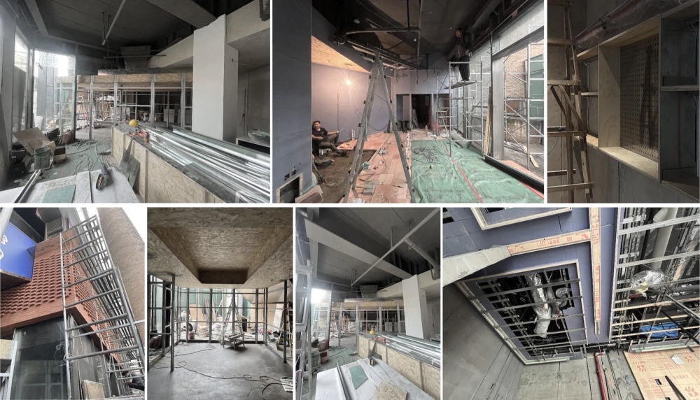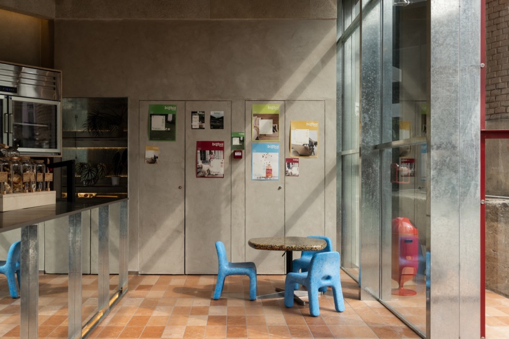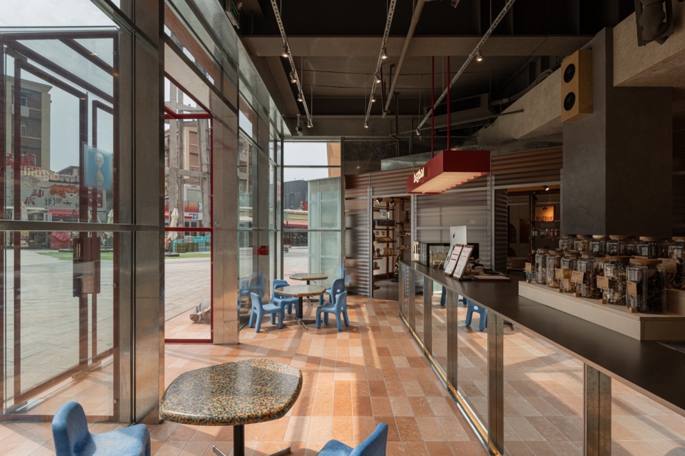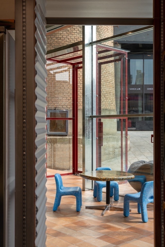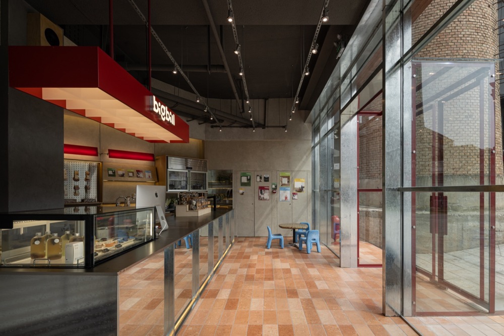 设计团队的破局思路,始于对“历史尊重”与“空间重构”的双重考量。面对红砖烟囱这一核心场域元素,设计没有选择回避,而是以“材质呼应”建立情感联结:外立面采用陶土红砖拼装门头,外延地台则铺设磨砂面红砖,通过与烟囱材质的统一,消解了建筑与遗迹间的割裂感和压迫感,让新空间如同从老厂区中自然生长而出,实现了“新旧对话”的第一步。针对不规则场地的重构,一个“方盒子”的置入成为关键转折。设计团队通过与街区物业协商,获得了扶梯下方区域的使用权——拆除原有玻璃幕墙后,扶梯下方的室外空间与室内形成纵向场域,这一契机让“置入方盒子”的构想落地。这个方盒子承担着三重核心作用:一是增加使用面积,满足多业态功能需求;二是将混乱的三角形场地划分为三个规整区域,彻底解决锐角不适与转折生硬的问题;三是朝向街区的外立面成为品牌“第二展示面”,强化了空间的标识性。