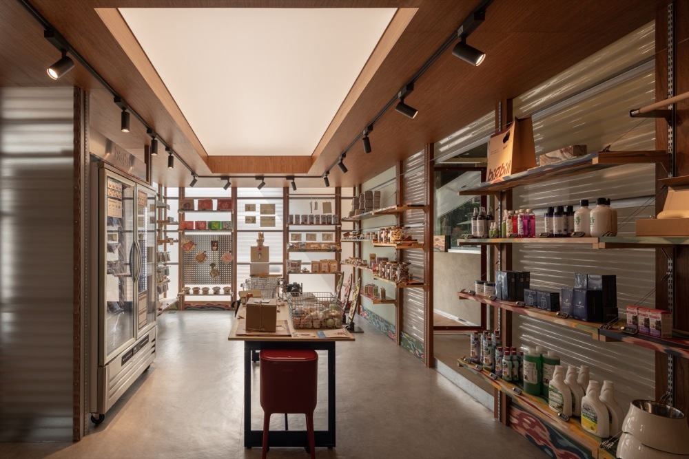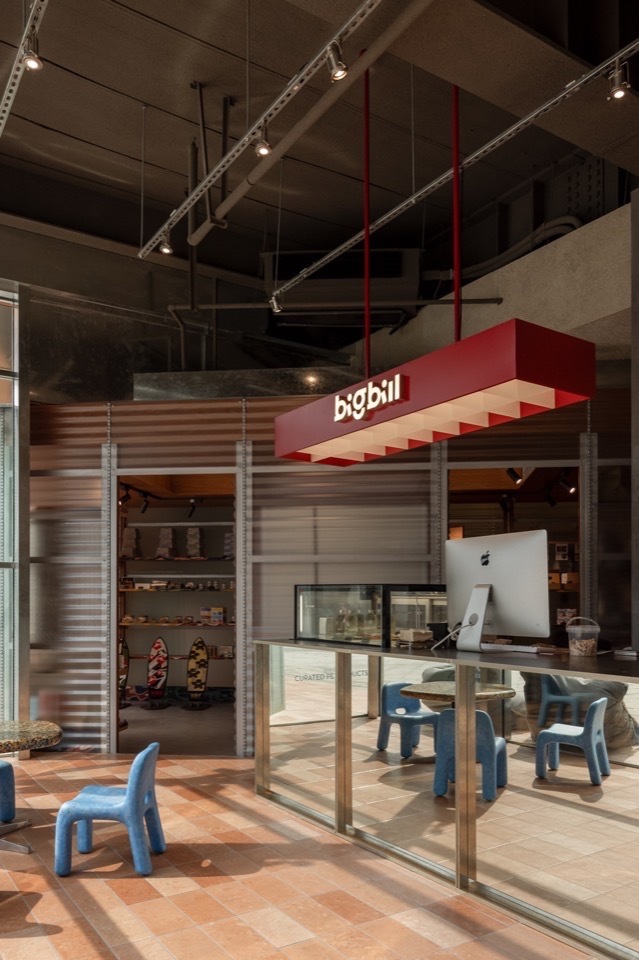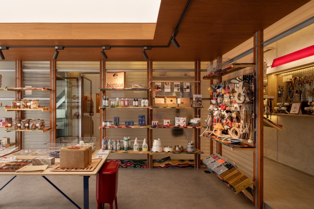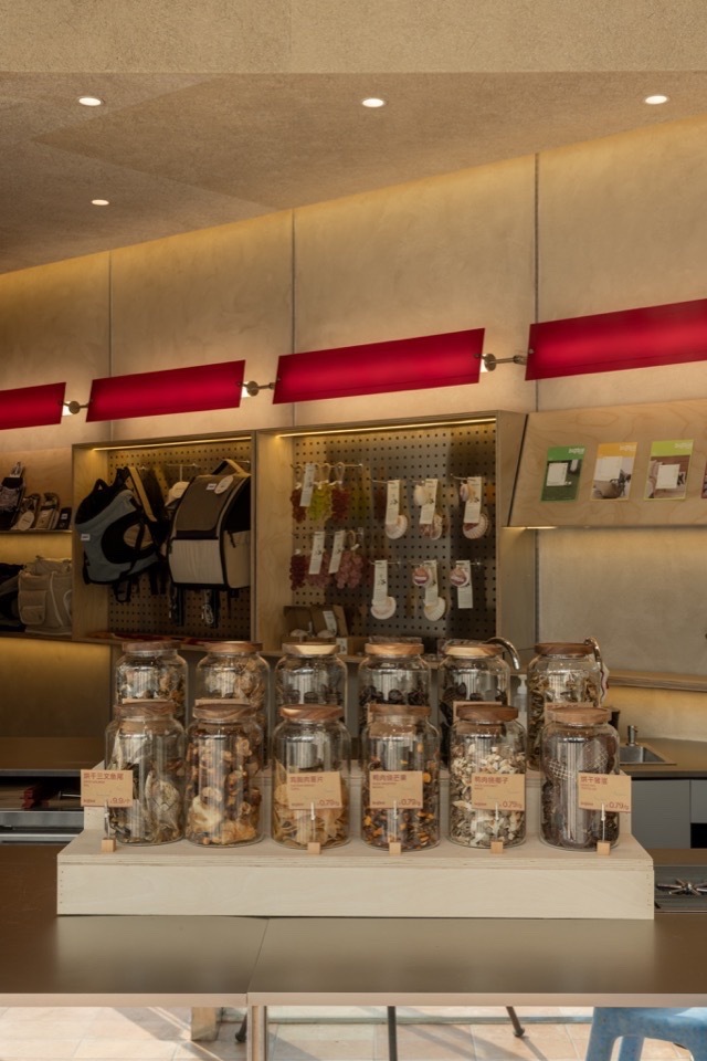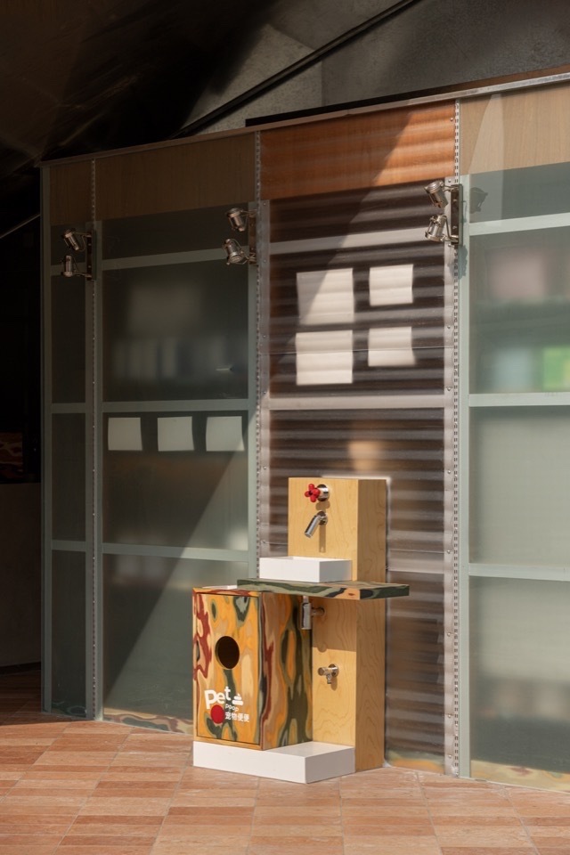 空间的温度不仅体现在功能布局中,更藏在本土匠心与细节设计里。方盒子的建构选择西安本地易得的工字钢、木构与PC波浪板,降低了运输成本与环境影响;导台为宠物制作鲜食的设计、随处可见的宠物饮水区,精准呼应了养宠群体的核心需求。这些细节与空间中融入的墨西哥新兴艺术家手工艺品一起,让BIG BILL不仅是一个商业空间,更是承载人宠情感联结的“温暖容器”。