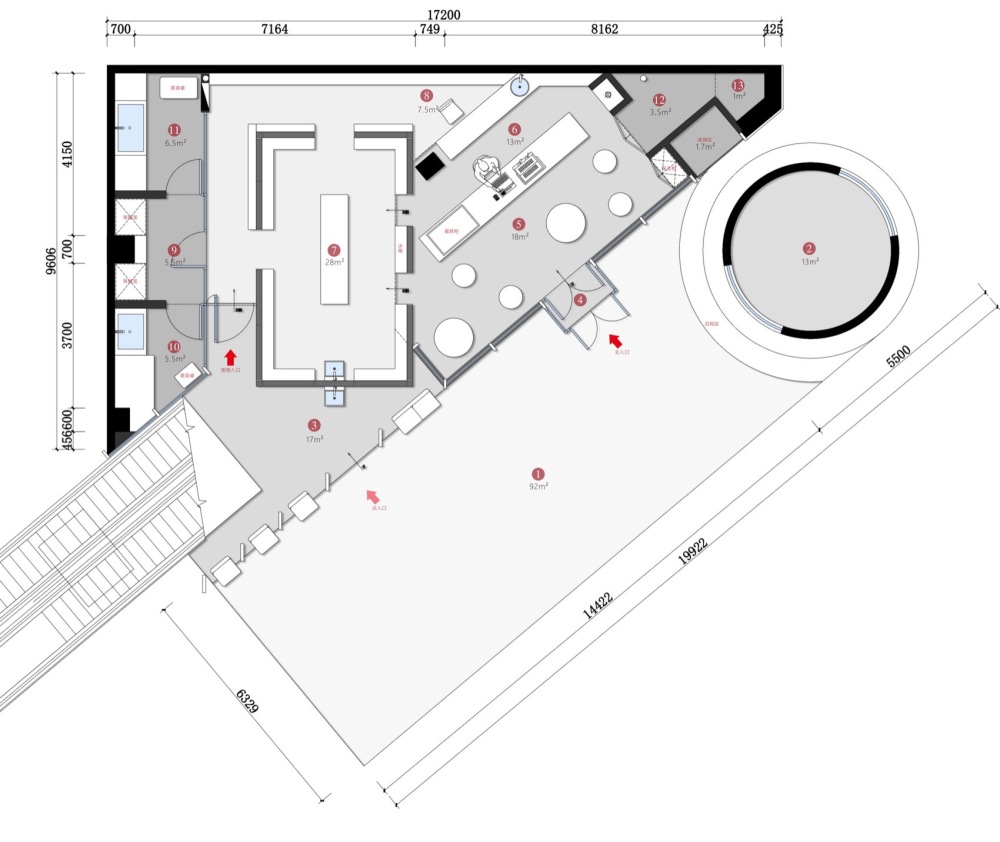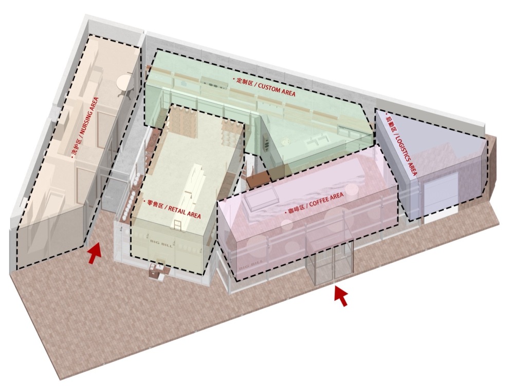BIG BILL的选址极具“矛盾性”:紧邻量子晨保留的标志性红砖烟囱,数十米外便是水塔,工业遗迹带来的场所记忆得天独厚,但烟囱与基地过近产生的逼仄压迫感,也成为设计的第一道难题。更棘手的是场地本身的先天缺陷——原始地块呈三角形,一侧扶梯的存在又使其形成带矩形缺口的不规则形态,这种“难以利用”的空间特质,让铺面长期处于闲置状态。品牌主理人的需求则清晰而具体:作为围绕人宠社交平台创立的新品牌,首店需解决城市养宠群体的社交与休闲痛点,核心功能必须涵盖三大板块——人宠休闲社交区、宠物用品零售区、宠物沐浴SPA区。如何在不规则场地中平衡功能需求与空间体验,同时让新空间与红砖烟囱的历史气质和谐共处,成为MOS木石设计需要破解的核心命题。