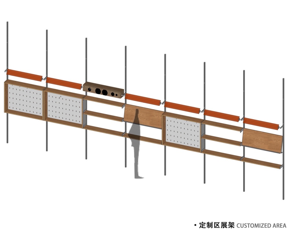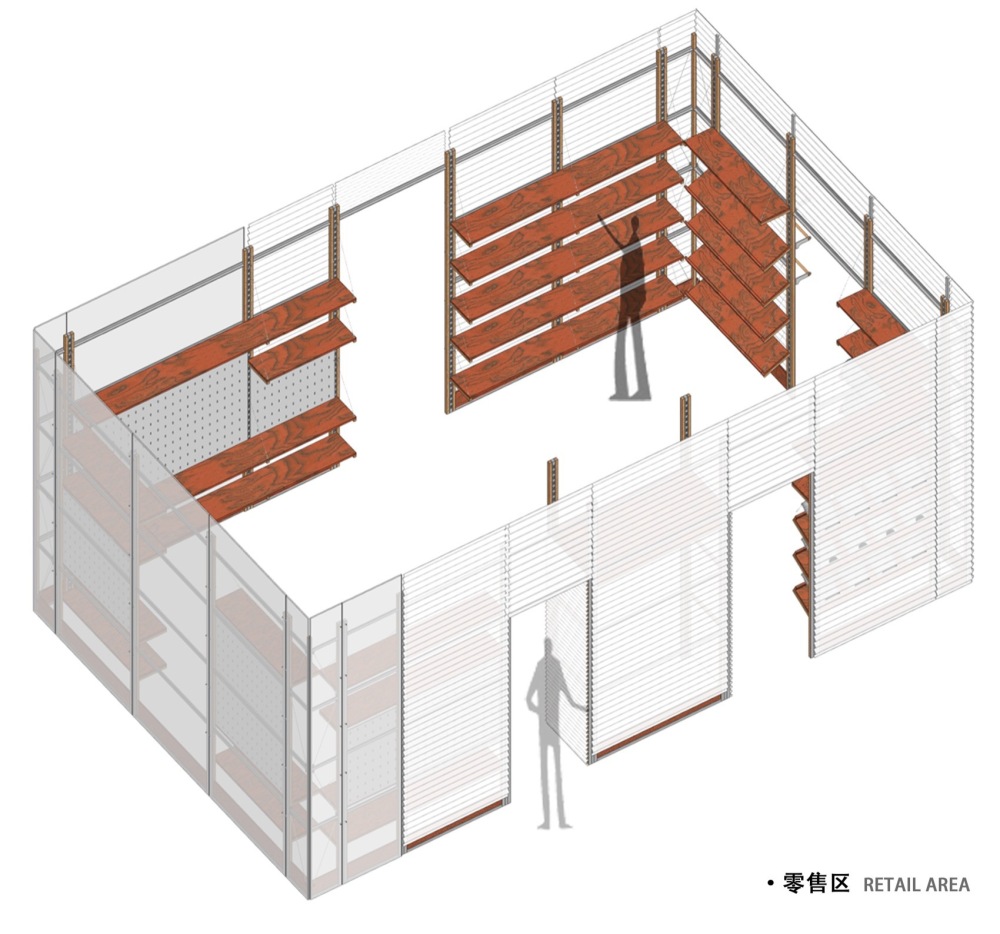 方盒子的介入,让三大功能区的划分清晰而流畅,且摒弃了传统隔墙的生硬限定,形成可自由渗透的流动空间。连接主入口的区域,以通透玻璃幕墙面向街区,成为人宠社交休闲的核心场域——这里摆放着适配人宠共坐的柔软家具,阳光透过玻璃洒入,既为宠物提了舒适的活动空间,也让室内的热闹场景成为吸引路人的“活广告”,傍晚时分,爱狗人士在此交换养宠心得,毛孩子们穿梭追逐,构成量子晨街区最温暖的风景线。方盒子本身则成为宠物零售区的最佳载体——四个立面的内外侧均可利用,工字钢与木构搭建的骨架搭配透明PC波浪板,让空间既轻巧又富有质感,彩色搁板的点缀则增添了俏皮气息;压低的顶面与下沉的地面强化了盒子的边界感,让零售区成为独立又不孤立的“小天地”。最内侧的区域被规划为宠物洗护SPA区,扶梯下方开辟的专属通道与入口,让这里拥有了极佳的私密性与独立性,避免了社交、零售动线的干扰。更巧妙的是,扶梯下方的消极空间被充分激活:泊狗处、宠物清洗池的设置,让原本闲置的角落成为公共友好的品牌窗口,既实用又强化了“人宠友好”的品牌理念。