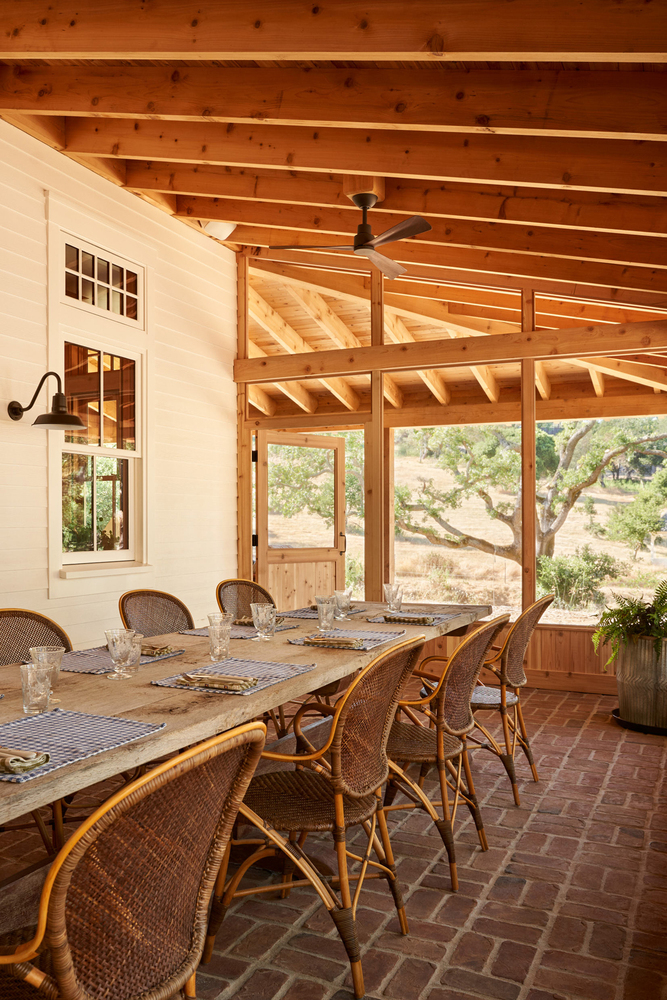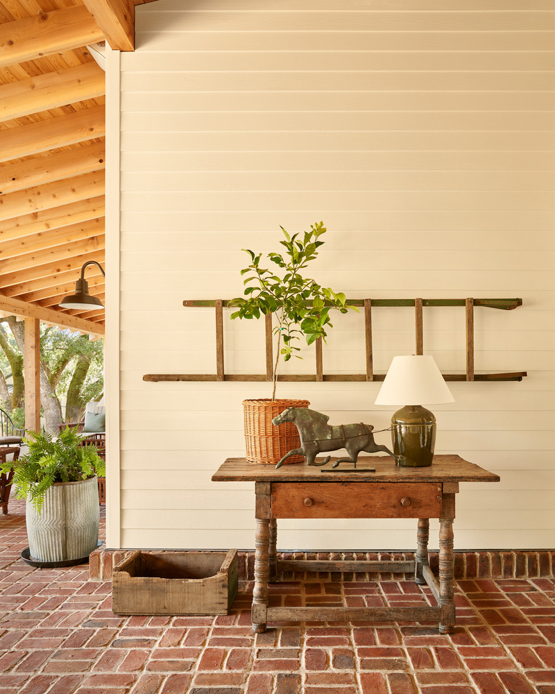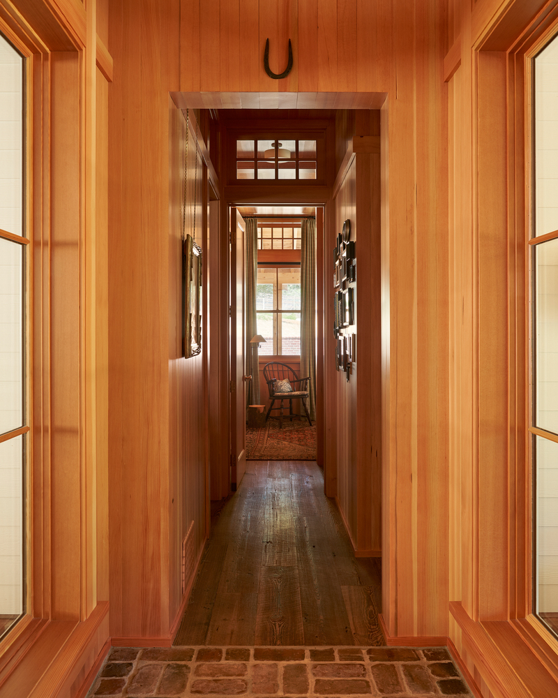 从外部看,新家的外观既尊重场地的乡村特质,也呼应了位于宽阔橡树屏风另一侧的历史农舍。如同其建筑前身,它采用明快的白色企口和 V 型槽壁板、美观的立柱以及直立锁边金属屋顶。环绕式带顶门廊不仅提供充足的遮阳保护,还通过建筑四面的高大法式门和顶部气窗引入微风,实现采光与通风。门廊的砖地面以篮纹图案铺设,并延伸至入口大厅,将室外与室内空间无缝衔接。