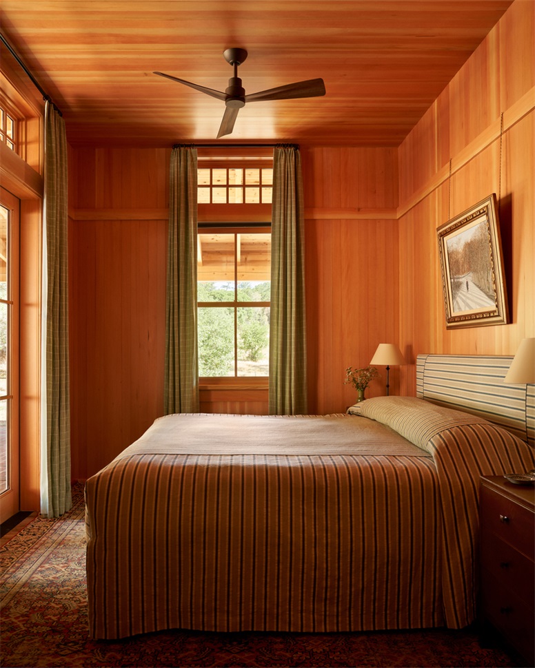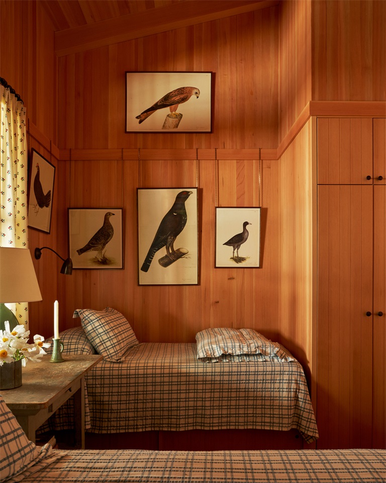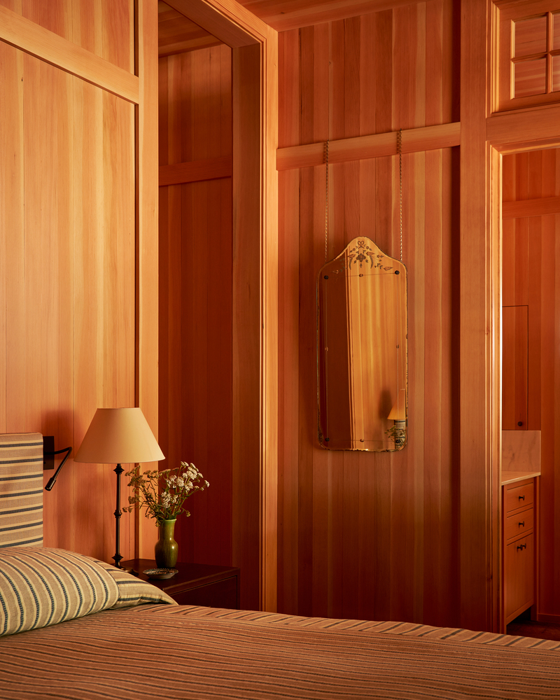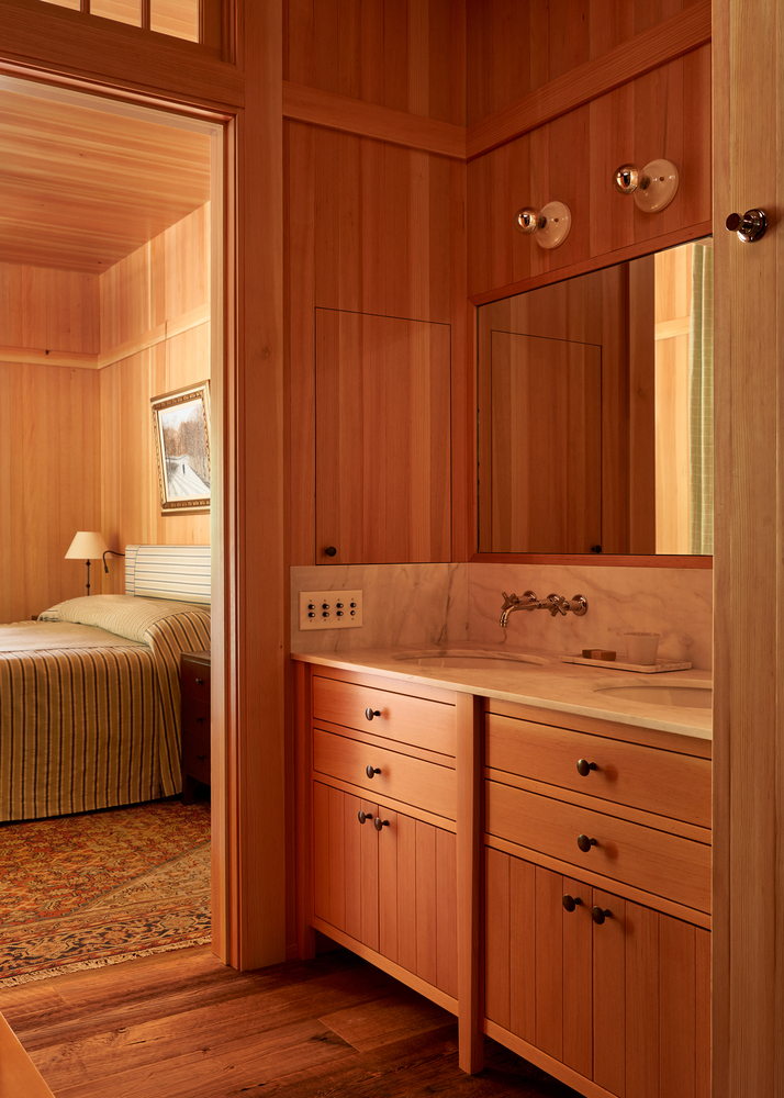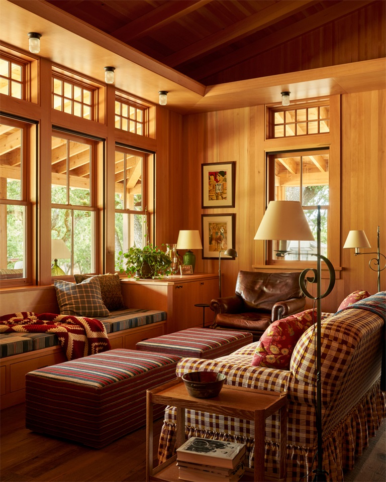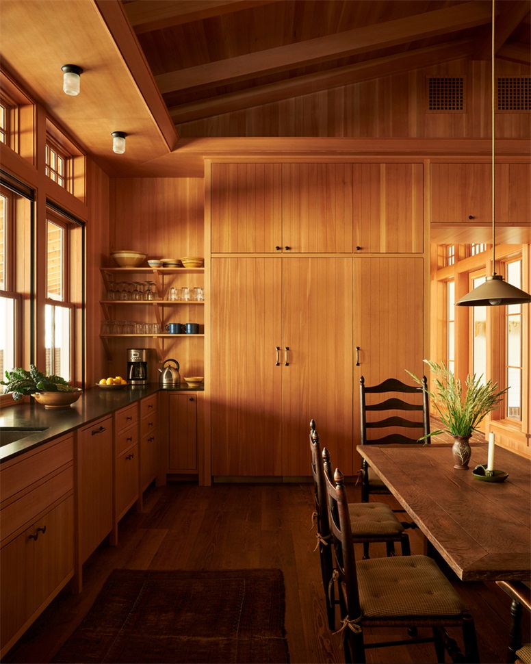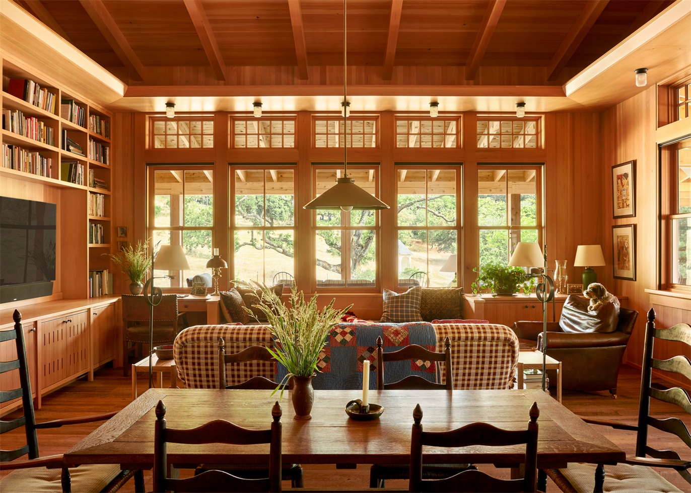 建筑元素采用手工砍伐的花旗松 —— 这种加州本土树种是西海岸历史室内设计的标志,为空间注入温暖与整体感。竖纹木板应用于墙面镶板、定制橱柜、嵌入式家具、书架、家电面板和衣橱等,此外还有定制细节,如客厅的灯架和环绕室内的画框线。