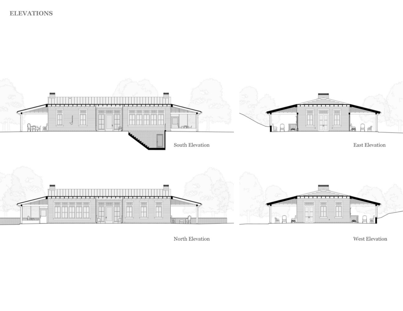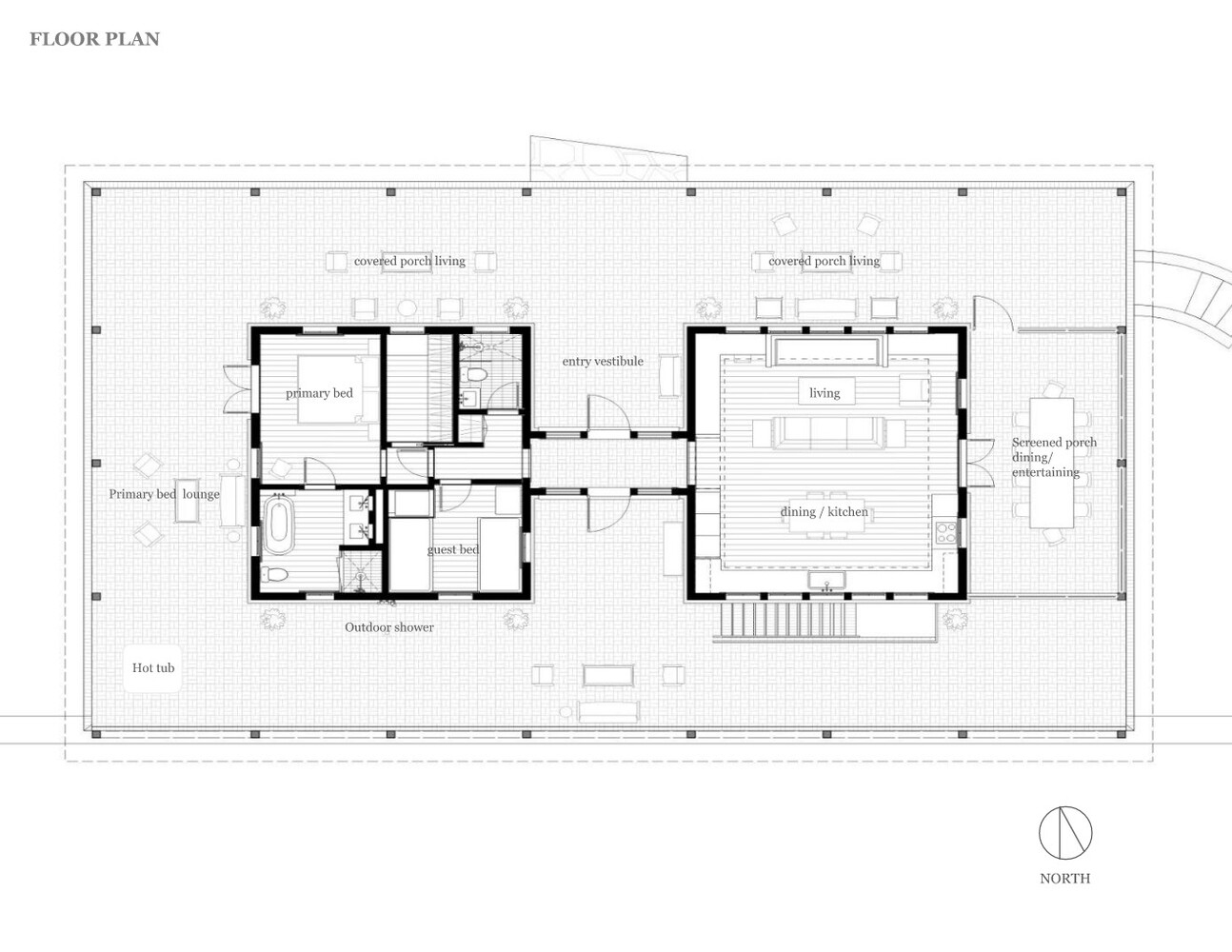 室内,经过精心设计的平面通过狭窄的入口走廊连接公共起居区与私密卧室区。公共区域包括大客厅、餐厅、厨房以及用于户外娱乐的屏风门廊;私密区域则包含带浴室和步入式衣橱的主卧室,以及尺度亲切的客用套房。