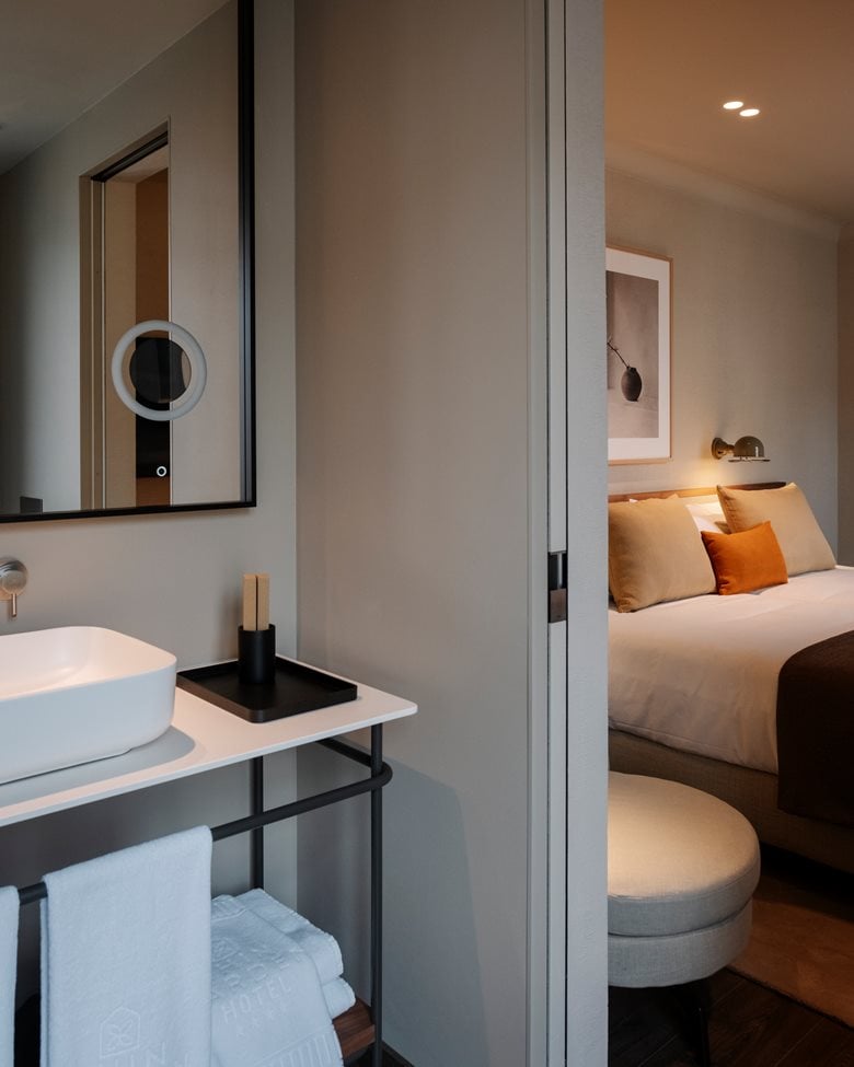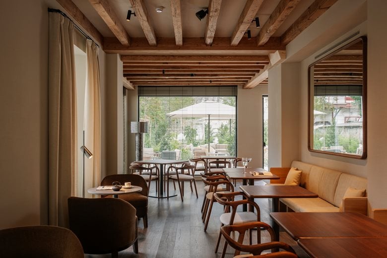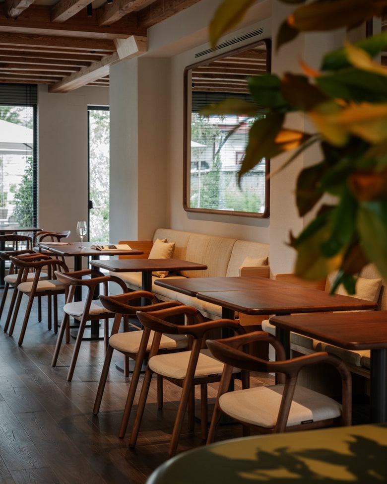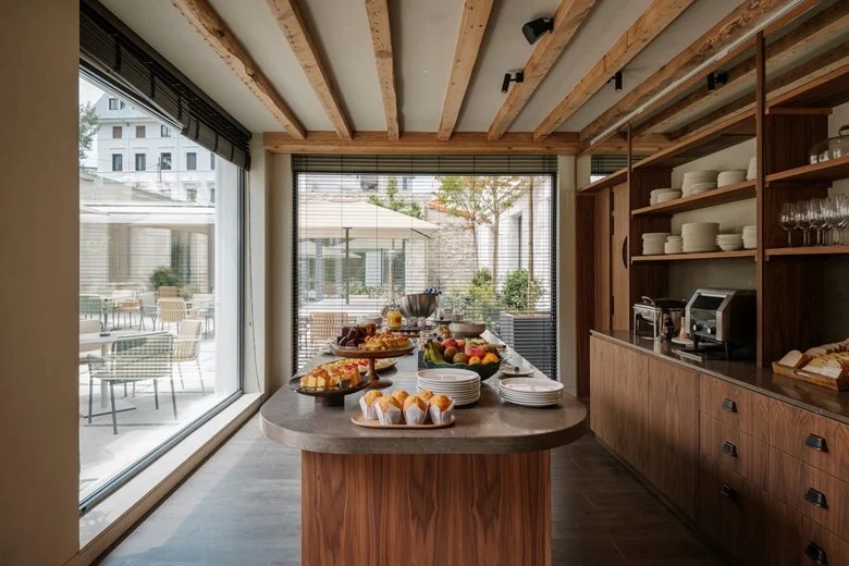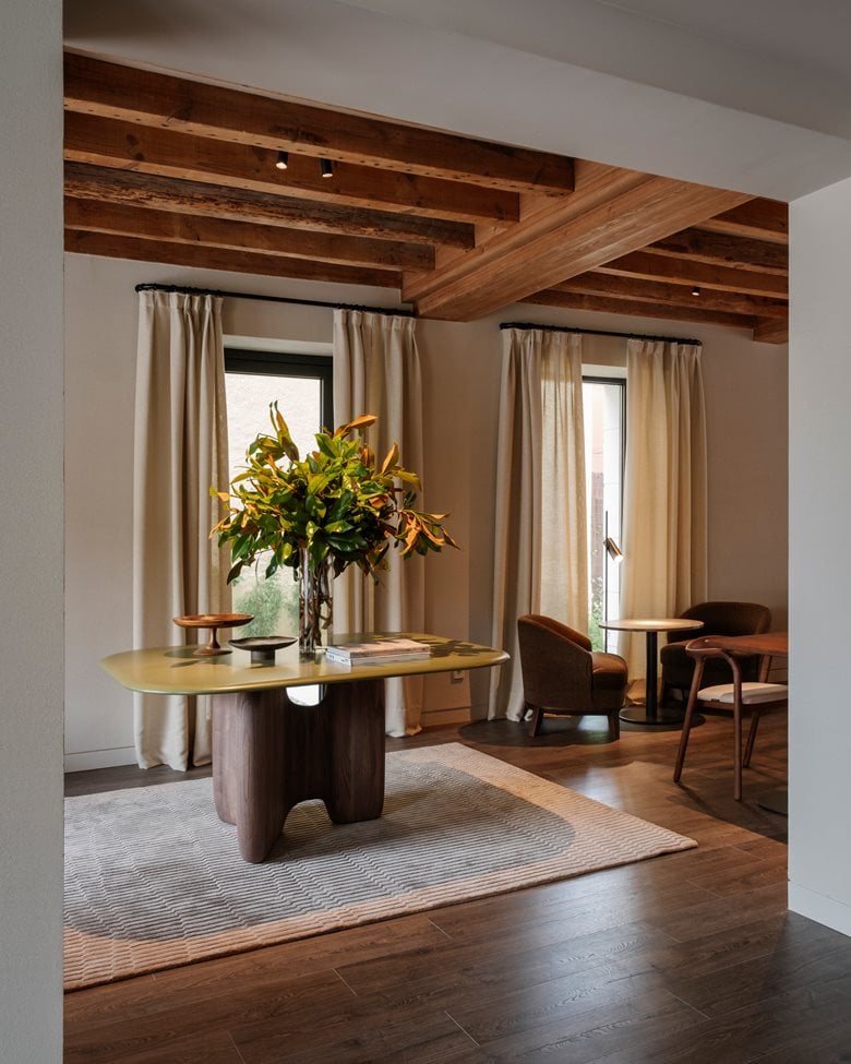 酒店内部以中性色调为主,裸露的木梁和胡桃木家具与之相得益彰。精心挑选的经典软装与精心布置的镜子相映成趣,镜子将花园景致引入室内,既凸显了户外景观的重要性,又营造出温暖宜人的氛围。此外,酒店还设计了一个带有开放式搁架的吧台区域,可适应一天中不同时段的需求:清晨作为早餐自助区,夜晚则变身鸡尾酒酒吧,是放松身心的绝佳去处。