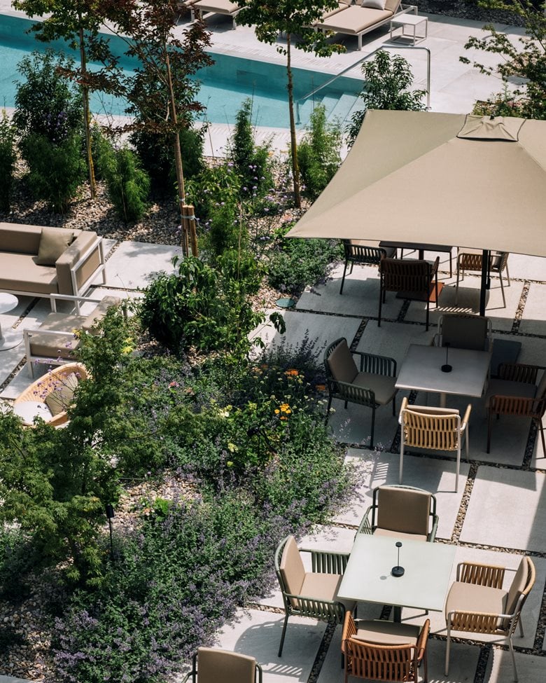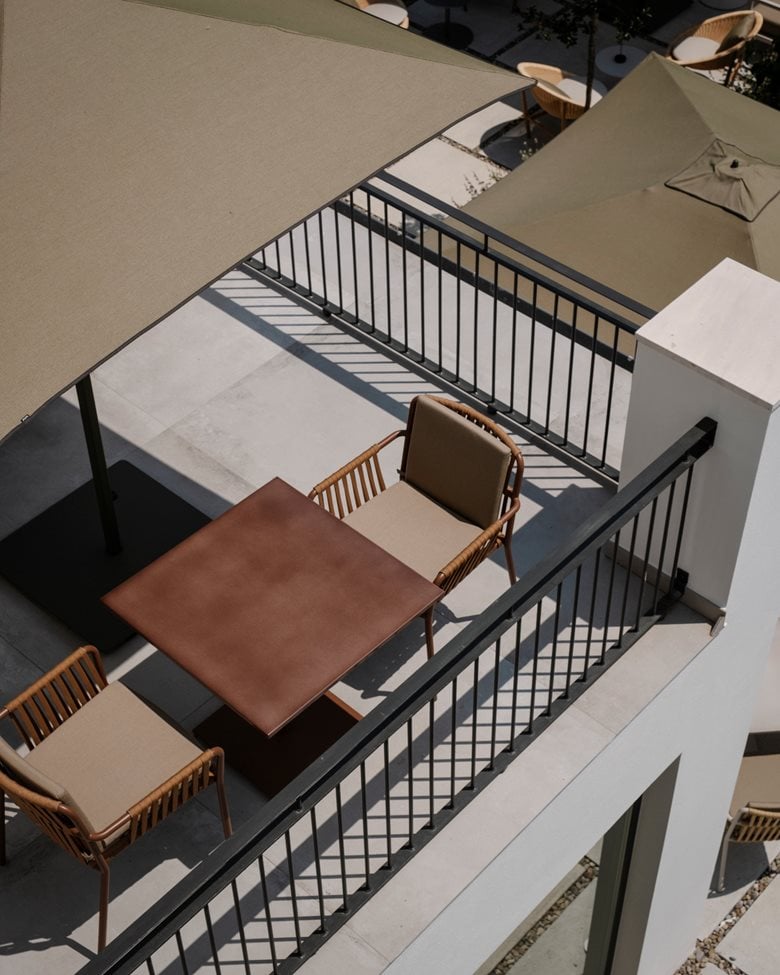 在这座气派的建筑中,建筑设计、室内设计与景观设计无缝交融。其特色在于白色外立面、深色木作和锌制屋顶,打造出兼具古典与都市风格,同时又极具现代感的设计语言。莱茵花园酒店设计中的公共区域(包括接待处、咖啡厅和客房)均由该事务所负责施工,布兰卡・科明(Blanca Comin)和哈维尔・乌巴戈(Javier Ubago)担任项目负责人,他们以独特的视野为每个空间注入了灵魂。
