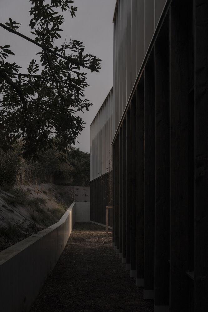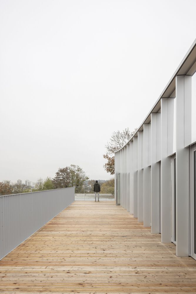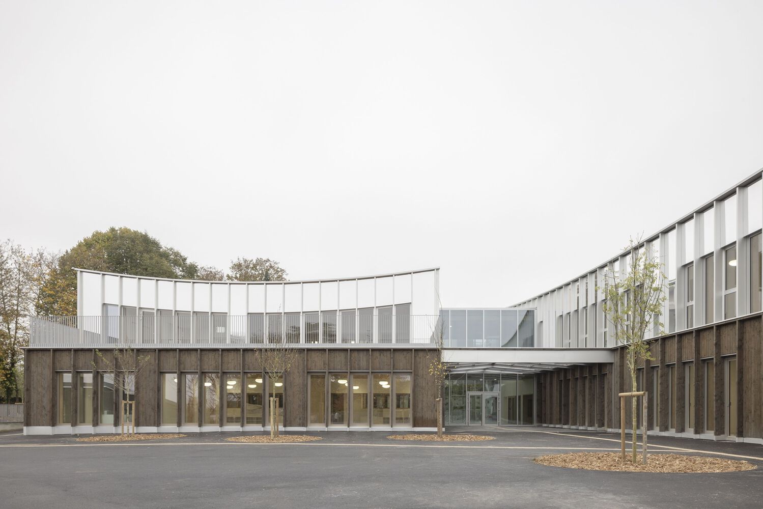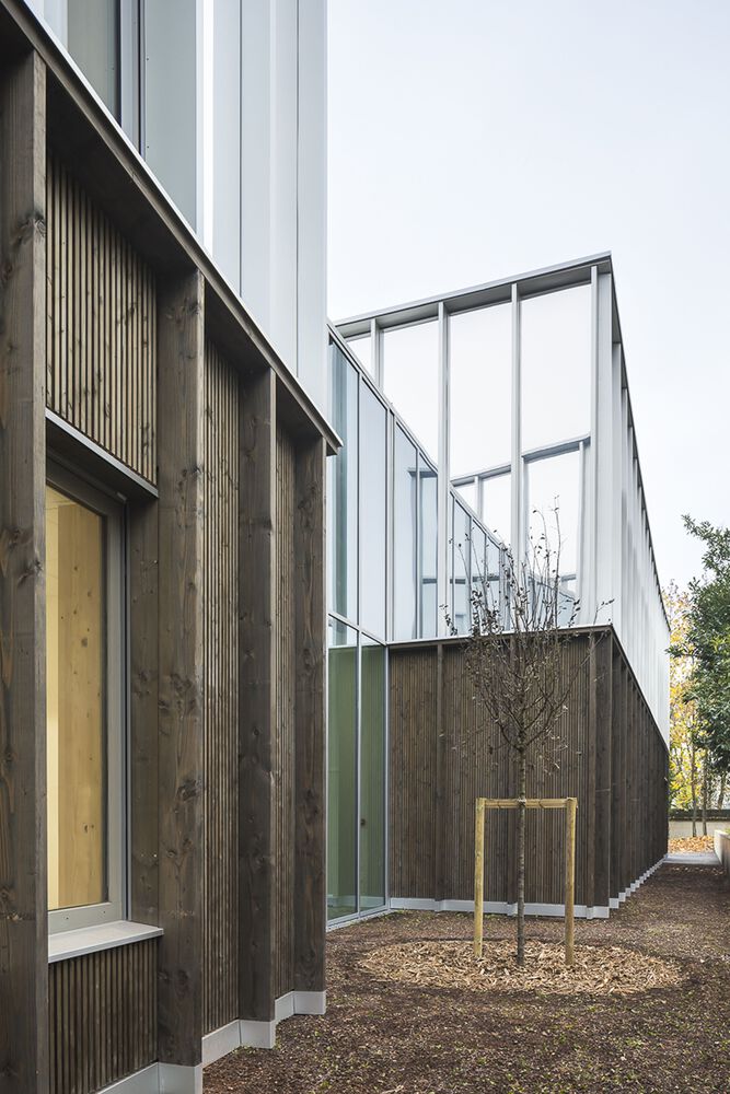 富有感染力且充满诗意的材料质感。选择轻质的法国预制木结构,减少了施工过程中的噪音和工期,将对场地的影响降至最低,同时学校社区仍可正常使用该场地。设计通过对底层和上层的不同处理,突出了结构的碎片化特点。底层是孩子们的视觉锚点,形成了一个向庭院广泛开放的基座。它覆盖着经过工厂处理的垂直木板条。这种由法国花旗松制成的覆层经过预老化处理,呈灰色,以确保其外观随时间推移保持稳定。上层则被一层由镜面铝板和玻璃窗间隔组成的反光表皮所环绕。建筑立面反射着树木的枝叶、天空和远处的风景,使建筑的外观和颜色随季节和天气而变化。柔和弯曲且紧绷的屋顶仿佛漂浮在庭院之上。