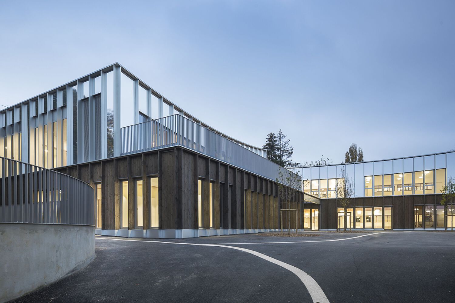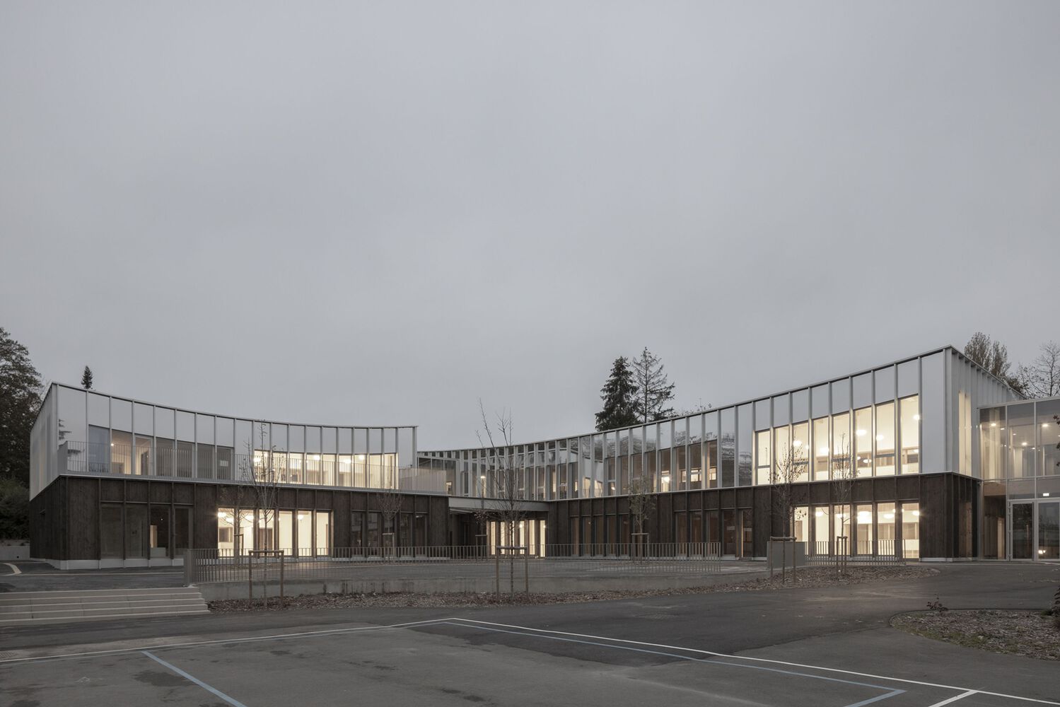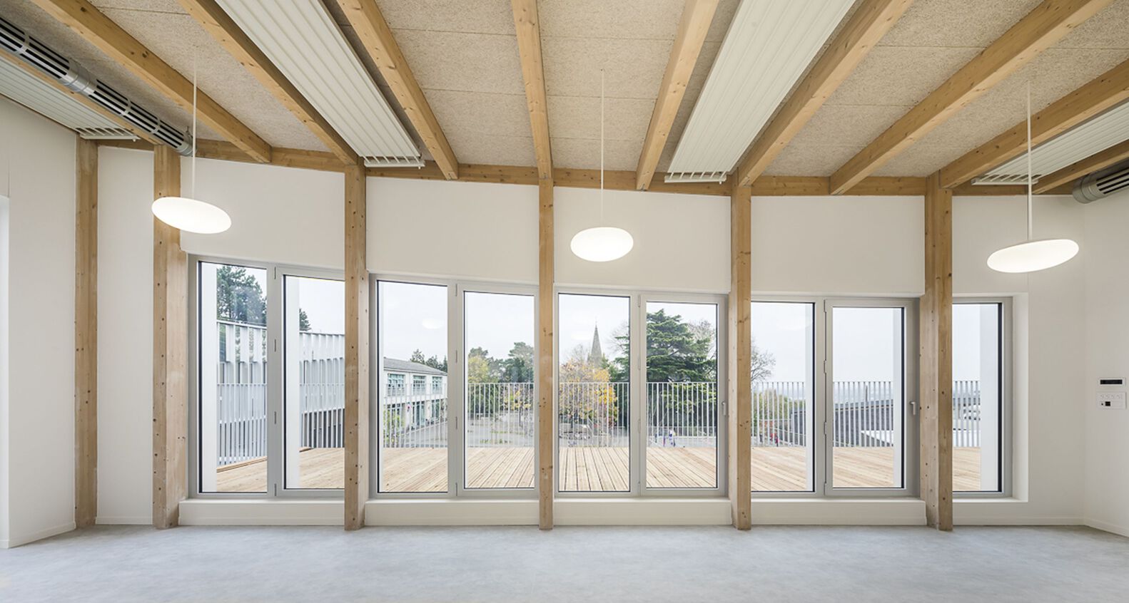 在建筑内部,优先使用原材料。木质框架全部外露,用于稳定结构的大厅预制混凝土墙则未做处理。声学效果通过放置在结构梁之间的压实天然木纤维来控制。隔热材料采用木丝。设施系统外露且整齐地整合在一起。建筑的紧凑设计优先考虑了操场空间,因此设置了中央走廊,两侧分布着各个房间。为了让这些空间自然采光,在分隔教室和走廊的墙壁上安装了窗户。这些流通空间的尽头也采用了玻璃材质,确保每个角落都能看到户外和周围的绿色景观。