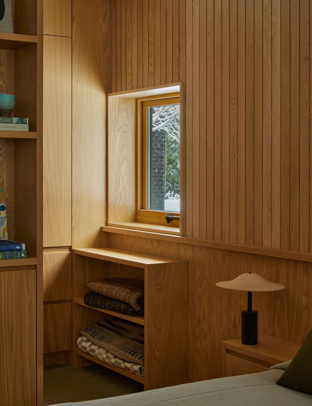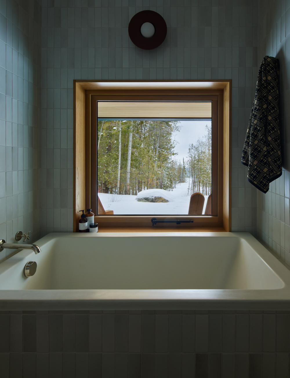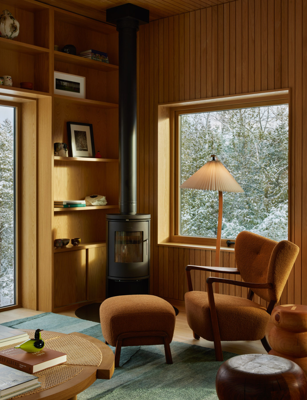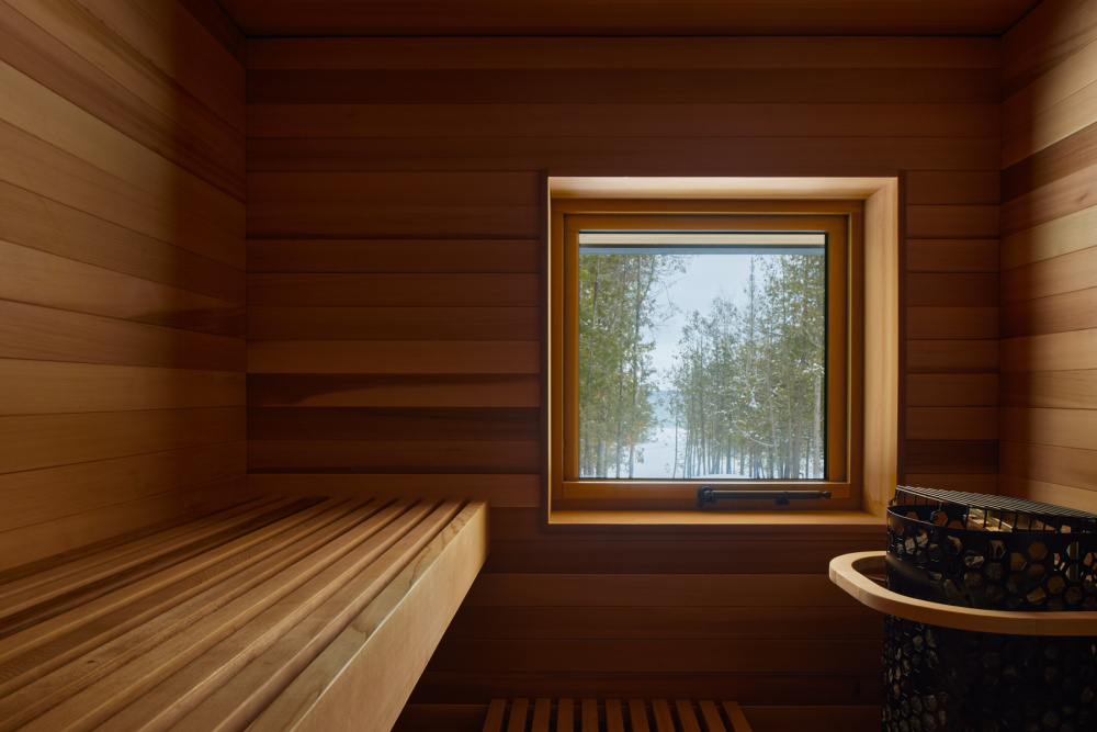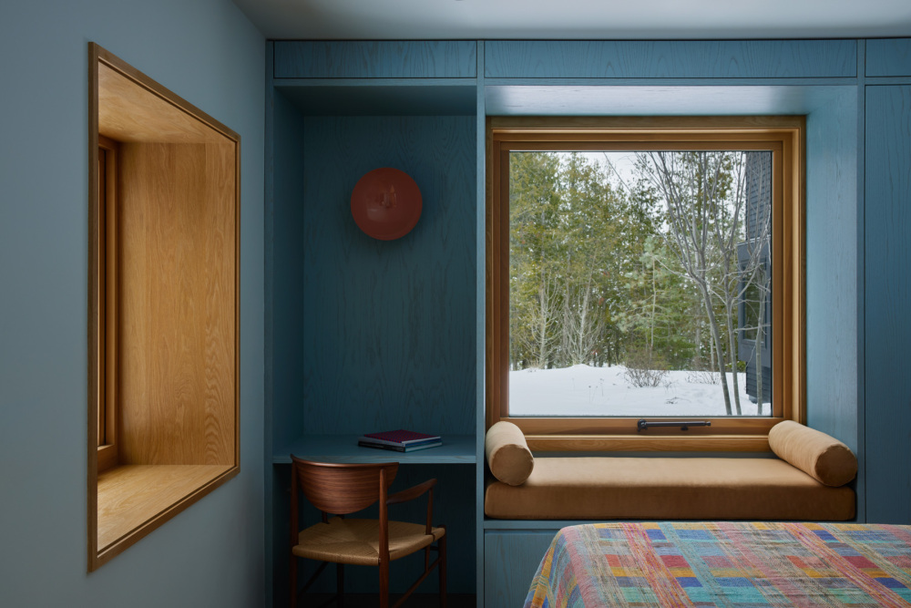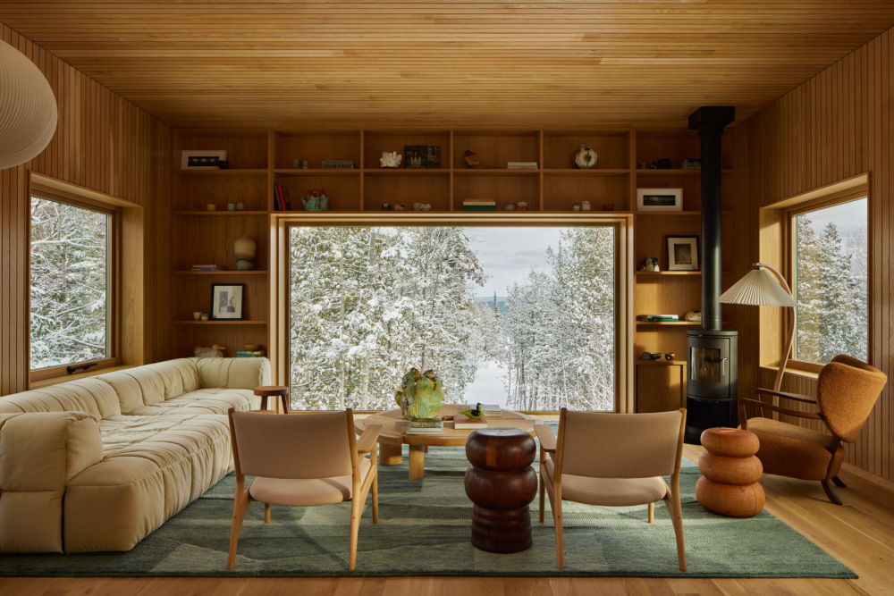 “让湖景成为空间的主角”,是里茨团队在室内设计中的核心目标。主客厅整面墙的巨幅观景落地窗,将密歇根湖的水色天光毫无保留地引入室内,成为空间最震撼的“天然装饰画”。如何避免大窗带来的视觉空泛,让室内与湖景形成自然对话,成为设计的关键挑战——里茨团队给出的答案,是“以书架为框”。环绕玻璃窗的木质书架,如同为湖景定制的画框,既为视线提供了自然落脚点,又通过层叠的书籍与摆件形成丰富视觉层次。这一设计非但没有遮挡湖景,反而通过材质的对比与线条的引导,将湖景的辽阔感进一步放大,让室内空间在“通透”与“深邃”之间找到平衡。“书架最终将目光引向窗外的湖面”,里茨的设计巧思,让湖景不再是孤立的景观,而是与室内生活融为一体的“空间组成部分”。类似的框景智慧遍布全屋:每座亭楼屋顶的镂空天窗与高侧窗,让天光以柔和的方式洒落,居者抬头便能望见天空的流云变幻;客房的软包飘窗与宽大木质窗台,将近景的针叶林、中景的起伏地势框成一幅幅精致小品。设计团队通过“大窗引湖、天窗引天、窗台引林”的三重策略,让居者在室内的每一个角落,都能与自然产生不同维度的对话。