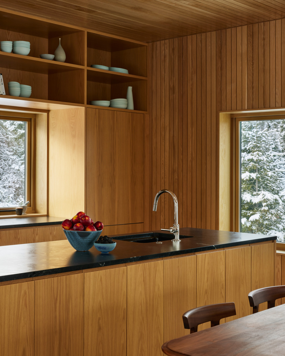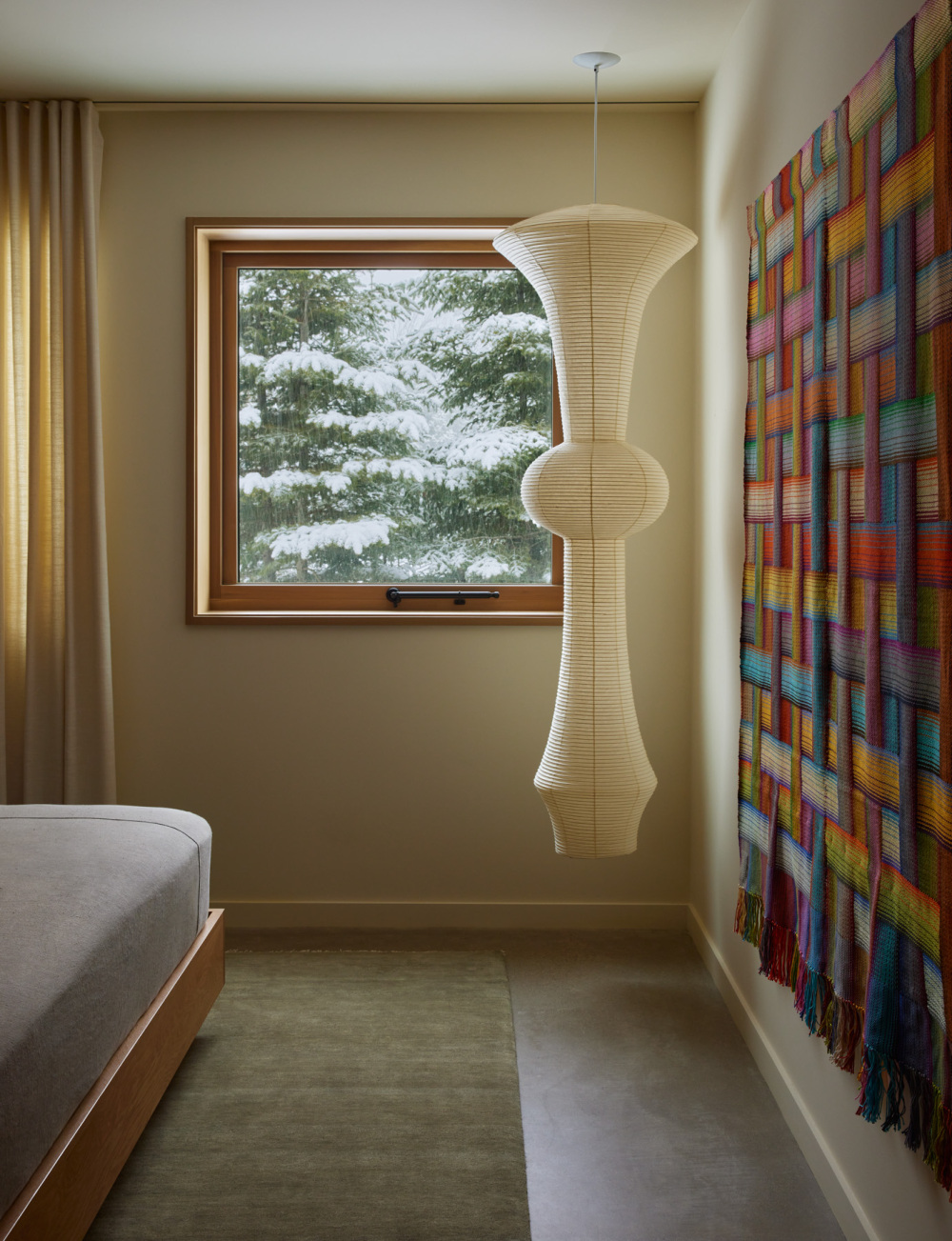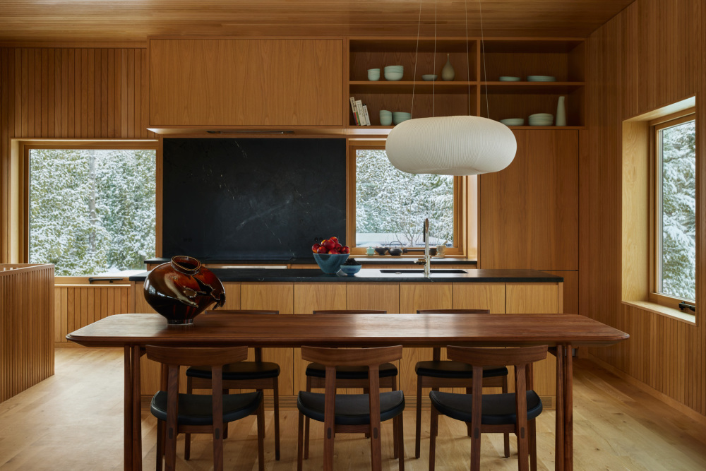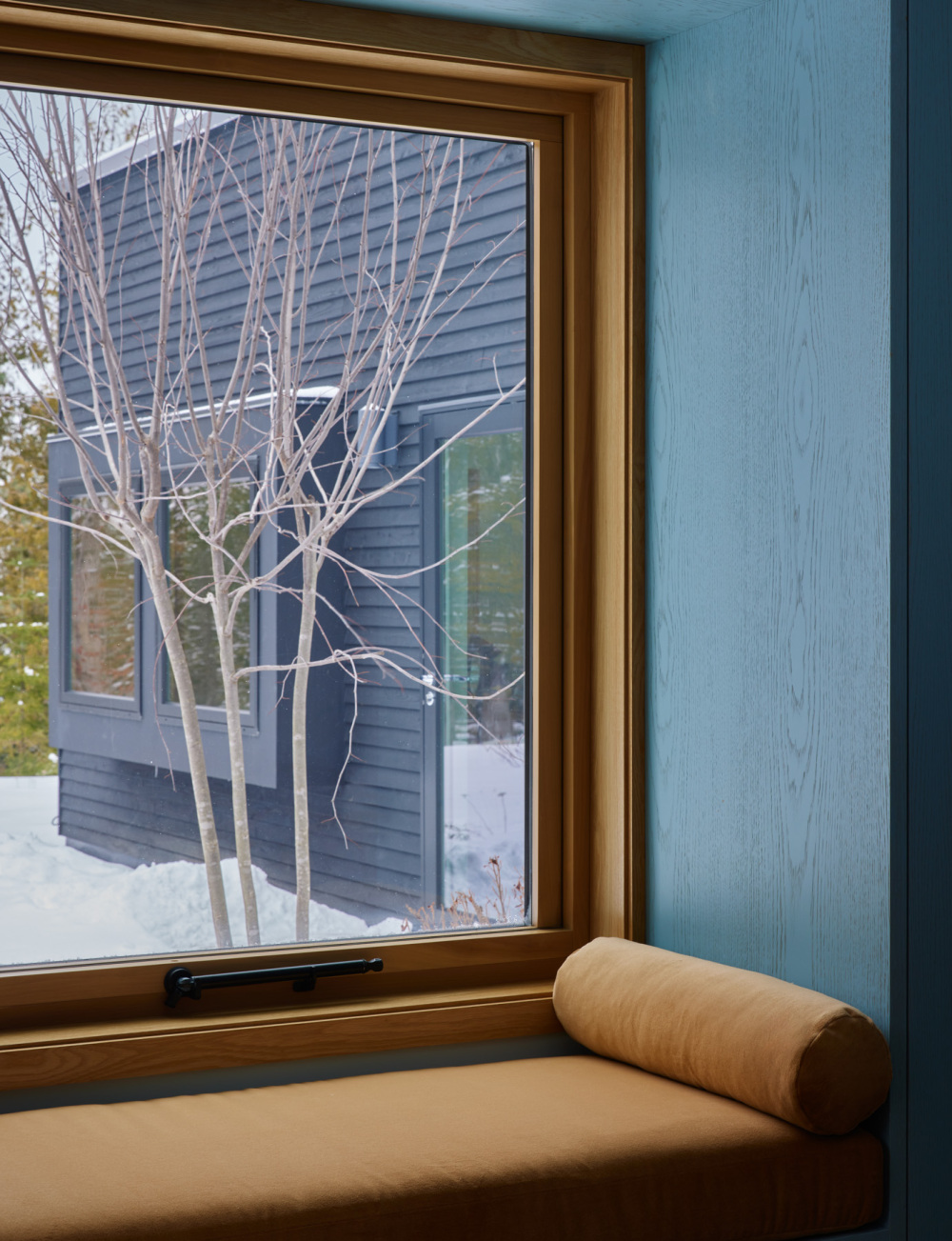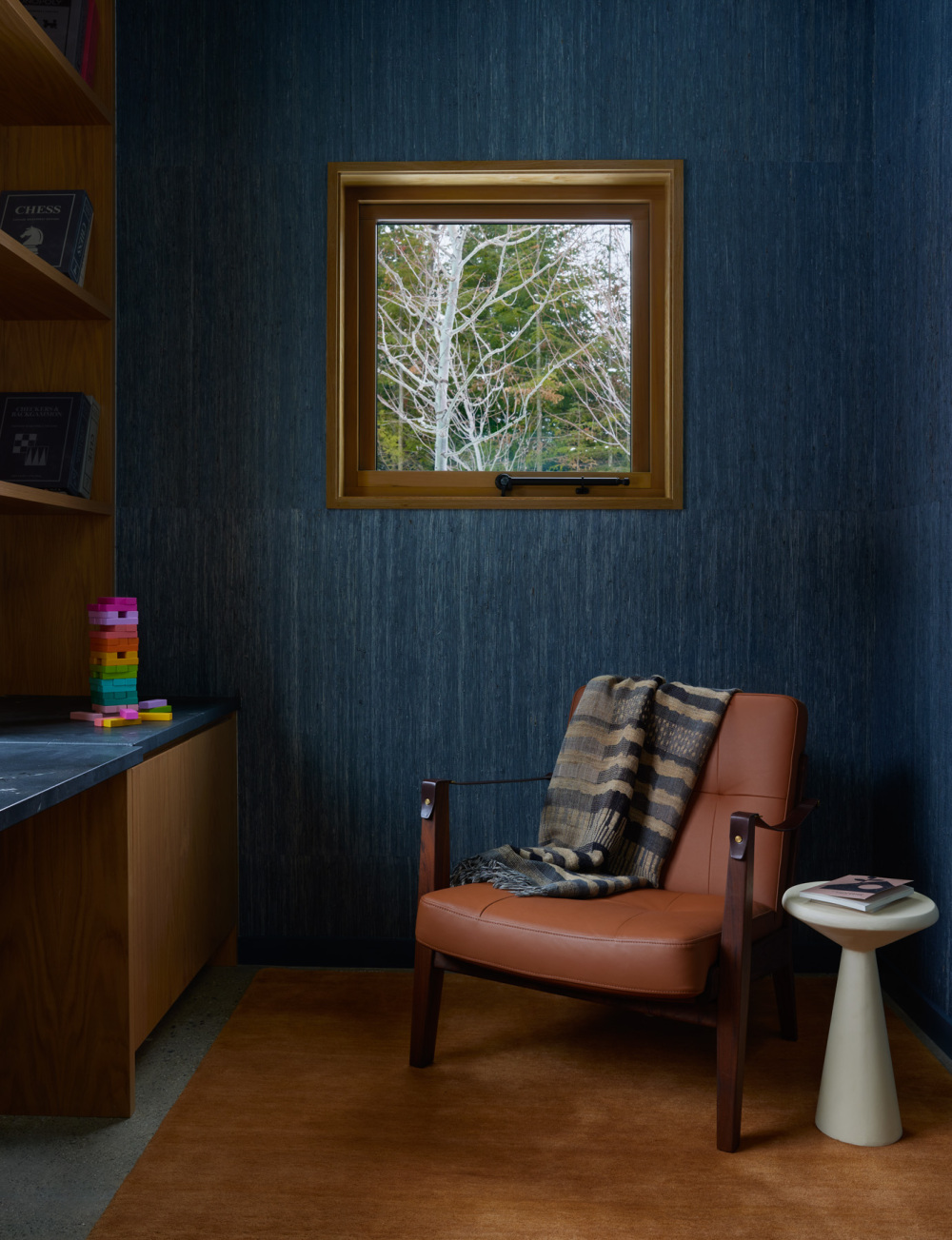 “让湖景成为空间的主角”,是里茨团队在室内设计中的核心目标。主客厅整面墙的巨幅观景落地窗,将密歇根湖的水色天光毫无保留地引入室内,成为空间最震撼的“天然装饰画”。如何避免大窗带来的视觉空泛,让室内与湖景形成自然对话,成为设计的关键挑战——里茨团队给出的答案,是“以书架为框”。环绕玻璃窗的木质书架,如同为湖景定制的画框,既为视线提供了自然落脚点,又通过层叠的书籍与摆件形成丰富视觉层次。这一设计非但没有遮挡湖景,反而通过材质的对比与线条的引导,将湖景的辽阔感进一步放大,让室内空间在“通透”与“深邃”之间找到平衡。“书架最终将目光引向窗外的湖面”,里茨的设计巧思,让湖景不再是孤立的景观,而是与室内生活融为一体的“空间组成部分”。类似的框景智慧遍布全屋:每座亭楼屋顶的镂空天窗与高侧窗,让天光以柔和的方式洒落,居者抬头便能望见天空的流云变幻;客房的软包飘窗与宽大木质窗台,将近景的针叶林、中景的起伏地势框成一幅幅精致小品。设计团队通过“大窗引湖、天窗引天、窗台引林”的三重策略,让居者在室内的每一个角落,都能与自然产生不同维度的对话。