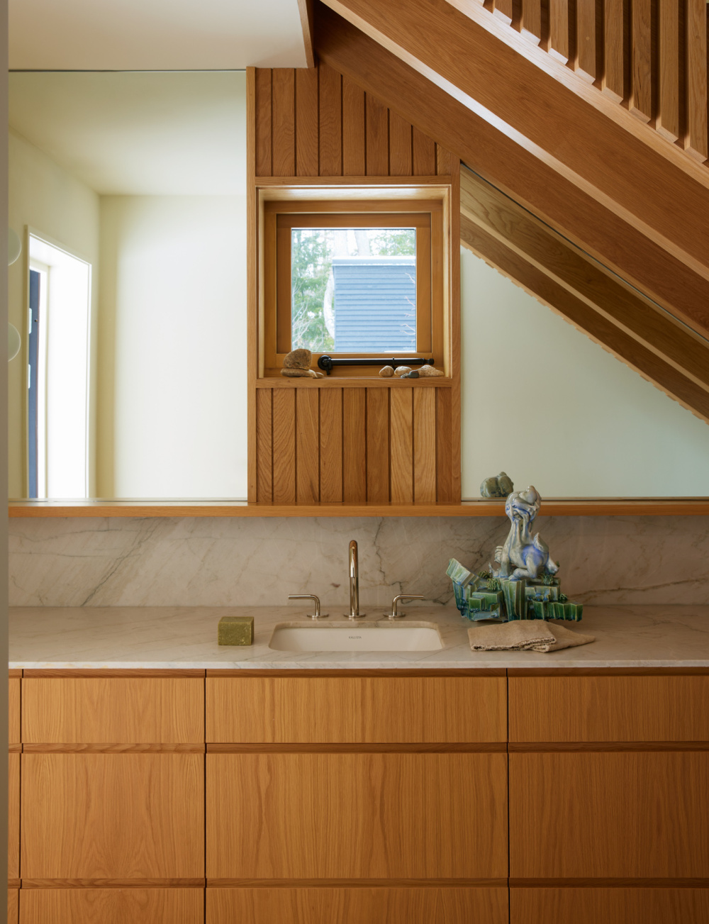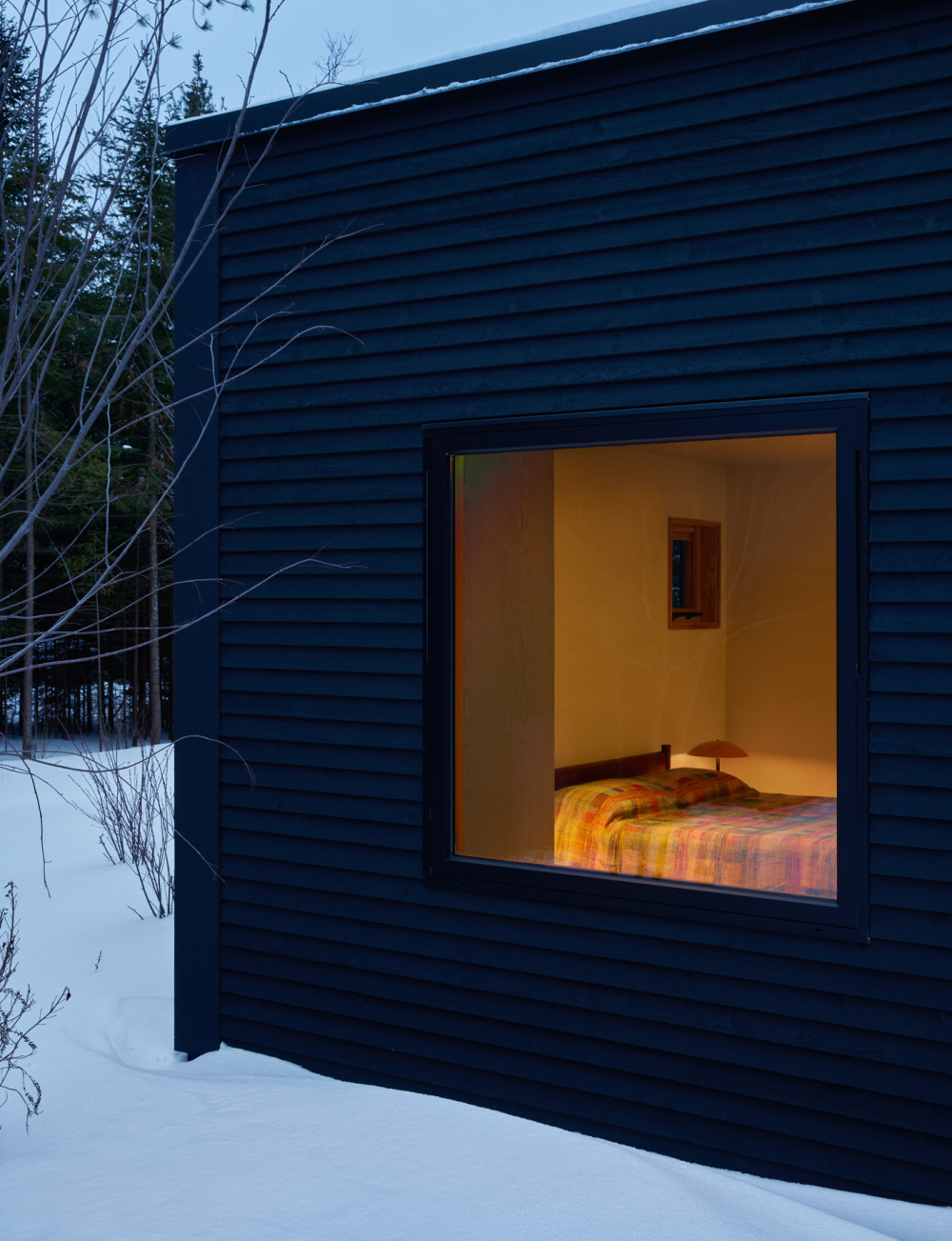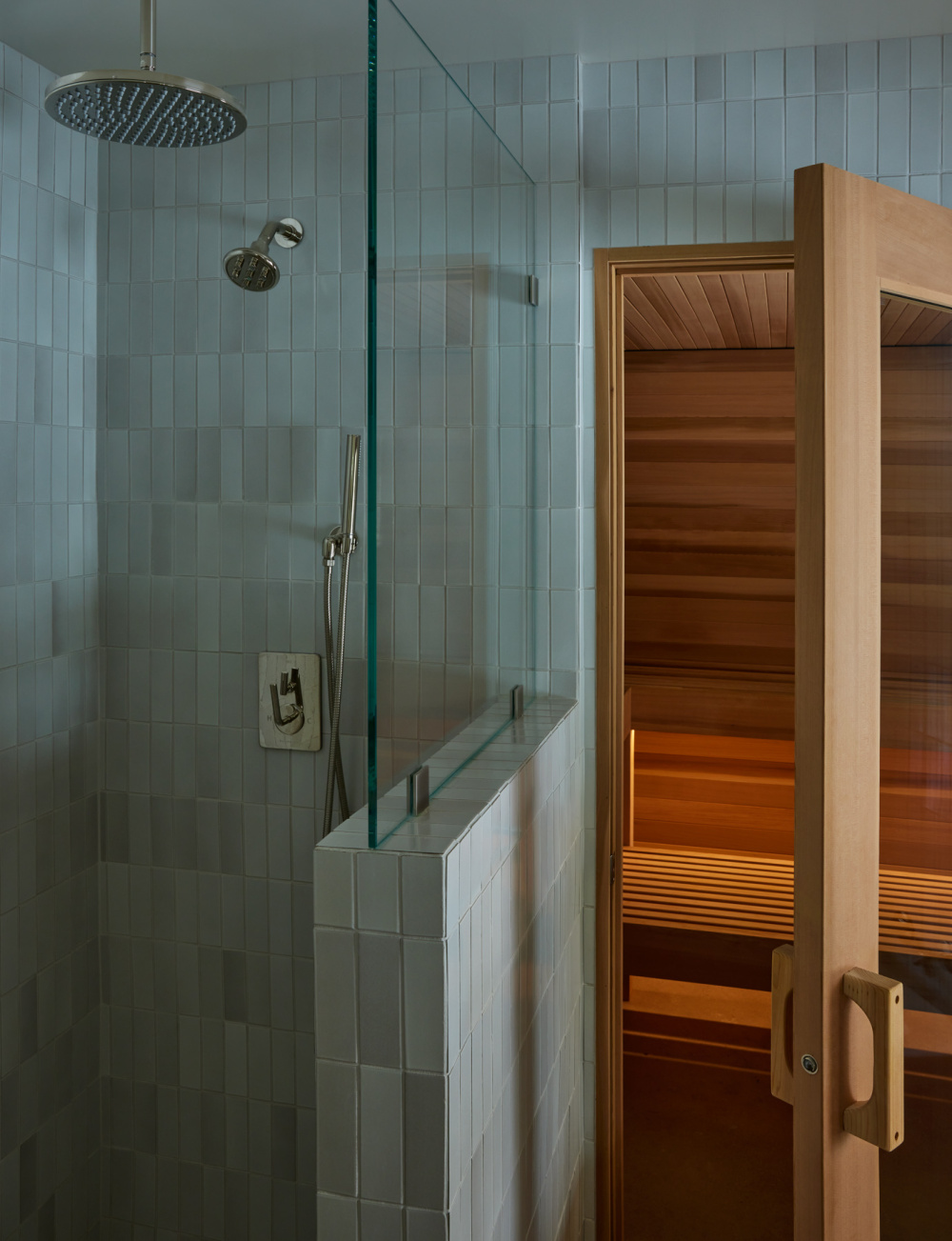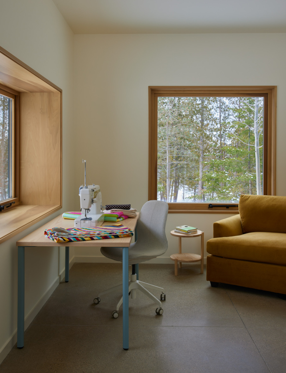 “让湖景成为空间的主角”,是里茨团队在室内设计中的核心目标。主客厅整面墙的巨幅观景落地窗,将密歇根湖的水色天光毫无保留地引入室内,成为空间最震撼的“天然装饰画”。如何避免大窗带来的视觉空泛,让室内与湖景形成自然对话,成为设计的关键挑战——里茨团队给出的答案,是“以书架为框”。环绕玻璃窗的木质书架,如同为湖景定制的画框,既为视线提供了自然落脚点,又通过层叠的书籍与摆件形成丰富视觉层次。这一设计非但没有遮挡湖景,反而通过材质的对比与线条的引导,将湖景的辽阔感进一步放大,让室内空间在“通透”与“深邃”之间找到平衡。“书架最终将目光引向窗外的湖面”,里茨的设计巧思,让湖景不再是孤立的景观,而是与室内生活融为一体的“空间组成部分”。类似的框景智慧遍布全屋:每座亭楼屋顶的镂空天窗与高侧窗,让天光以柔和的方式洒落,居者抬头便能望见天空的流云变幻;客房的软包飘窗与宽大木质窗台,将近景的针叶林、中景的起伏地势框成一幅幅精致小品。设计团队通过“大窗引湖、天窗引天、窗台引林”的三重策略,让居者在室内的每一个角落,都能与自然产生不同维度的对话。