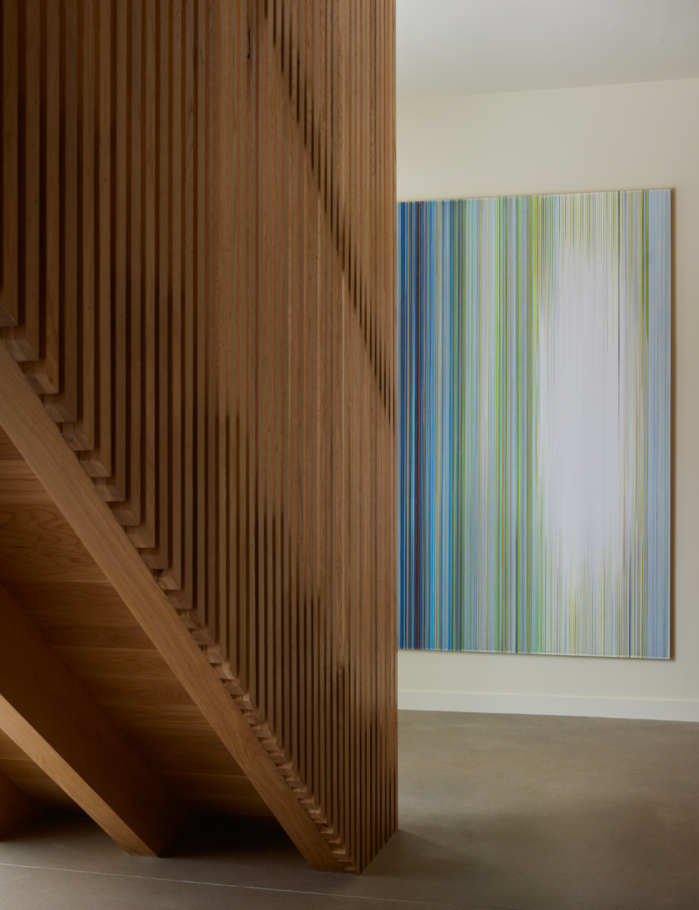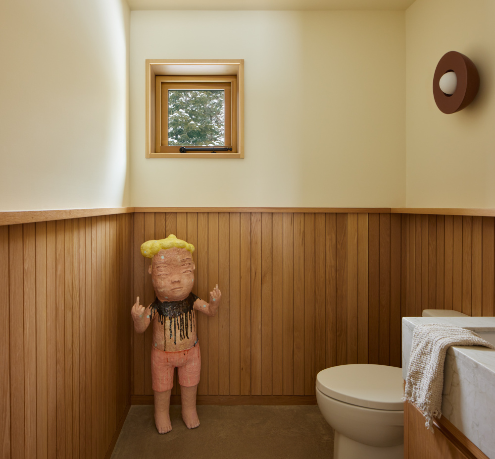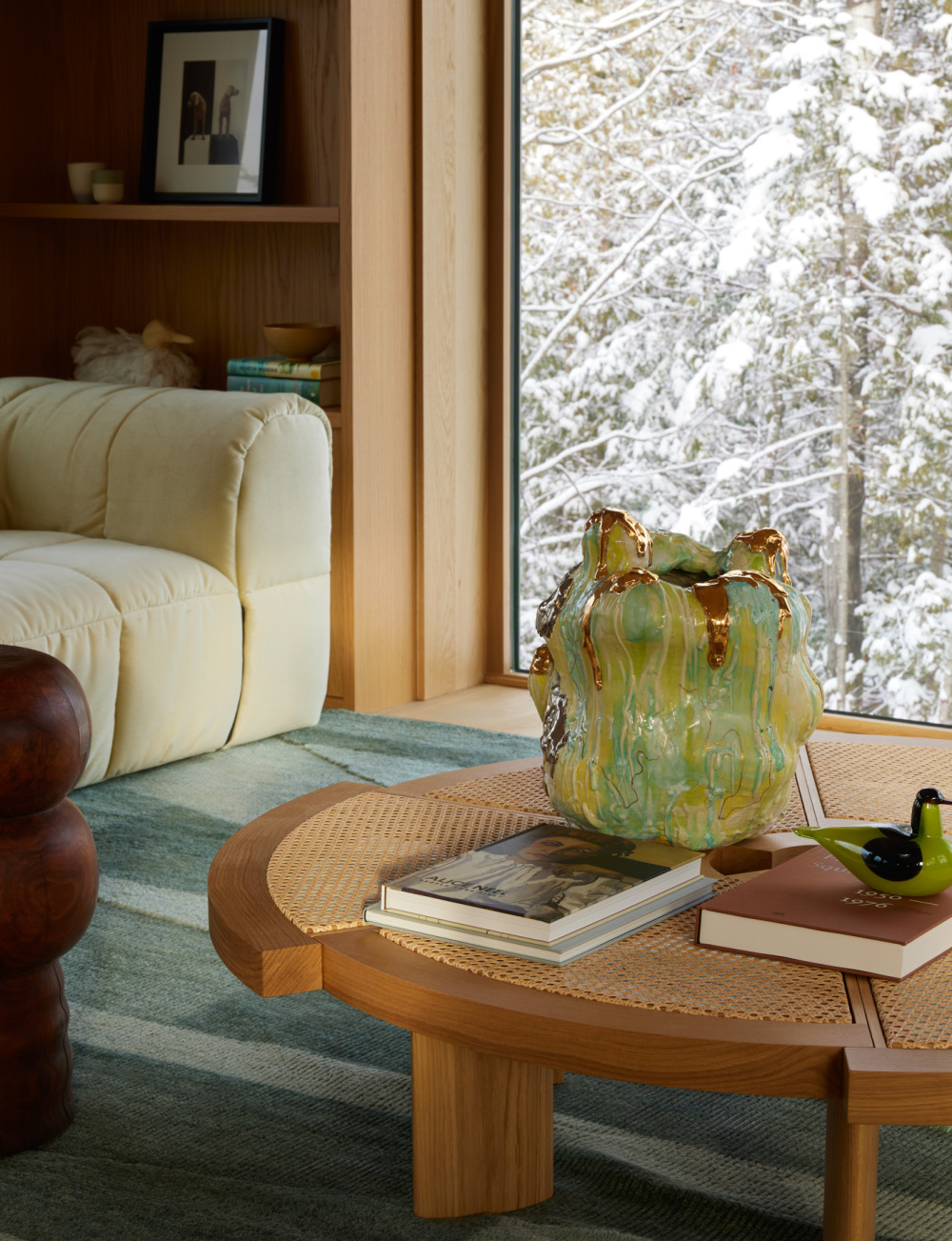斯堪的纳维亚风格的核心——“材质的本真与温度”,在别墅室内得到了充分诠释。设计团队以橡木为主要材质,从地板、墙面到天花板,温润的木纹与场地周边的林木环境形成呼应,为空间奠定了温暖的基调。混凝土的冷硬、天然石材的肌理、瓷砖的细腻与织物地毯的柔软,与橡木搭配形成多元质感层次,既丰富了触觉体验,又平衡了木质的单一感。里茨形容冬日置身室内的感受“如同裹上了一条温暖的毛毯”,这份温度感,正是材质与生活需求对话的结果。色彩设计则以“湖光为灵感”,蓝绿色为主调的配色方案,既呼应了密歇根湖的水色,又为空间注入了宁静舒缓的氛围。浅灰的墙面、米白的软装与蓝绿的点缀,构成了北欧风格特有的清爽质感,与窗外四季变换的湖景形成动态呼应——春日湖波的嫩绿、夏日晴空的湛蓝、秋日湖水的深碧,都能在室内色彩中找到共鸣。当代艺术藏品与手工摆件则为空间注入了个性活力:手工编织挂毯的纹理、色彩明快的墙面艺术品、造型独特的手工陶艺,以巧妙的方式点缀在空间中,既呼应了妻子的艺术家身份,又为解构主义的建筑框架赋予了灵动的人文气息,让别墅从“设计作品”转变为有温度的“家”。