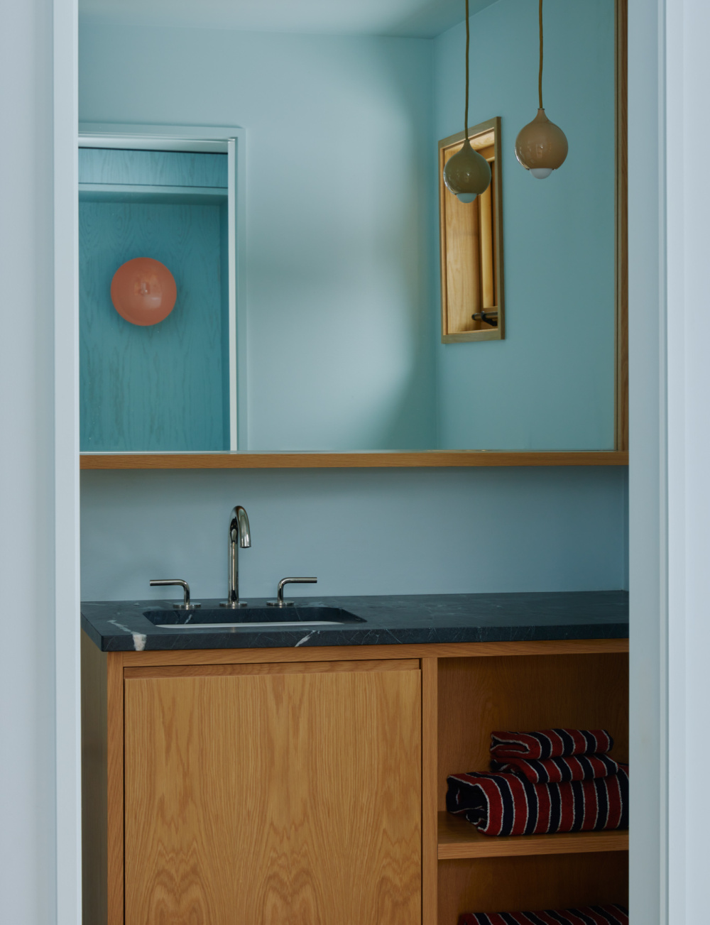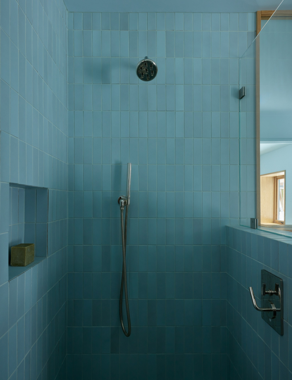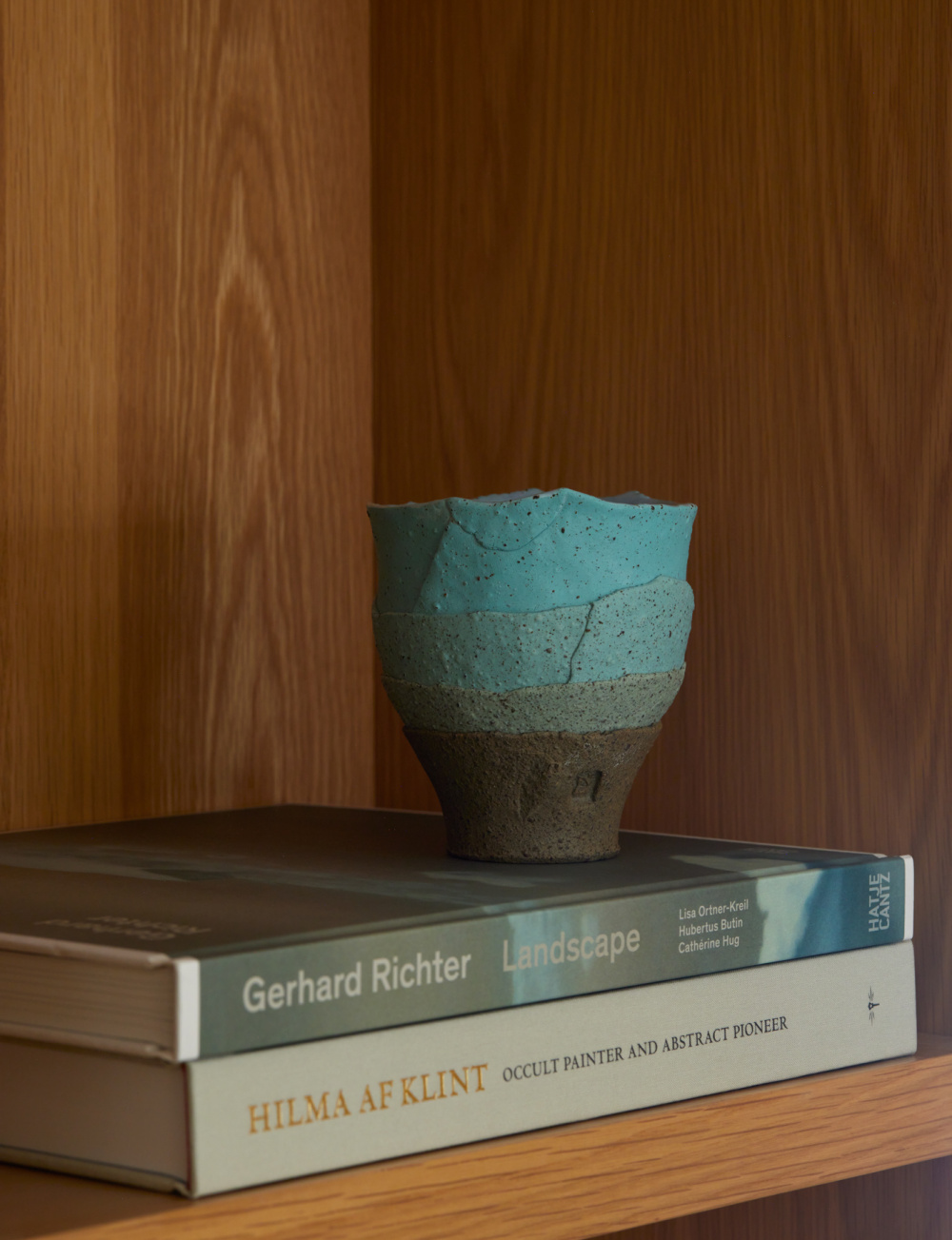 斯堪的纳维亚风格的核心——“材质的本真与温度”,在别墅室内得到了充分诠释。设计团队以橡木为主要材质,从地板、墙面到天花板,温润的木纹与场地周边的林木环境形成呼应,为空间奠定了温暖的基调。混凝土的冷硬、天然石材的肌理、瓷砖的细腻与织物地毯的柔软,与橡木搭配形成多元质感层次,既丰富了触觉体验,又平衡了木质的单一感。里茨形容冬日置身室内的感受“如同裹上了一条温暖的毛毯”,这份温度感,正是材质与生活需求对话的结果。色彩设计则以“湖光为灵感”,蓝绿色为主调的配色方案,既呼应了密歇根湖的水色,又为空间注入了宁静舒缓的氛围。浅灰的墙面、米白的软装与蓝绿的点缀,构成了北欧风格特有的清爽质感,与窗外四季变换的湖景形成动态呼应——春日湖波的嫩绿、夏日晴空的湛蓝、秋日湖水的深碧,都能在室内色彩中找到共鸣。当代艺术藏品与手工摆件则为空间注入了个性活力:手工编织挂毯的纹理、色彩明快的墙面艺术品、造型独特的手工陶艺,以巧妙的方式点缀在空间中,既呼应了妻子的艺术家身份,又为解构主义的建筑框架赋予了灵动的人文气息,让别墅从“设计作品”转变为有温度的“家”。