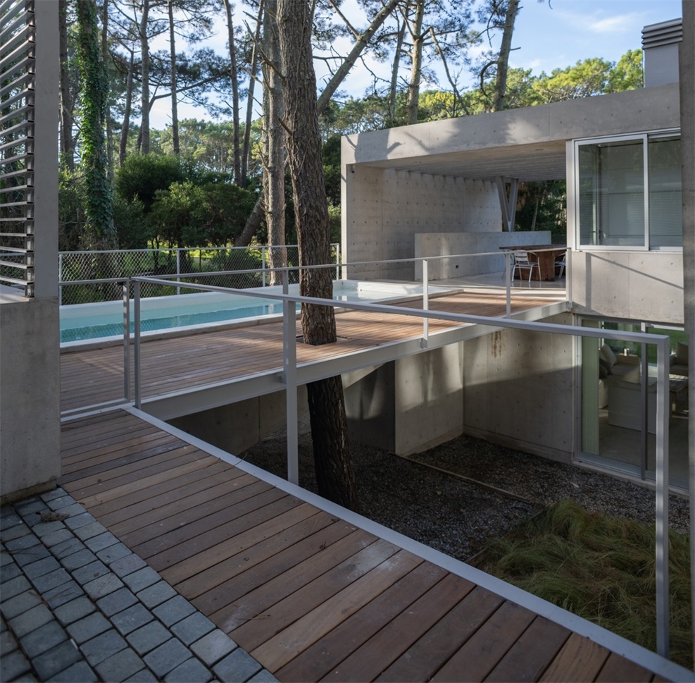 不同空间围绕一个 “虚拟枢纽” 连接 —— 这是场地中心保留的一个自然庭院形成的空隙。该区域不仅是内部和外部路径的连接点,还充当大型雨水蓄水池,并通过分隔住宅与街道及停车场,保障了私密性。庭院西北侧设有一个悬浮泳池,其设计如同雕塑般的体量,部分 “漂浮” 于场地之上。