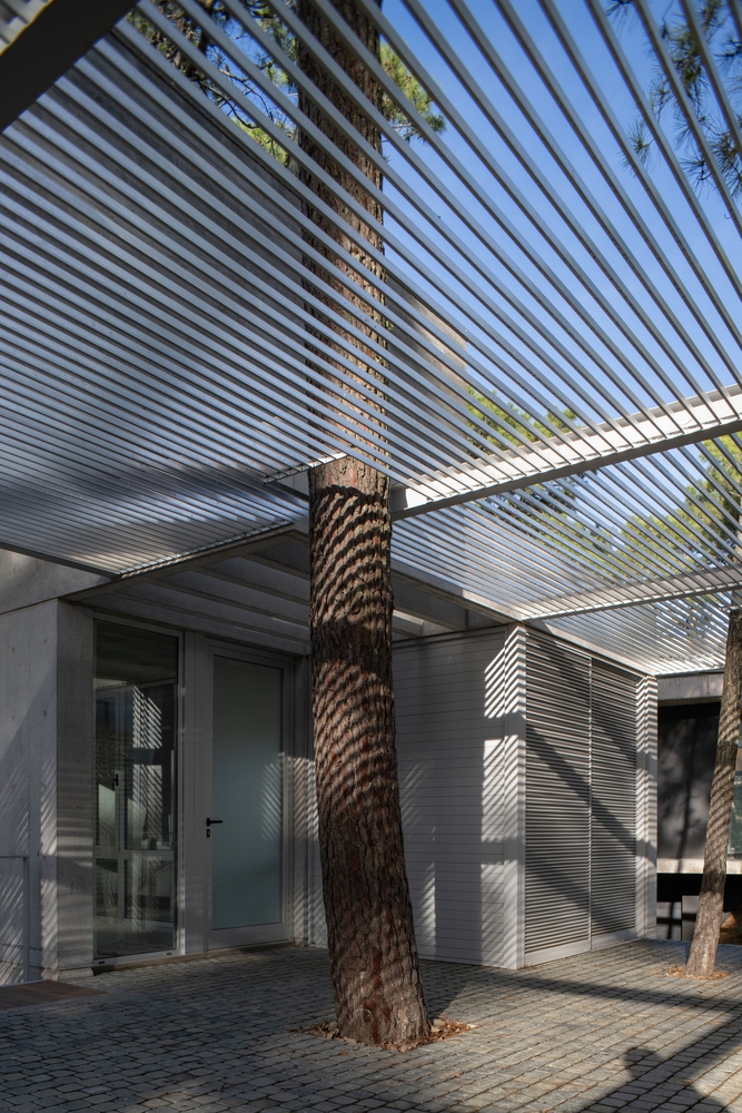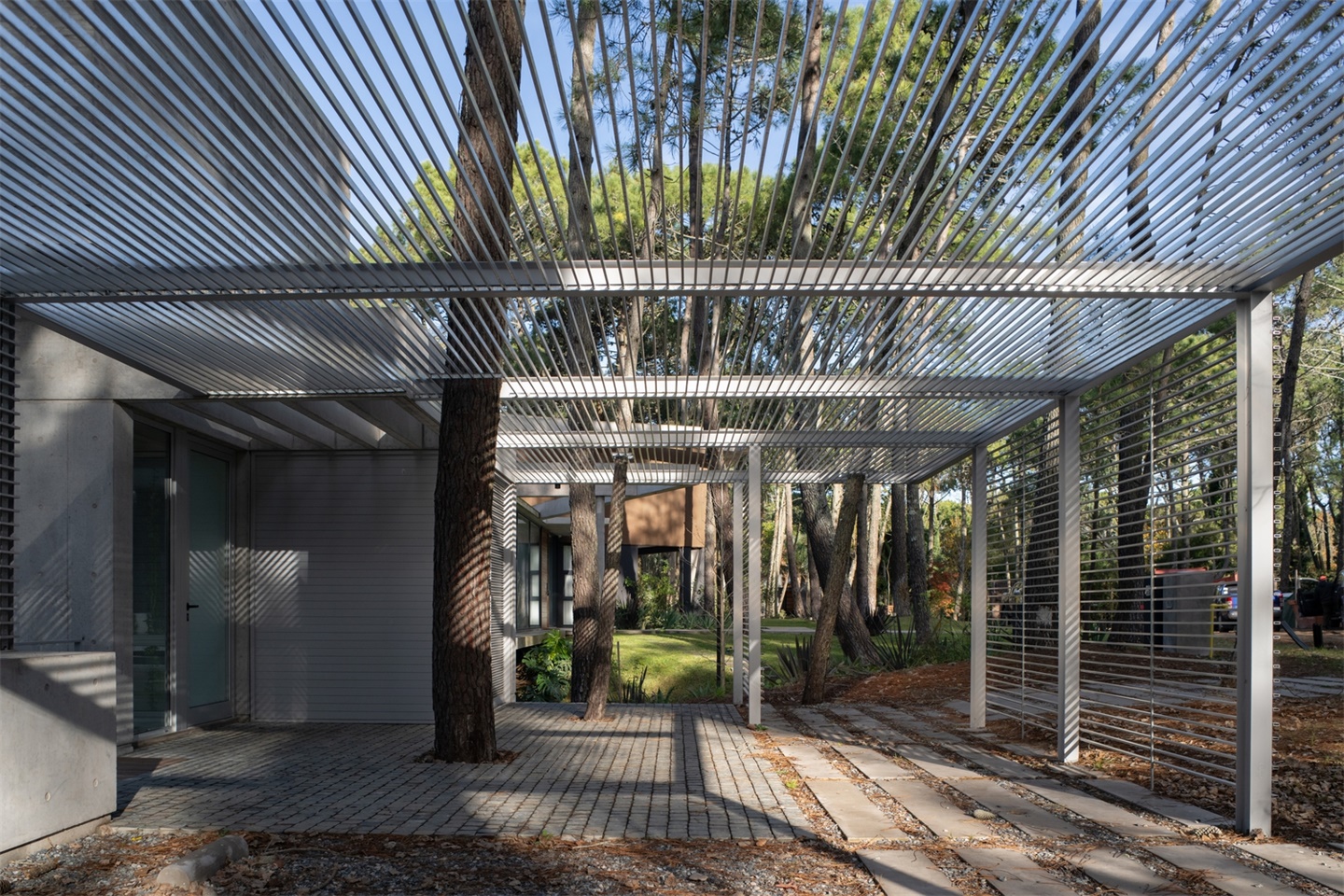 在临街立面及建筑范围内,乔伊克住宅复刻了高尔夫球场的建筑体量,形成一个 “封闭的空隙”—— 由小型铝板构成的箱体不仅塑造了新空间的形态,还作为垂直过滤器,为车辆遮挡阳光和落枝。此外,通过带有不同植被的面板,保障了入口的私密性。