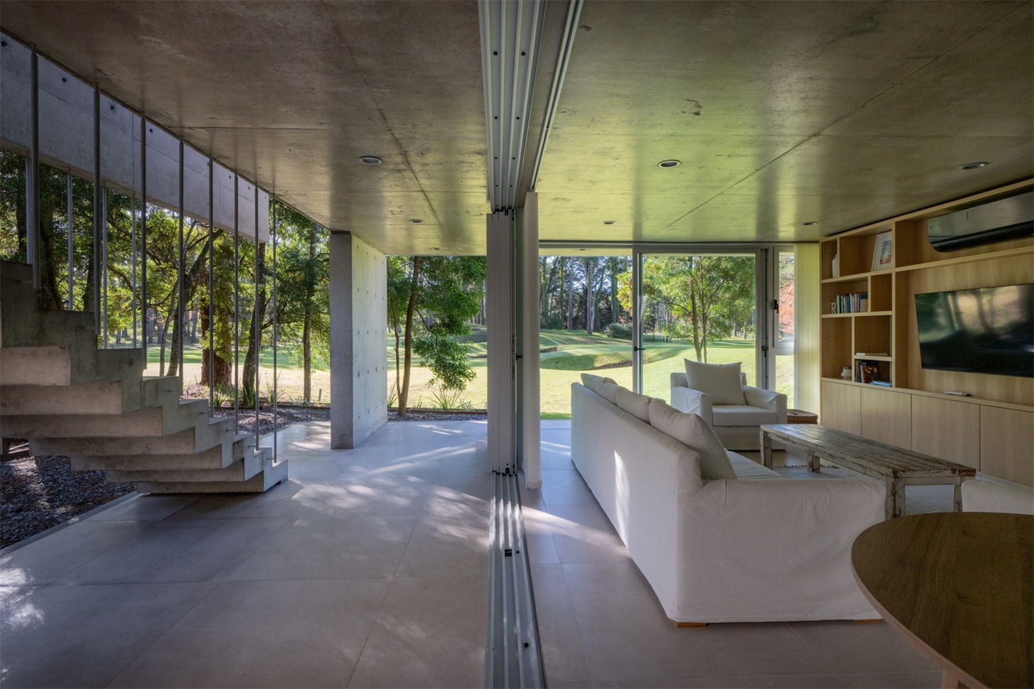 场地的显著坡度为中间层的入口设计提供了便利,使得三层空间都能完全向后方敞开,模糊了住宅与高尔夫球场延展区域之间的边界。为满足功能需求,住宅朝南一侧较为封闭,而卧室则朝向朝阳的方向,并最大化向北和向西的扩展空间。