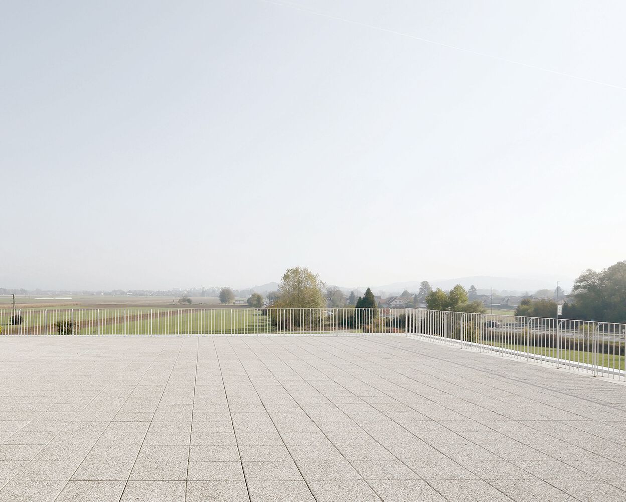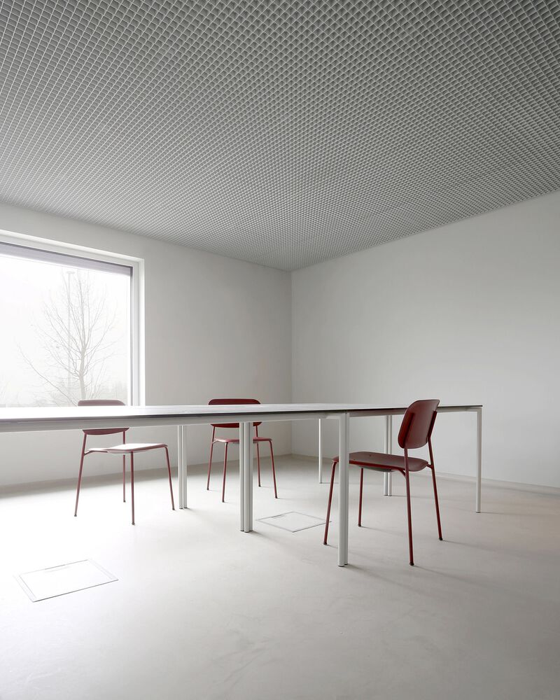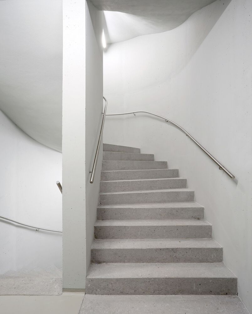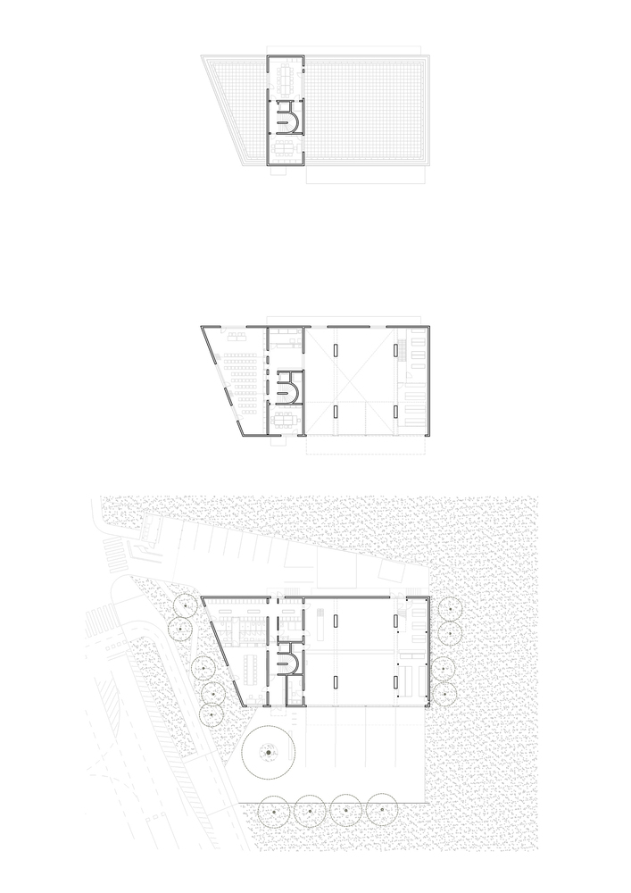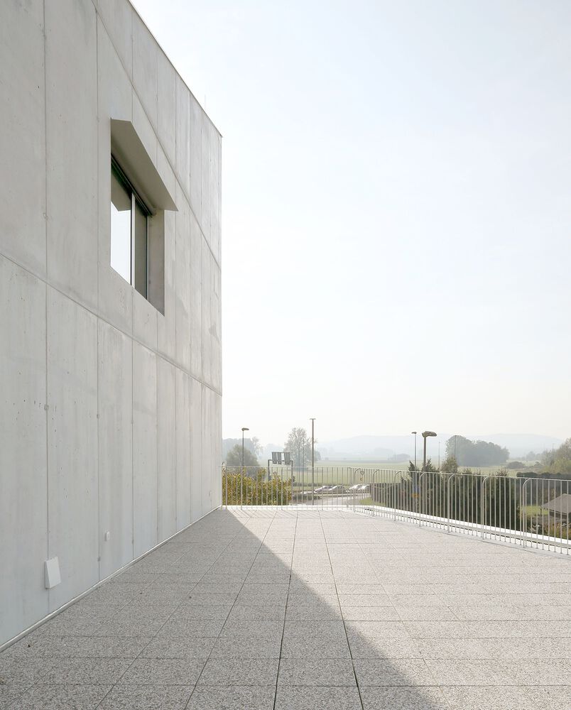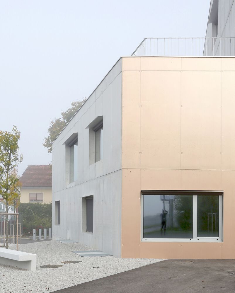 入口以裸露混凝土悬挑结构为标识,大面积窗洞将建筑与社区相连,引入对周边自然景观的视野。建筑前的开阔空间划分为消防车庭院与入口广场,广场内设有菩提树和长椅。