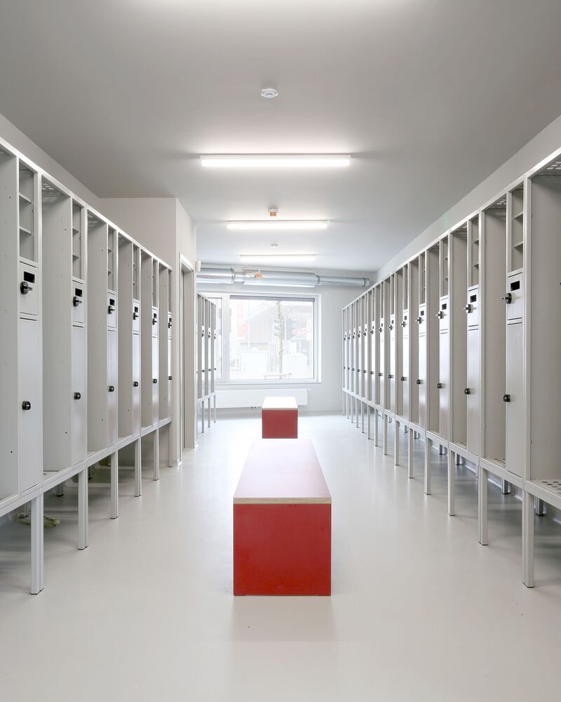 材料选择贴合功能需求,注重耐用性:带悬挑的铝窗、热浸镀锌栏杆,以及兼具结构与外墙功能的裸露混凝土。南侧入口立面以色彩强调视觉焦点。