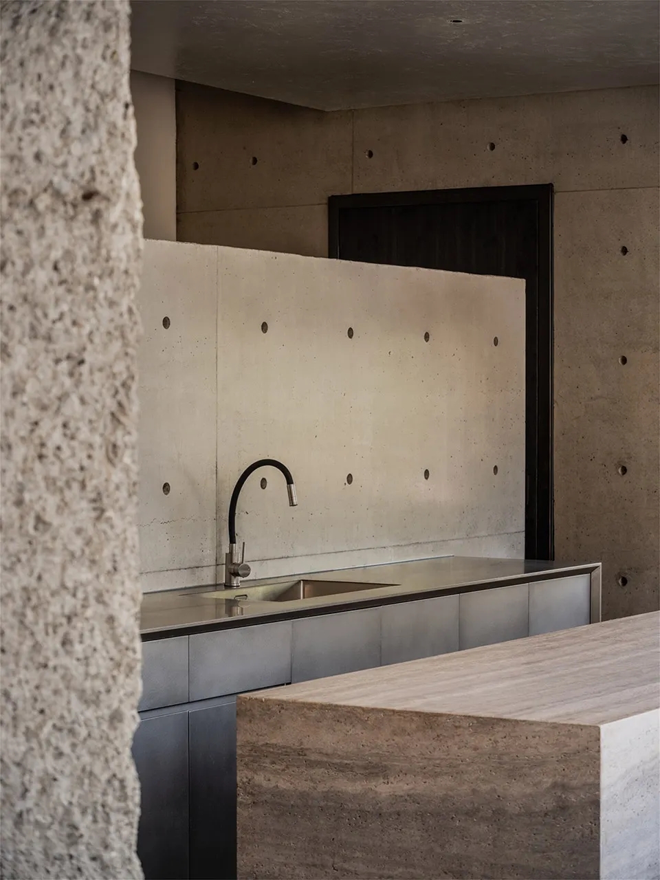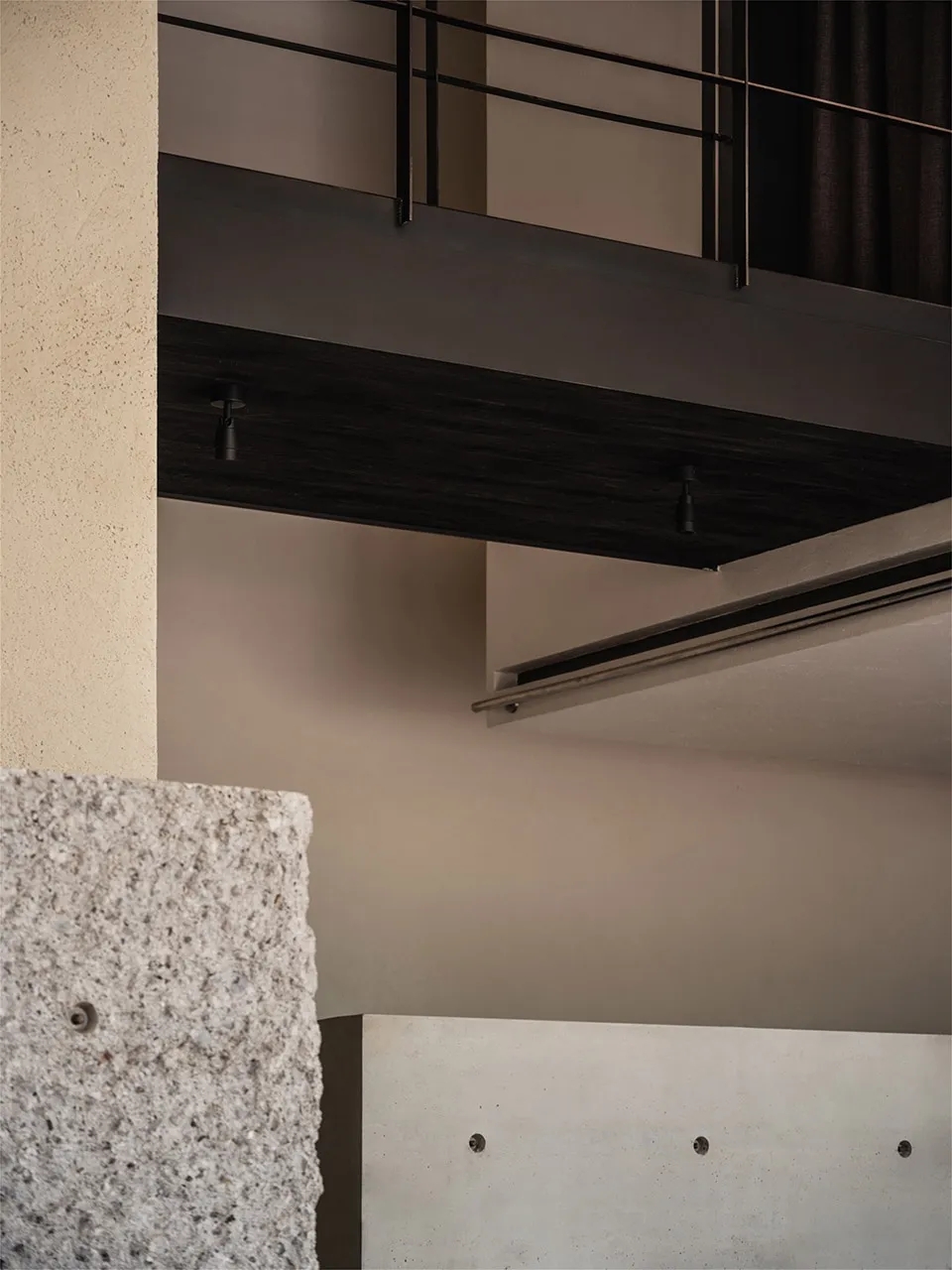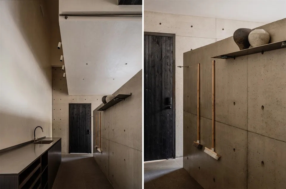 定制金属单臂射灯安静地垂落,投下温润的光晕。墙面的肌理温柔地与坚硬交错,仿佛在低语:“这里的每一处,都是留白,也是表达。”好的空间一定可以蕴含巧思,为混凝土墙脱模后留下的孔洞赋予新生的力量。无需刻意为之,随意的状态下,为日常的使用提供便利。