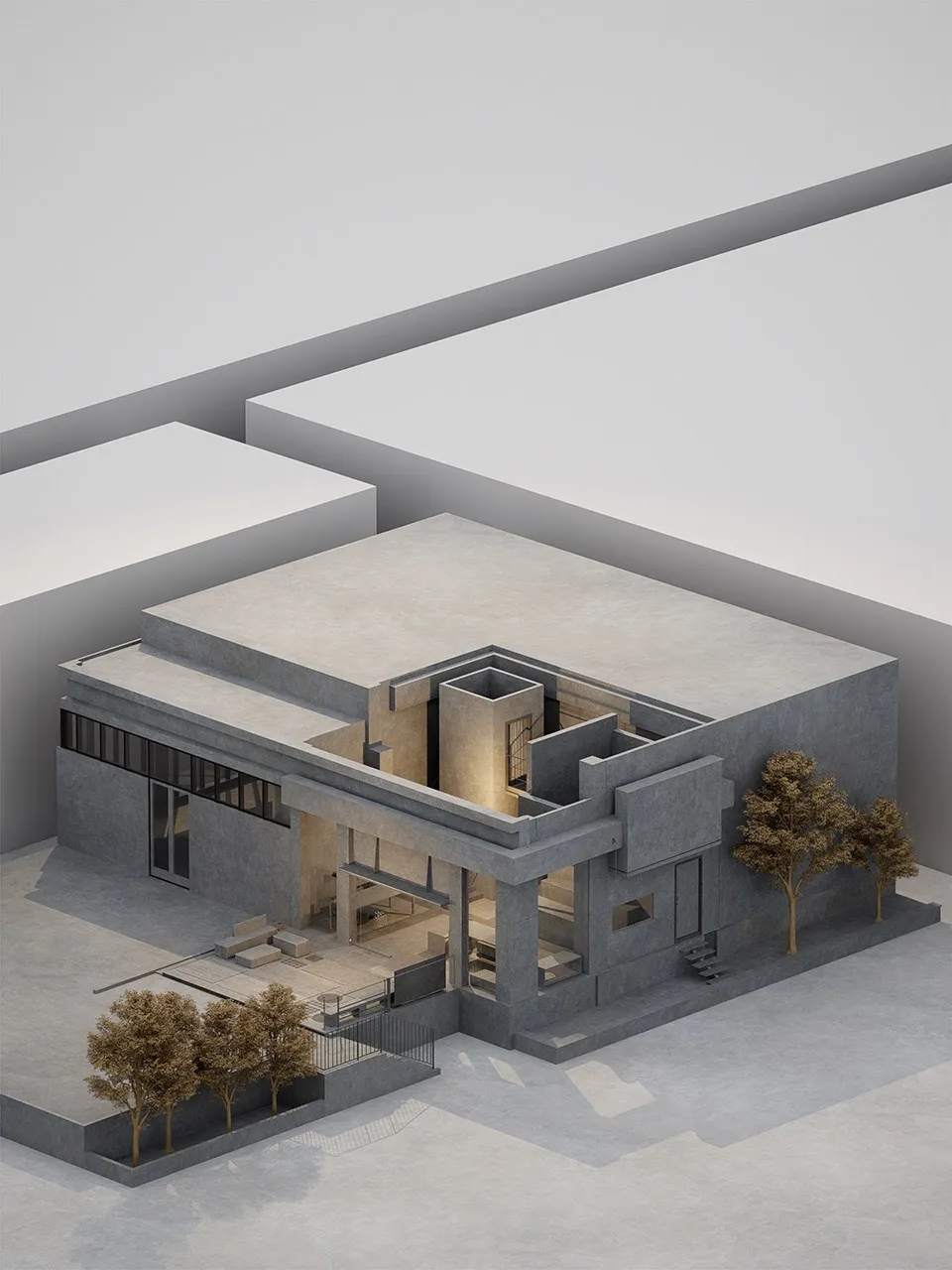 整个空间,如同一场理性的方块拼贴。每一块体块既是结构的表达,也成为空间的界定与引导,它们在交错中围合,在张力中释放,在理性秩序下自由生长,保留着山城独有的复杂性与生命力。