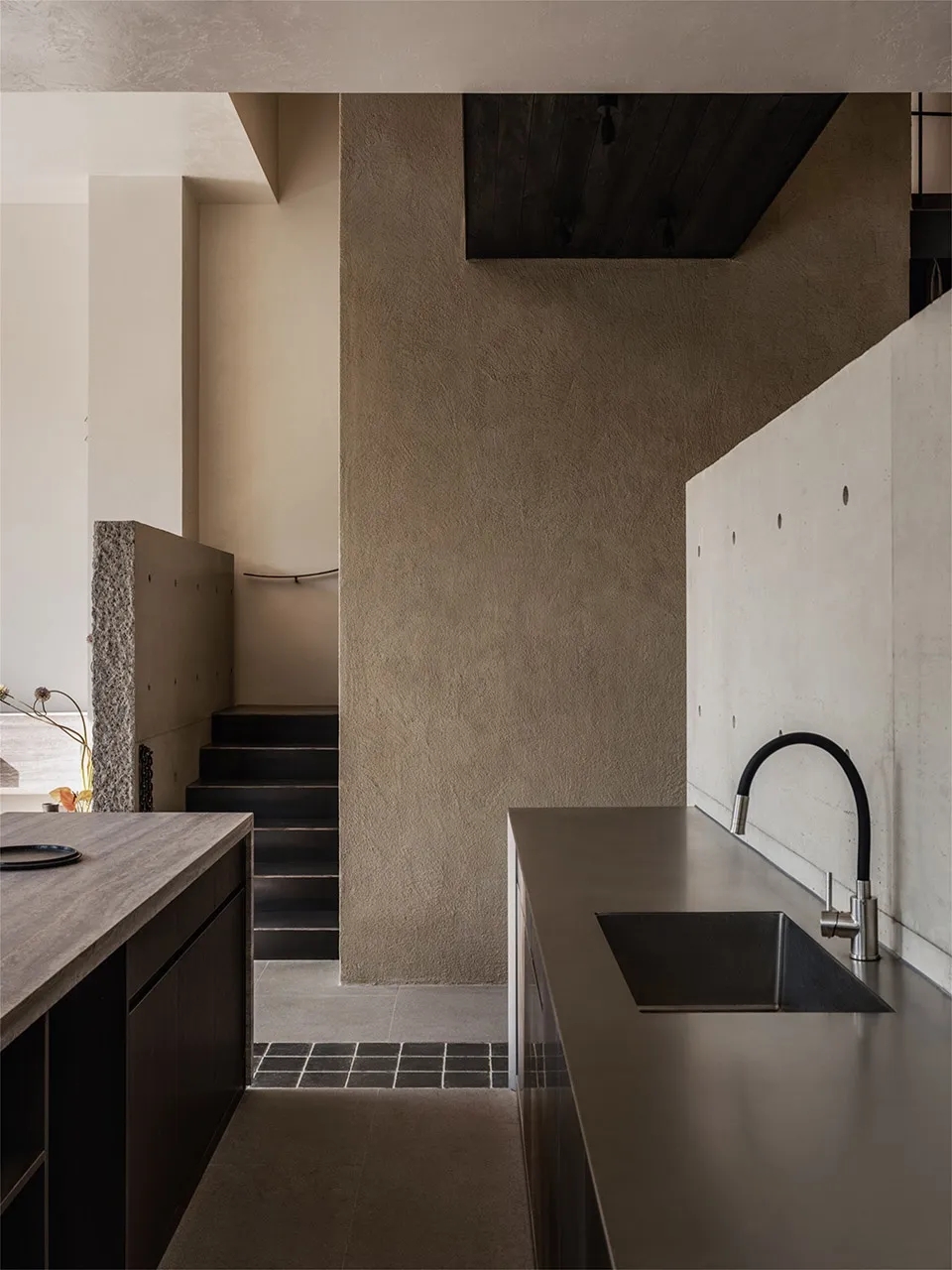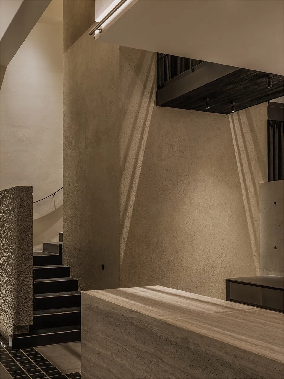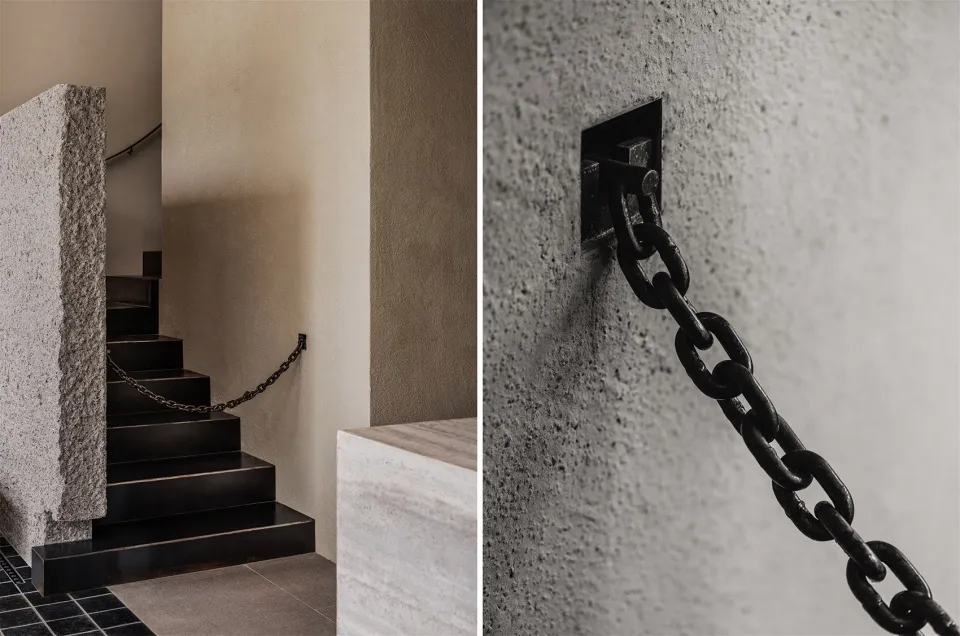 综合冷藏和仓储功能的核心筒安静地伫立,如山之基石,支撑着整个场域,步道绕山而上,弯曲的扶手如云朵般轻盈萦绕。钢制的深色阶梯是通往上楼的路径,只需一条铁链轻轻拦住,悬浮于空气之中,不做绝对的阻隔,而是暗示着一步之遥的界限。它既坚固又随意,在无声之中,与空间的冷静形成微妙的张力。