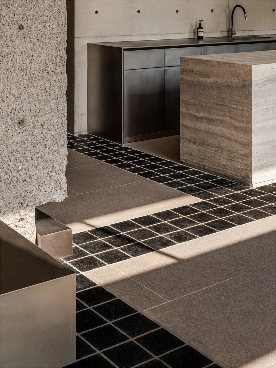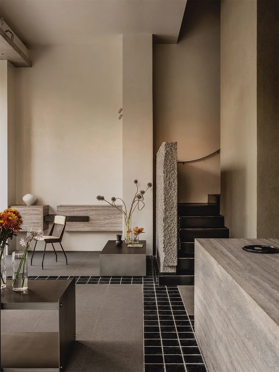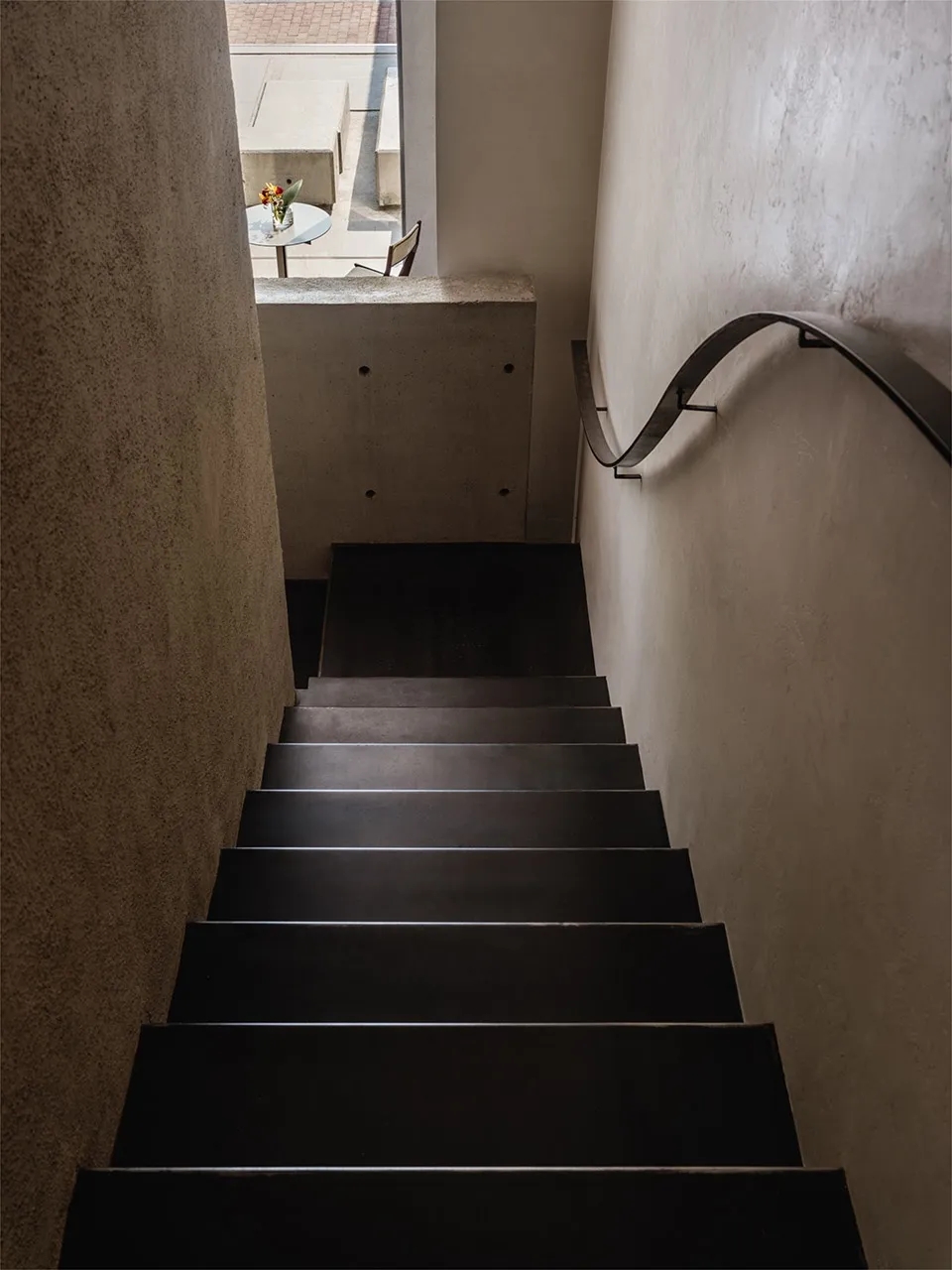 综合冷藏和仓储功能的核心筒安静地伫立,如山之基石,支撑着整个场域,步道绕山而上,弯曲的扶手如云朵般轻盈萦绕。钢制的深色阶梯是通往上楼的路径,只需一条铁链轻轻拦住,悬浮于空气之中,不做绝对的阻隔,而是暗示着一步之遥的界限。它既坚固又随意,在无声之中,与空间的冷静形成微妙的张力。