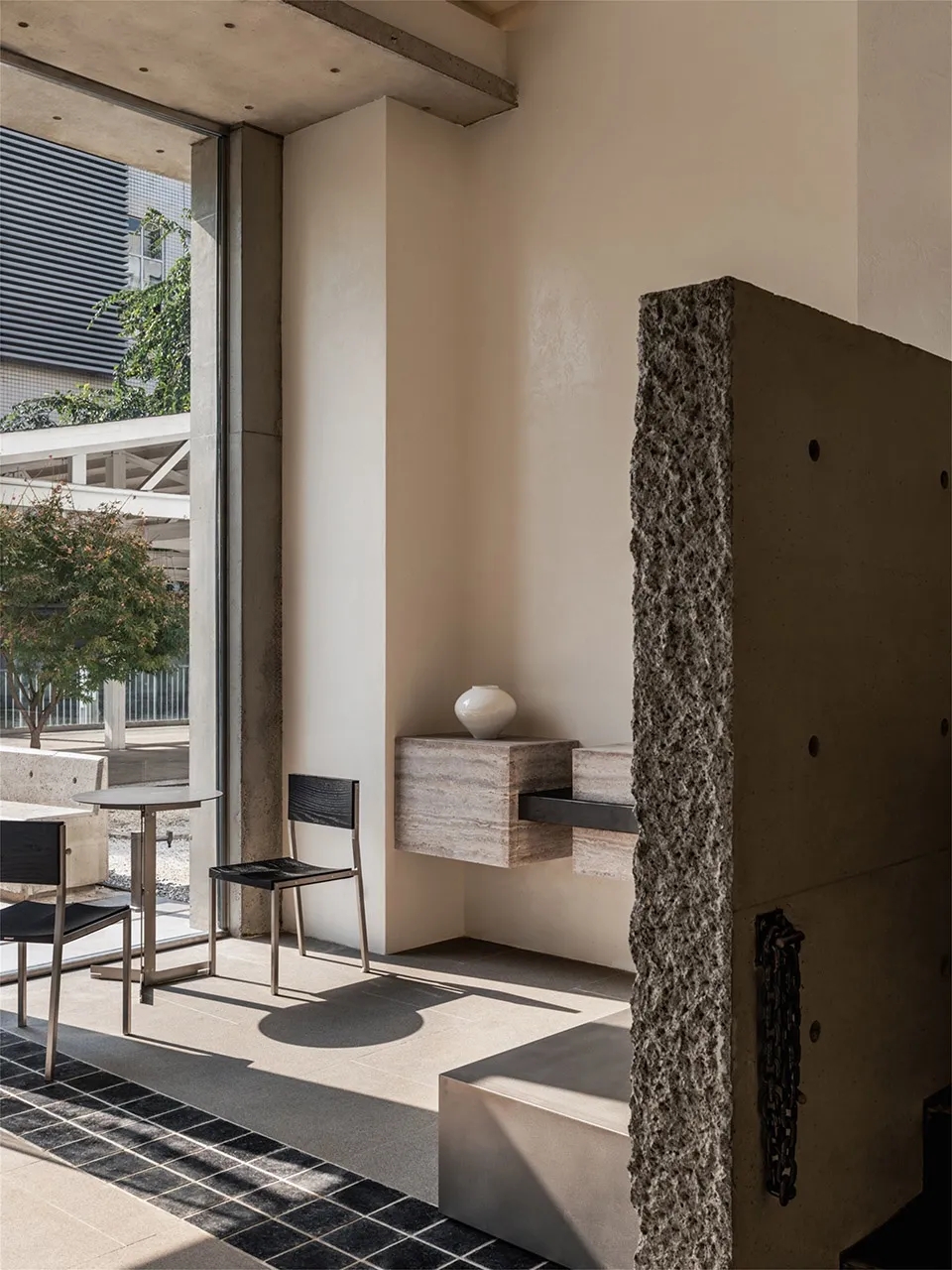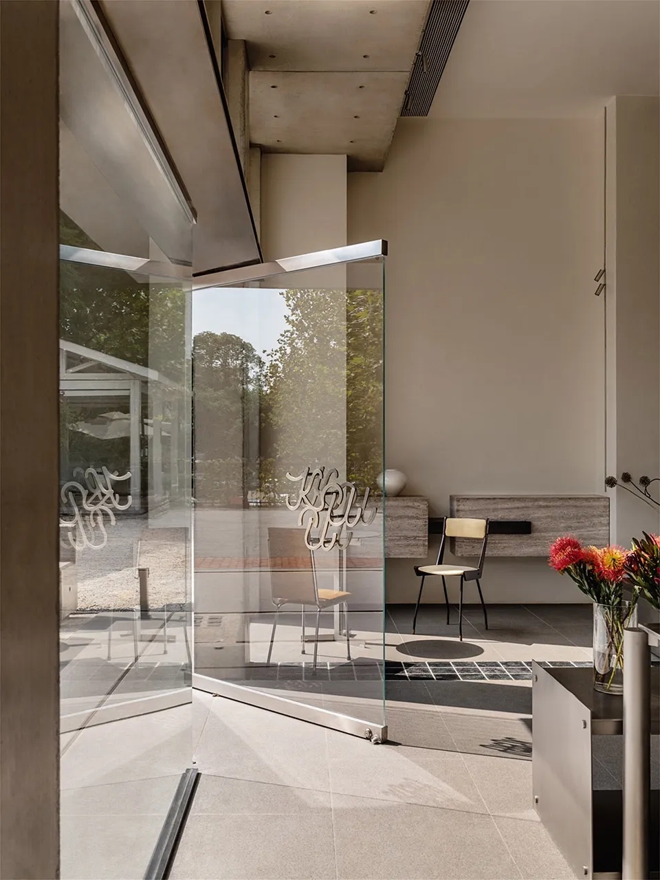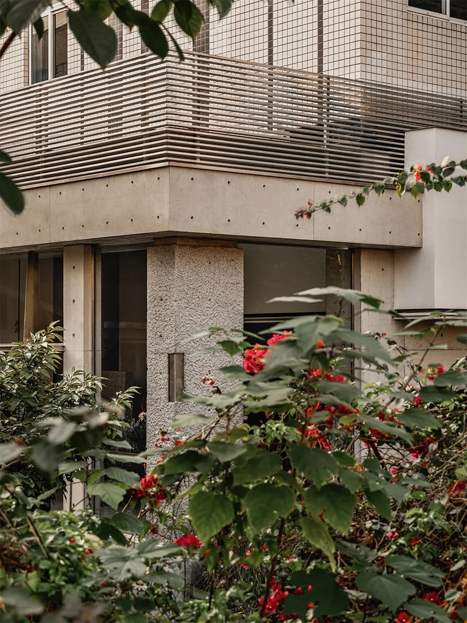 通透的玻璃幕墙,如湖面般沉静,映照着花的影子,也倒映着远方的天空。它隔离了内外,却不阻断视线,让空间保持通透,使阳光成为无形的构造,赋予混凝土以轻盈之感。在这方寸之间,流动的不止是光,还有风的低语、时间的痕迹。